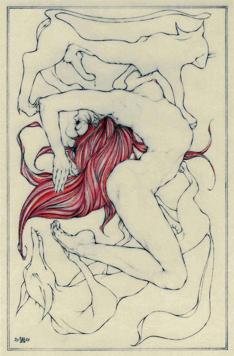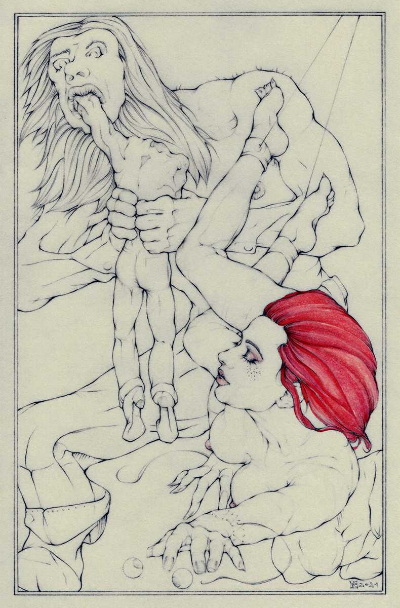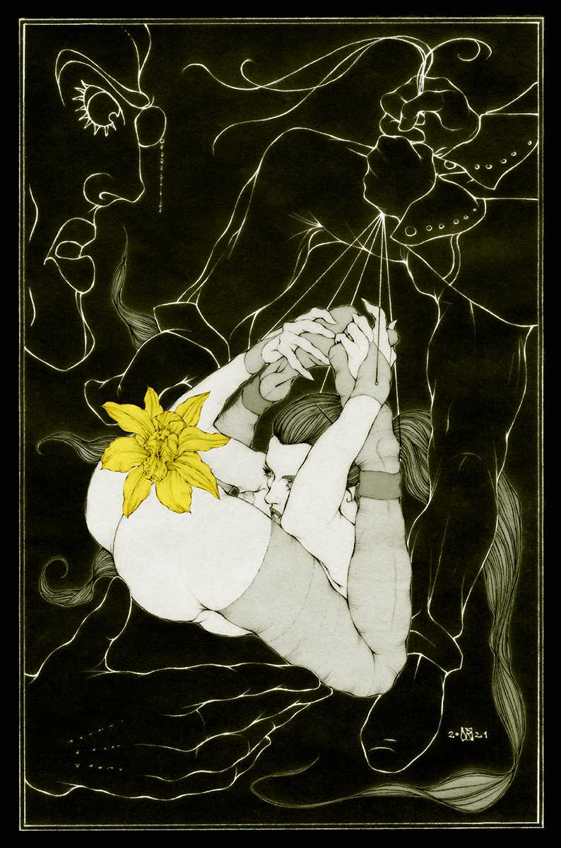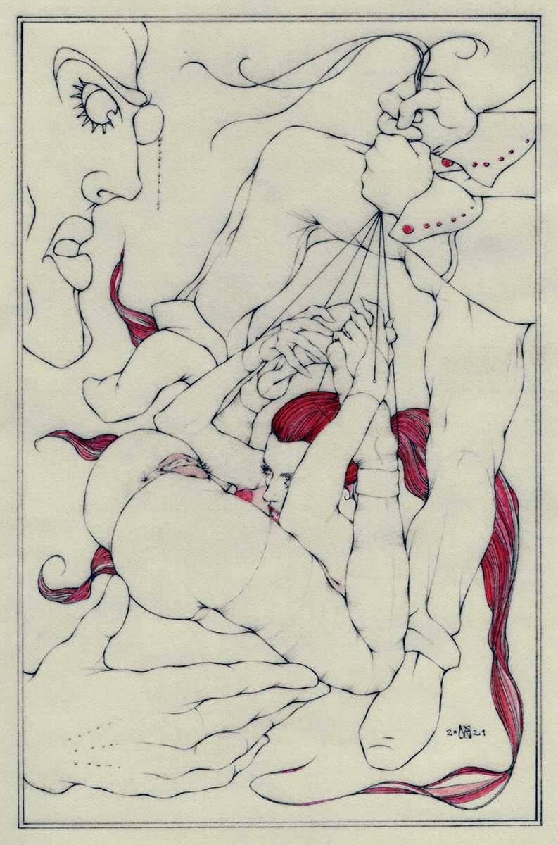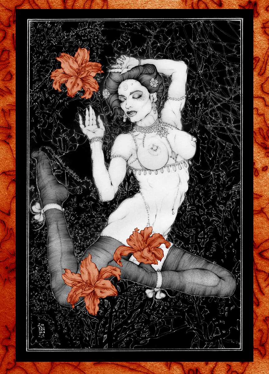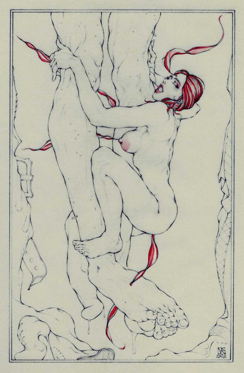 Thus for this reincarnation of Querida a new approach was agreed. Carlos alone would spell out the story of the sufferings and self-empowerment of the female puppet, ironing out the creases and unifying the narrator’s voice. The result is a perfectly balanced piece of work, a marriage of fantastic literature and eroticism. To match the new text, Jan van Rijn produced a new set of illustrations, based on the earlier version but introducing much more colour and variety.