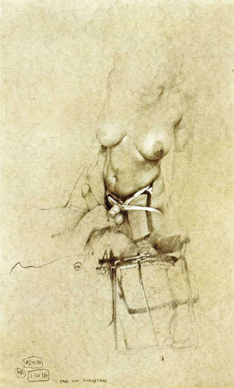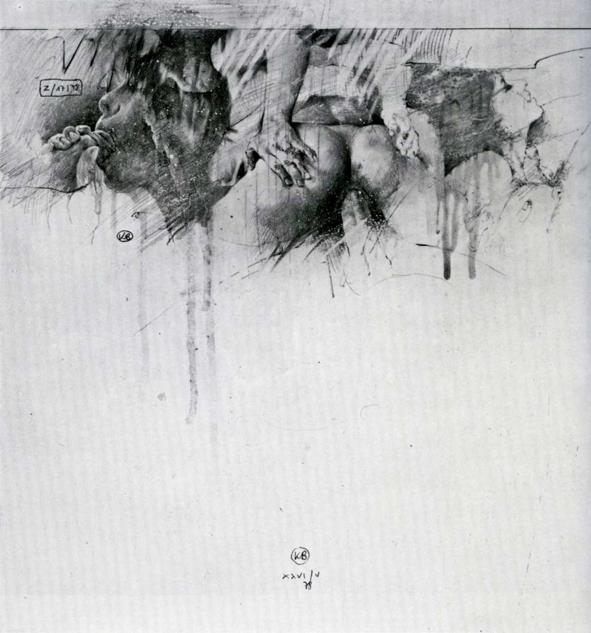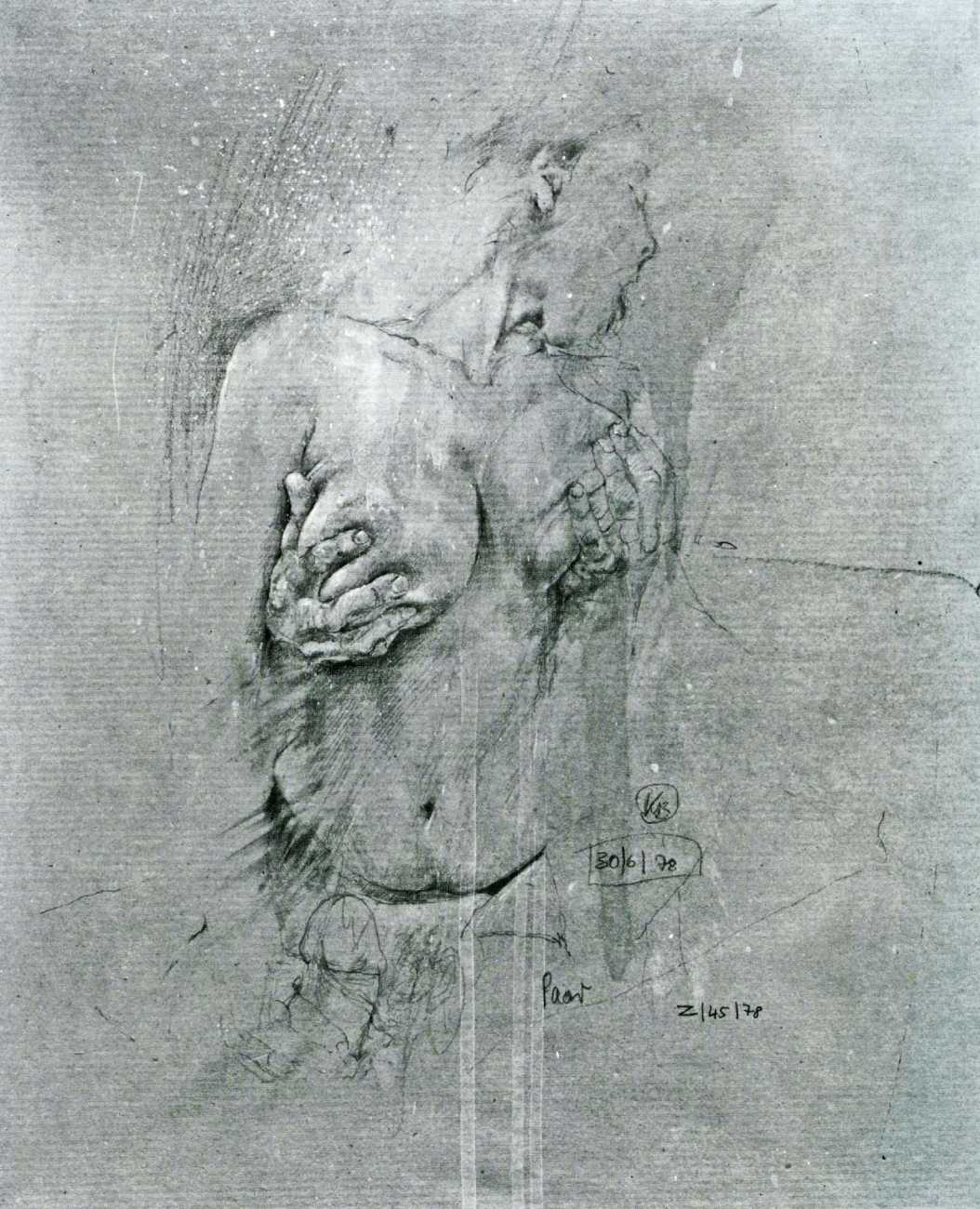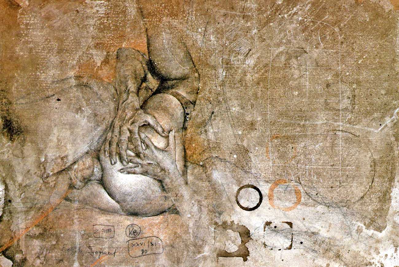 In the end ‘la petite mort’ is the way by which life renews itself – at least physically. In many of these plates, limbs drawn with astonishing verisimilitude intertwine in a giddying array of different postures. And Böttger was put on earth to celebrate the endless erotic parallels between sex and death. There is in these drawings a profound understanding that life is not well-ordered and rational. It is chaotic, passionate, unreasonable and spontaneous. This is particularly evident in the artist’s attitude towards his own incomparable technique. He is arguably one of the finest illusionistic draftsmen of this century. Although he could draw anything he wanted, as he wanted it and with great ease, Böttger also seems to have been at pains to discount his own facility. On a number of these sheets he has marked and rubbed, cut and torn, stained and scored his drawings, as if he were trying to eviscerate the wonderful products of his imagination. He was both iconographer and iconoclast; at one and the same time both proposer and disposer. At times he even goes beyond the limits of artistry to become, Shiva-like, an exterminating deity.