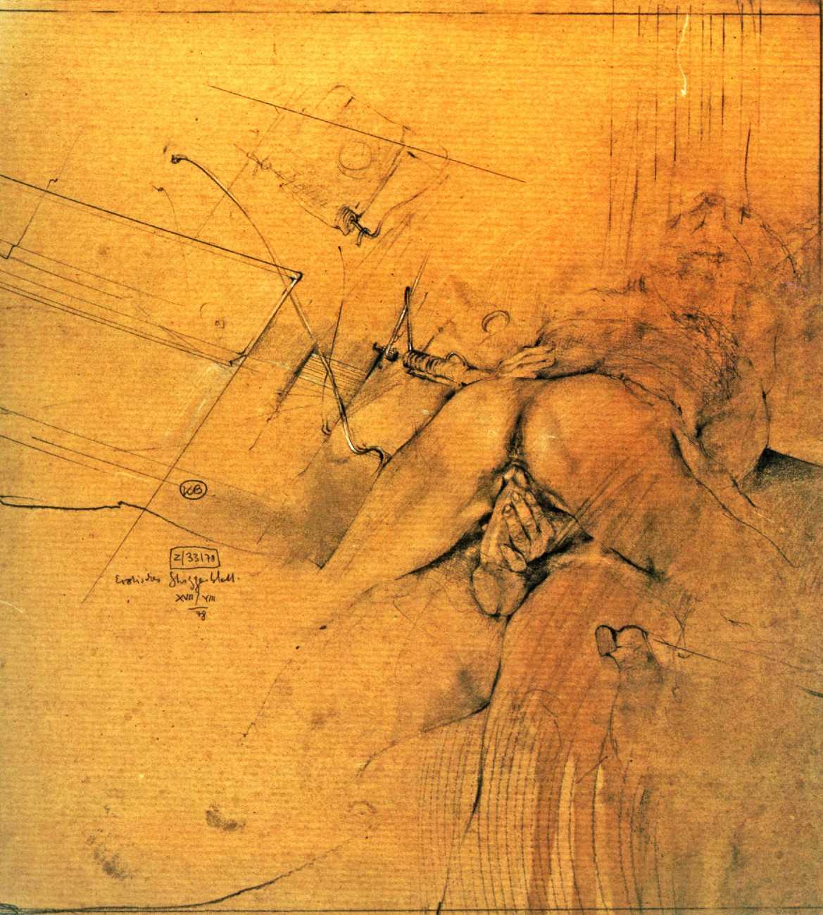 His choice of subject matter appears to have been made with the conviction that sex is part of a universal drama, in which desire is the foreplay to ‘the small death’ and Eros, the life-force, is inextricably linked to Thanatos, the realm of Death. The one complements the other. The ripeness of the lusty, splendid lovers is all too close to decay – symbolised, for example, by desiccated apples or sprung mouse-traps. The consummation of desire is a miniature of that complete obliteration which is death itself. This is often alluded to in the drawings by the inclusion of a mouse-trap, a contraption that, while it offers a tasty morsel too desirable to resist, proves lethal.