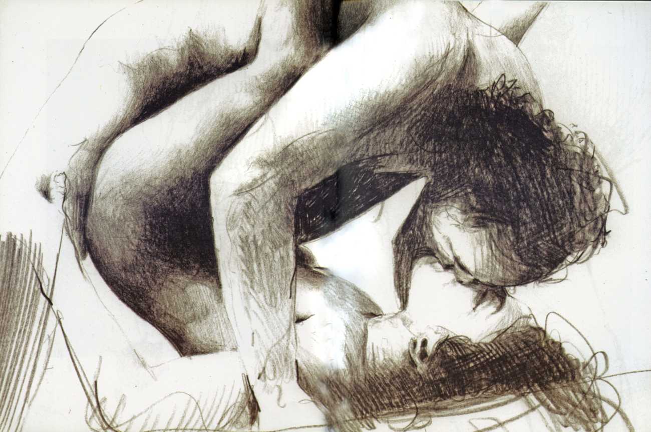 From these dark sheets emerge glowing images of the writhing limbs of a well-built woman and an amply-endowed man in the throes of the most ecstatic copulation. This, seen at such close quarters as often to preclude a sight of their faces, makes their subject matter more akin to that of the continental top shelf magazine or even the hard-core porn movie.