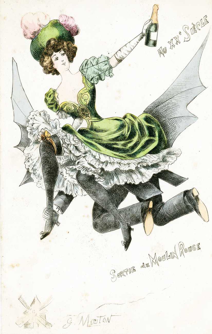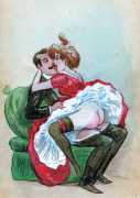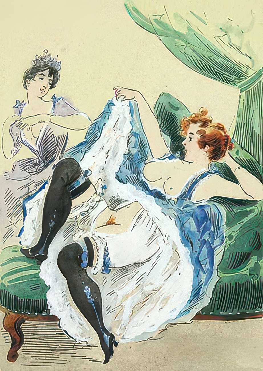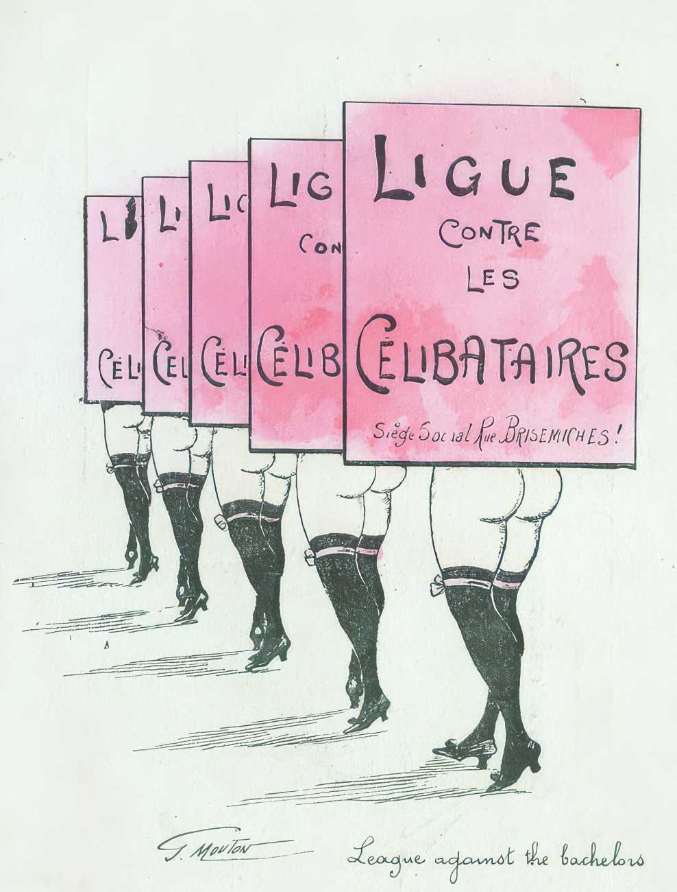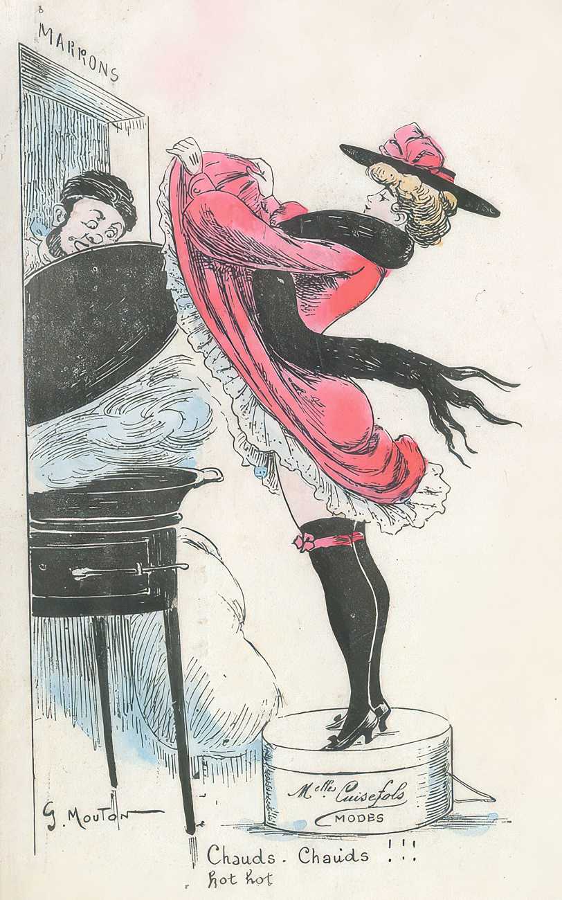 During the early years of the twentieth century many risqué erotic prints were sold in sets in small Parisian bookshops, often ‘sous le manteau’ or ‘under the shelf’. Most of these examples bear Mouton’s signature, some printed examples also having his trademark sheep motif, ‘mouton’ being the French word for sheep. Some have handwritten titles, and tellingly some also have (bad) English translations, suggesting that their clientele was sometimes English gentlemen taking the opportunity to acquire such rarities, unavailable at home, while visiting Gay Paree.