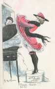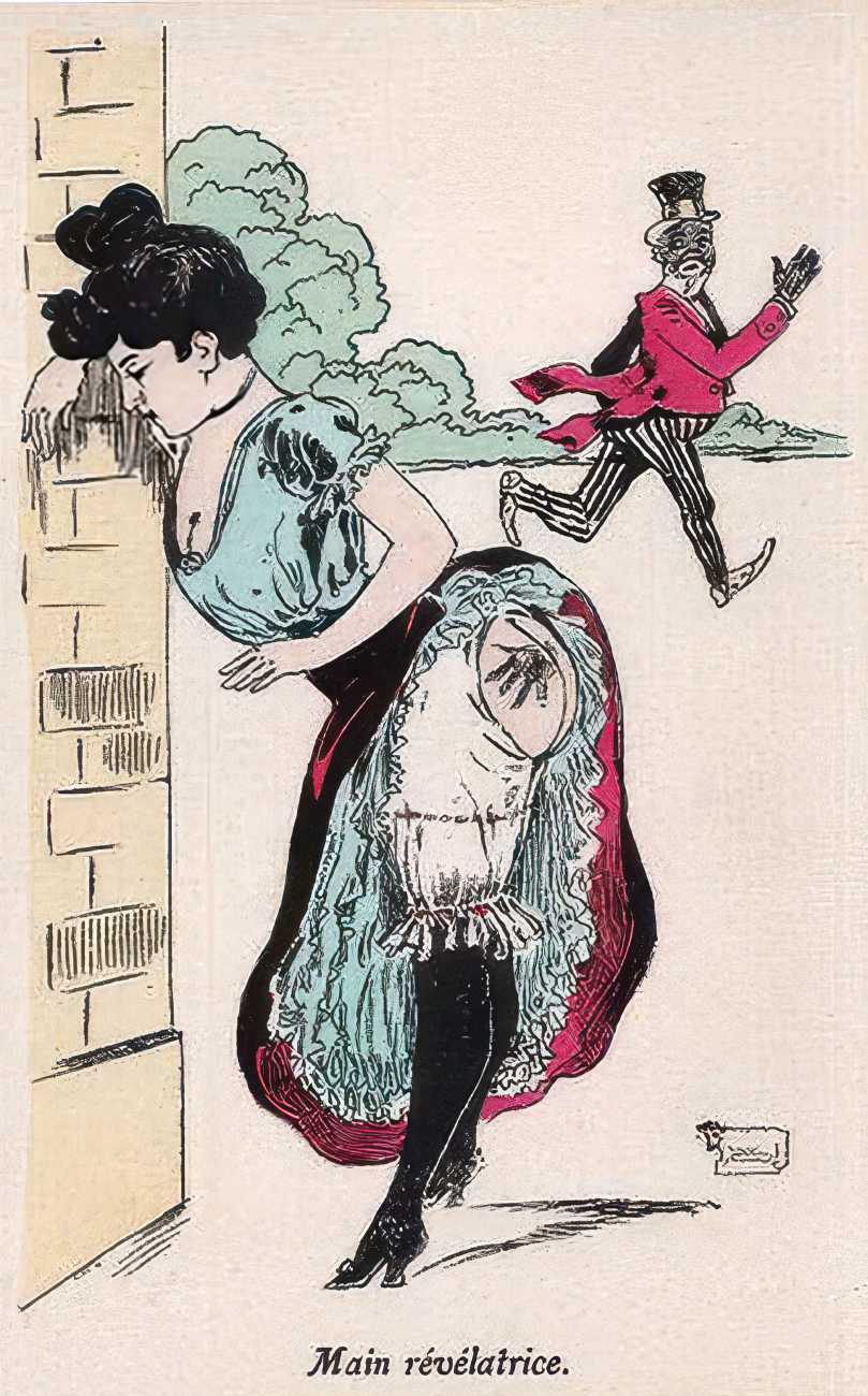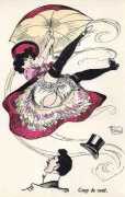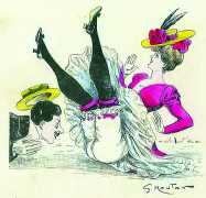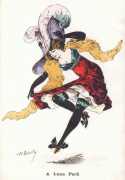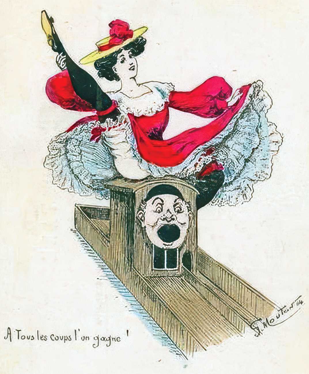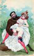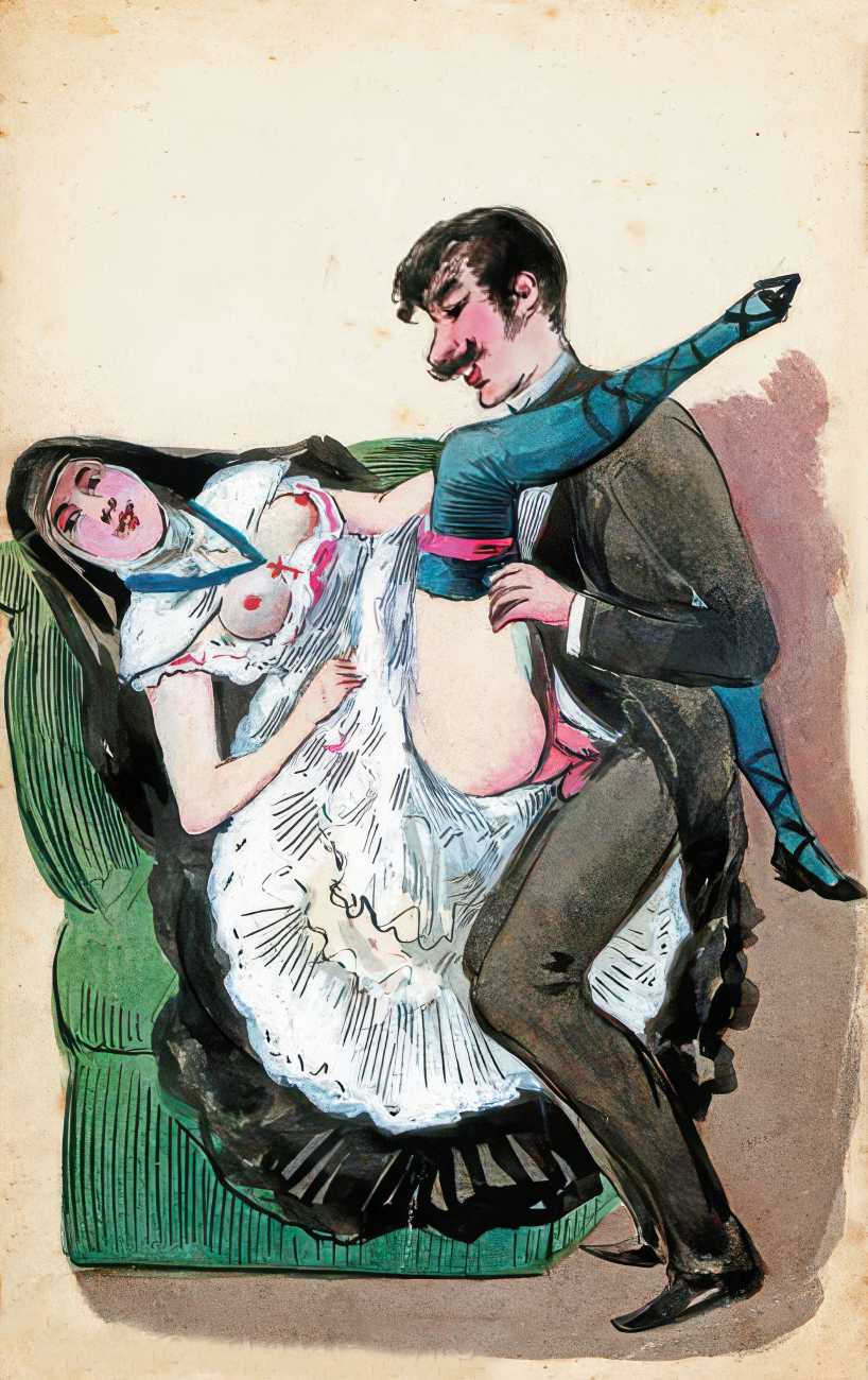 During the early years of the twentieth century many risqué erotic prints were sold in sets in small Parisian bookshops, often ‘sous le manteau’ or ‘under the shelf’. Most of these examples bear Mouton’s signature, some printed examples also having his trademark sheep motif, ‘mouton’ being the French word for sheep. Some have handwritten titles, and tellingly some also have (bad) English translations, suggesting that their clientele was sometimes English gentlemen taking the opportunity to acquire such rarities, unavailable at home, while visiting Gay Paree.