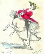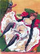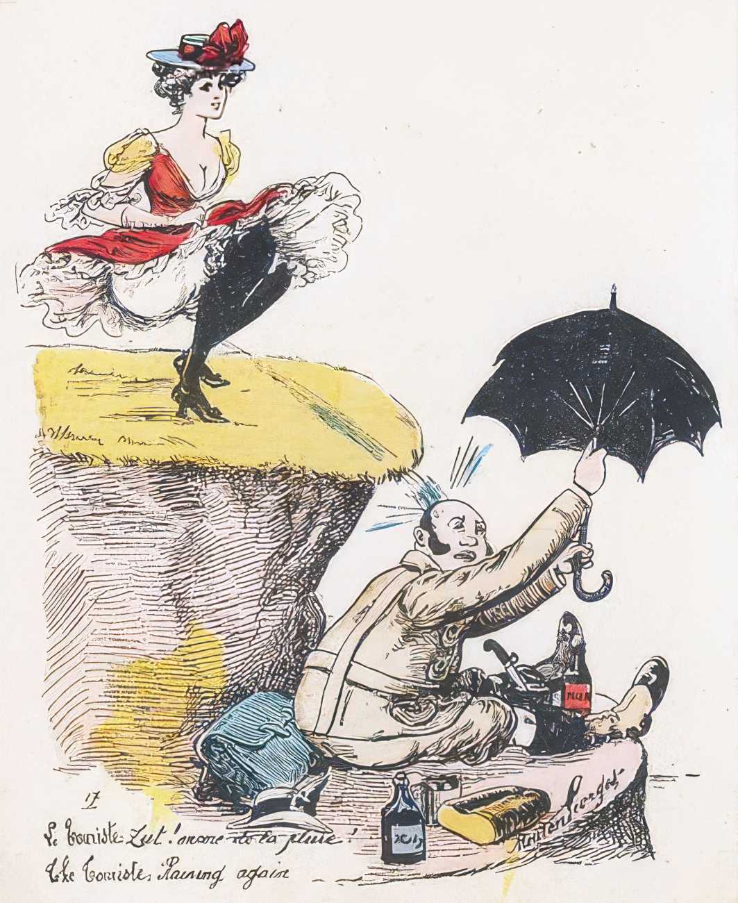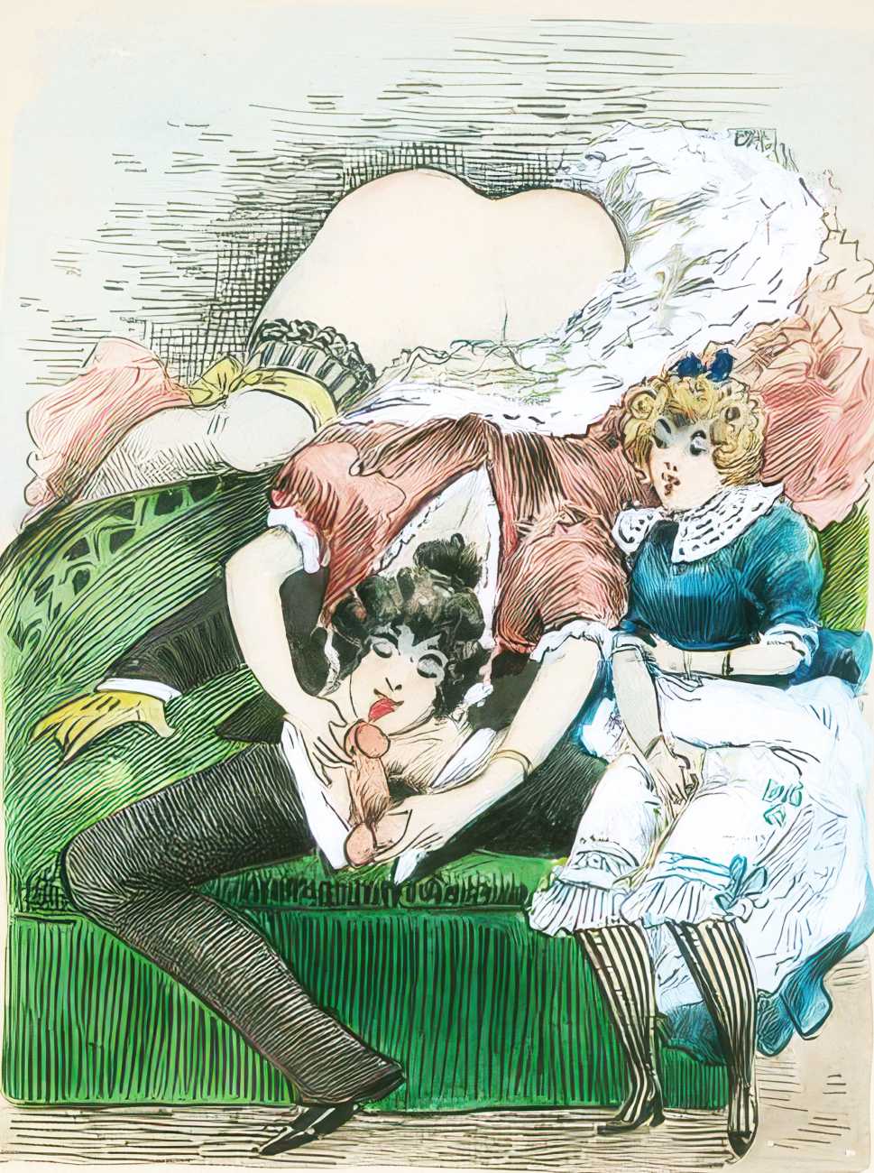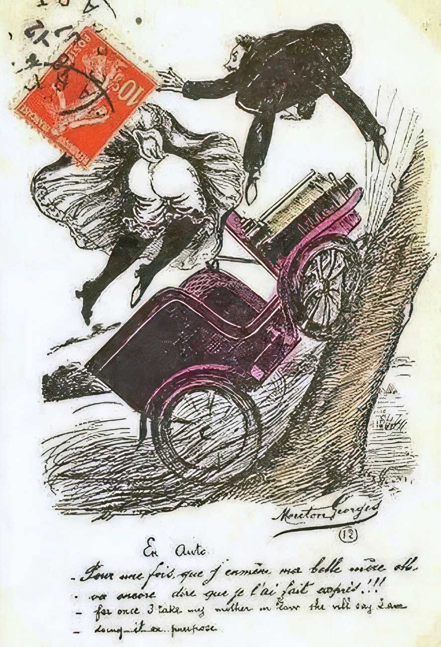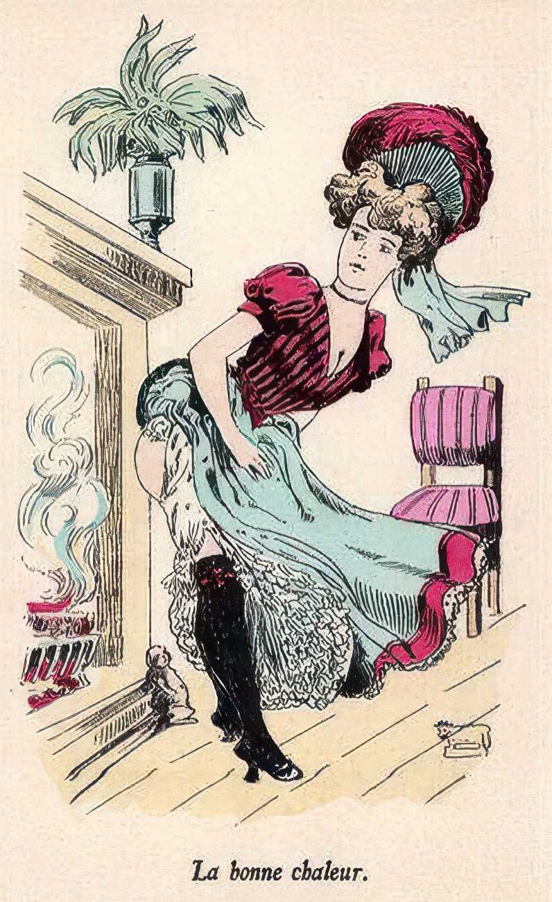 During the early years of the twentieth century many risqué erotic prints were sold in sets in small Parisian bookshops, often ‘sous le manteau’ or ‘under the shelf’. Most of these examples bear Mouton’s signature, some printed examples also having his trademark sheep motif, ‘mouton’ being the French word for sheep. Some have handwritten titles, and tellingly some also have (bad) English translations, suggesting that their clientele was sometimes English gentlemen taking the opportunity to acquire such rarities, unavailable at home, while visiting Gay Paree.