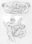 These are the drawings from Marco Zagato’s early unfinished comic book project, in which two young friends are made to compete against each other in a sort of arena, like futuristic gladiators. Zagato imagined that the two protagonists were more than friends, but in reality secretly engaged. From these early studies of the aesthetics of gay eroticism, the artist’s later work on the same theme was later to be born.