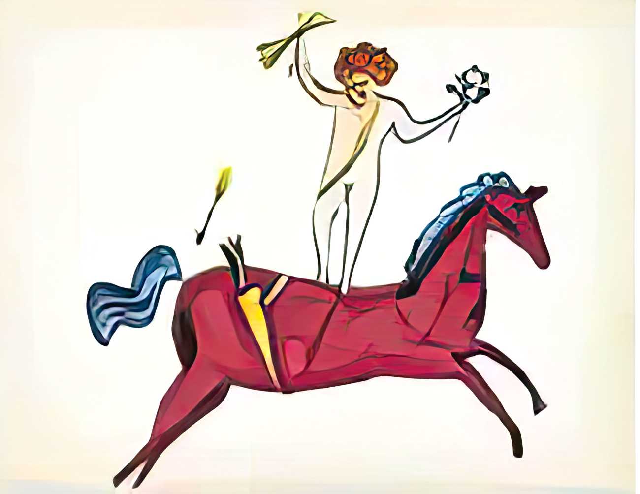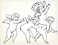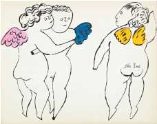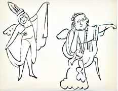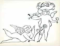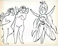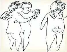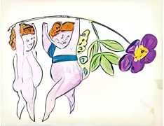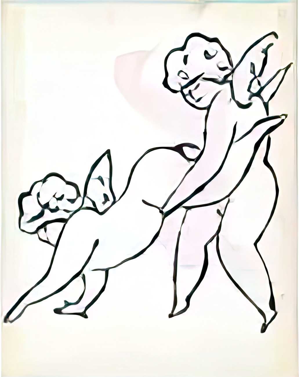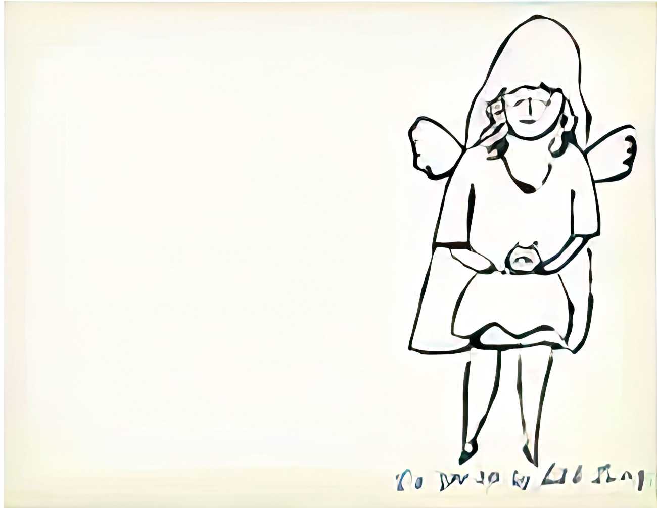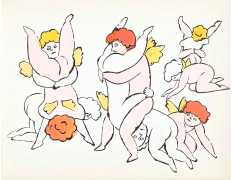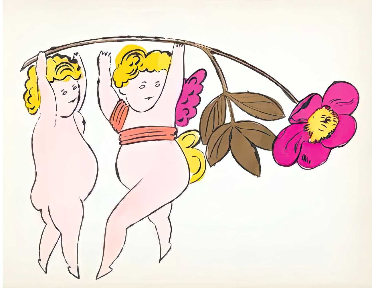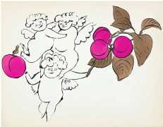 The imagery consists of playful, ethereal figures – fairies, putti, mythic creatures – drawn in Warhol’s distinctive line technique. This method, which allowed him to transfer inked drawings with slight irregularities, gives the figures a fragile, trembling quality. The images feel provisional and intimate, closer to doodles or marginalia than to finished fine art. Pastel colouring, applied sparingly and individually to some of the images, enhances the sense of gentleness and emotional vulnerability.
