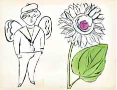 Warhol’s 1956 series In the Bottom of My Garden occupies a revealing position in his early career, before the full emergence of the pop aesthetic that would make him famous. Produced while Warhol was still closely associated with commercial illustration, the book is a handmade, limited-edition volume combining whimsical line drawings. Its title, borrowed from a Victorian rhyme, signals a retreat into fantasy, delicacy and private reverie.