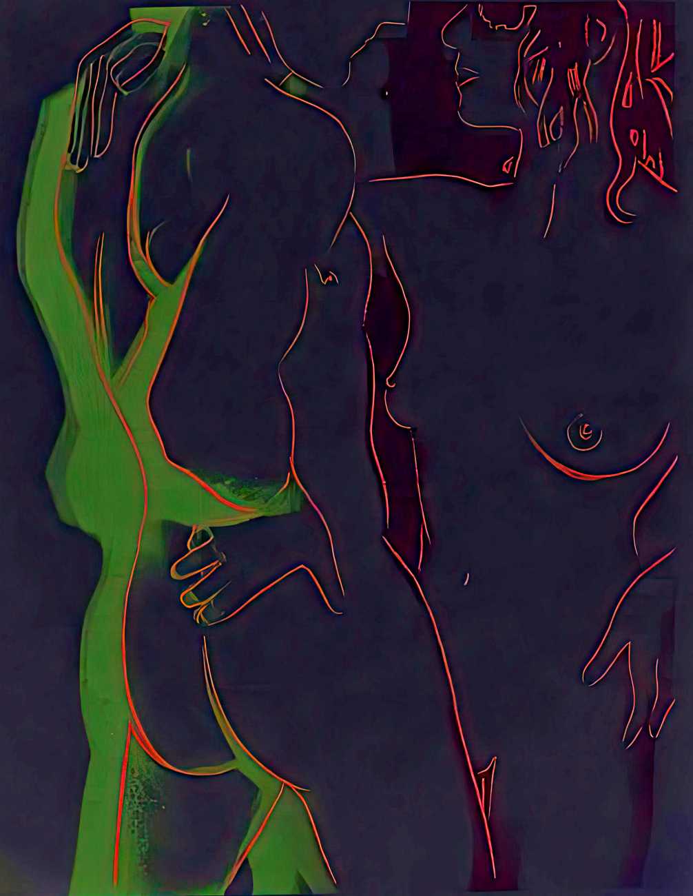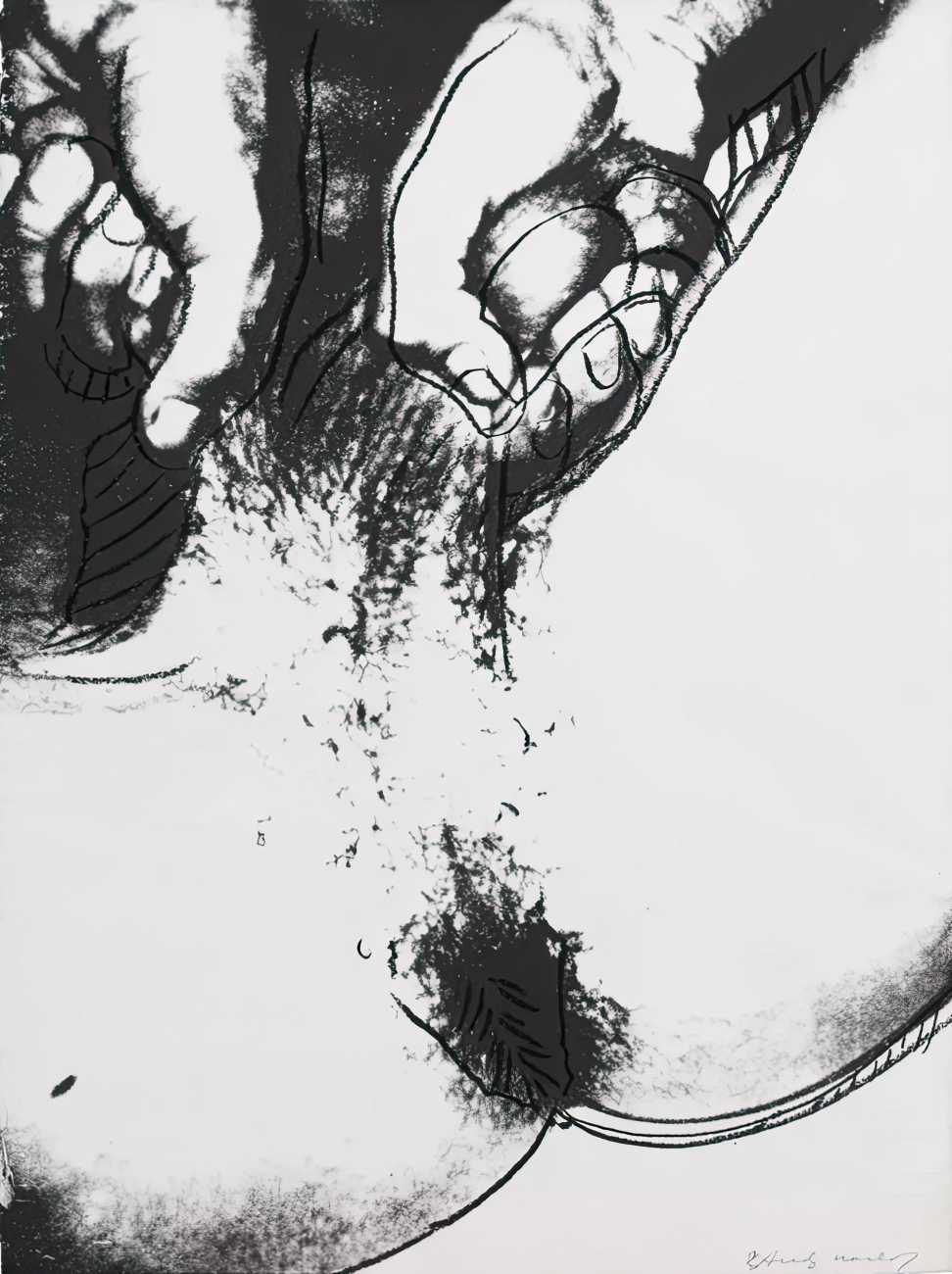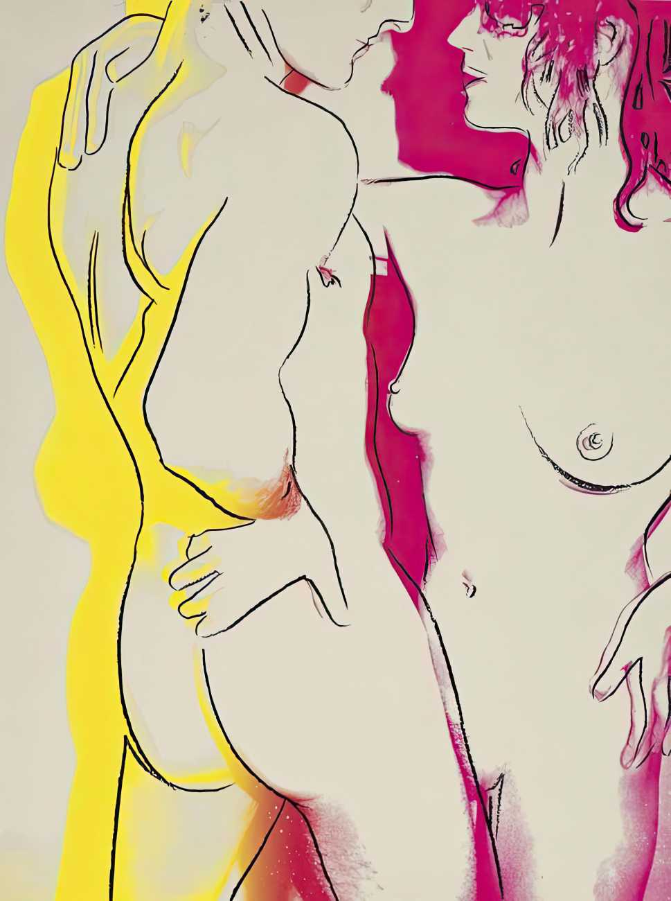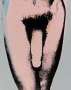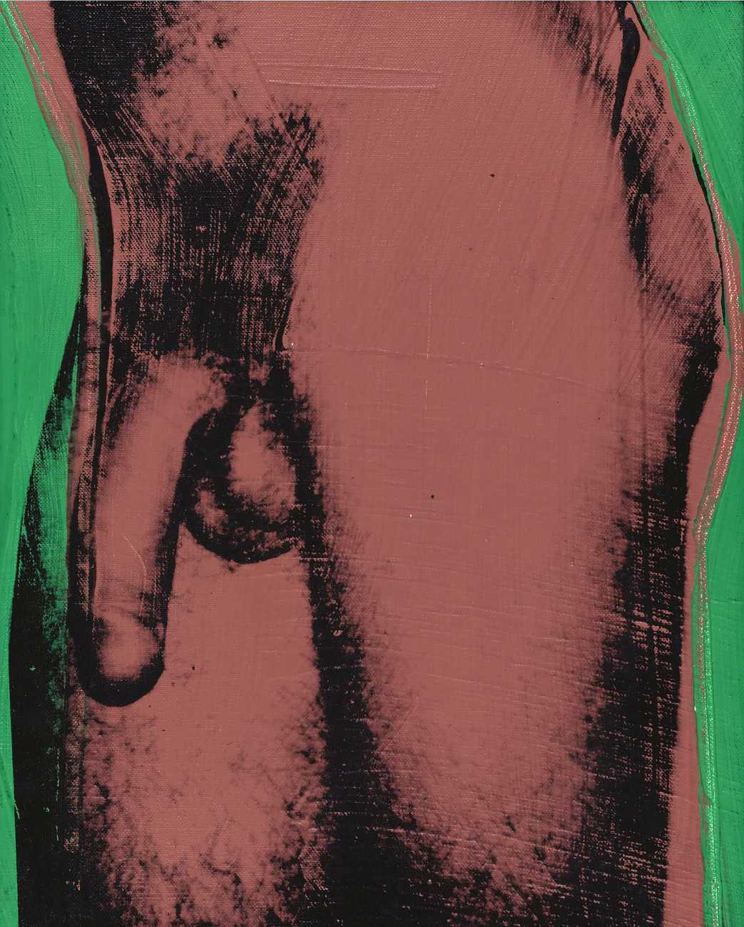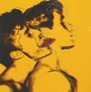 From the mid-1970s Warhol turned to silkscreen printing as a way of creating strong, colourful images of bodies pared down to minimal shapes. Many of these works, usually created in linked series with a variety of colour treatments, were controversial, raw, and overt in their eroticism. He often used polaroid photographs and film as references, blurring the line between voyeurism, documentation and art.