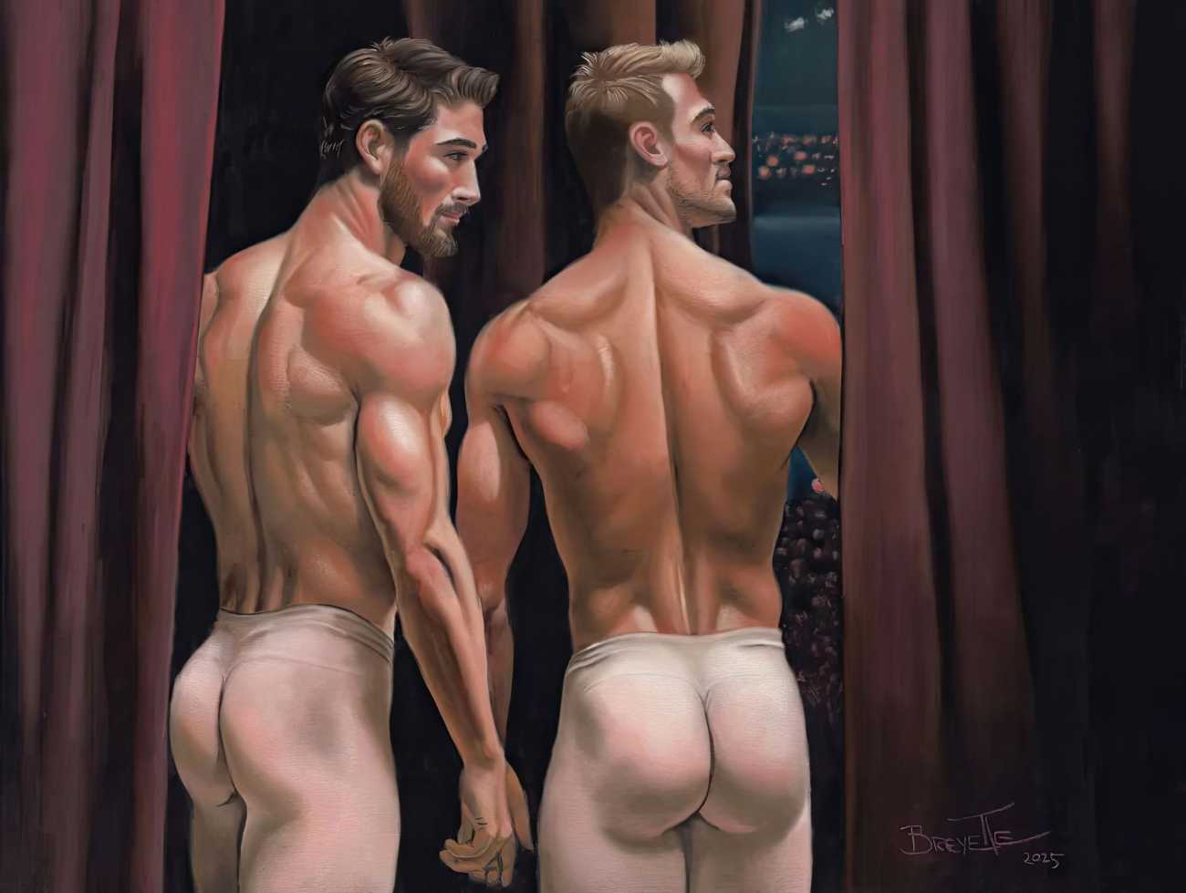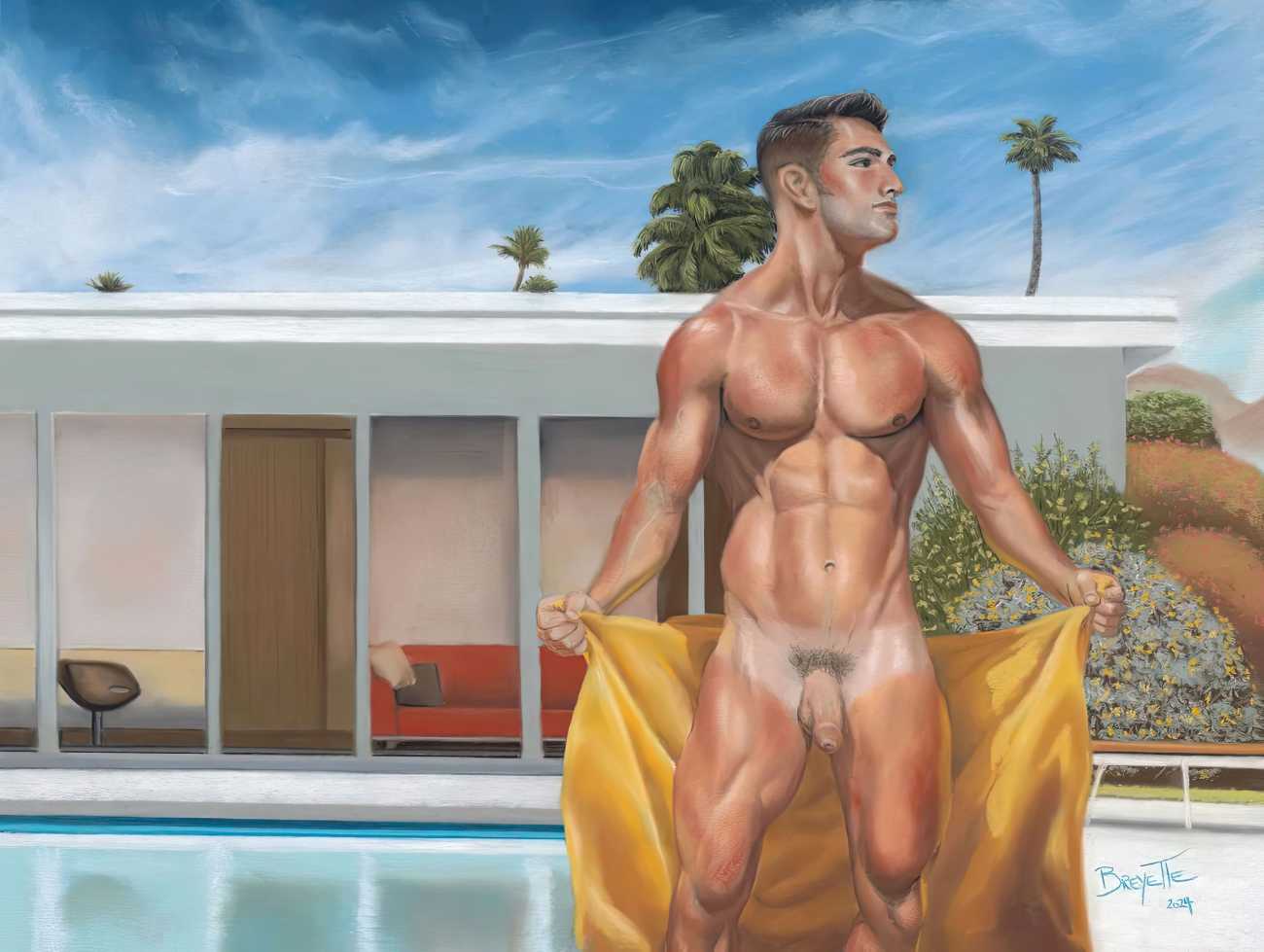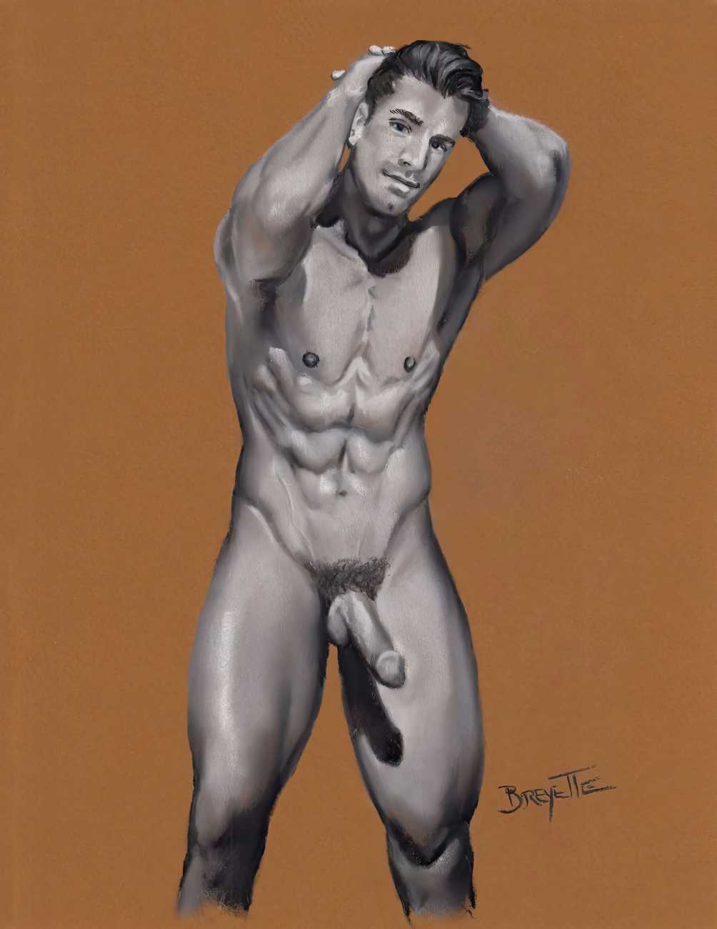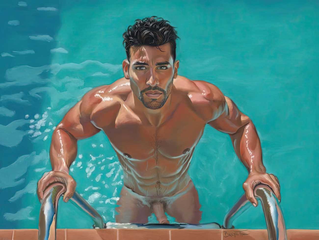 Michael Breyette’s work occupies a distinctive niche within contemporary male figurative art, bridging the personal and the universal through its unabashed celebration of the male body. His choice of soft pastels lends his work a tactile warmth that immediately sets it apart from more clinical and photorealistic approaches, allowing smooth transitions of tone and sensual surface. His figures retain a painterly softness – musculature and light are suggested rather than rigidly defined, inviting viewers into an intimate relationship with his subjects.