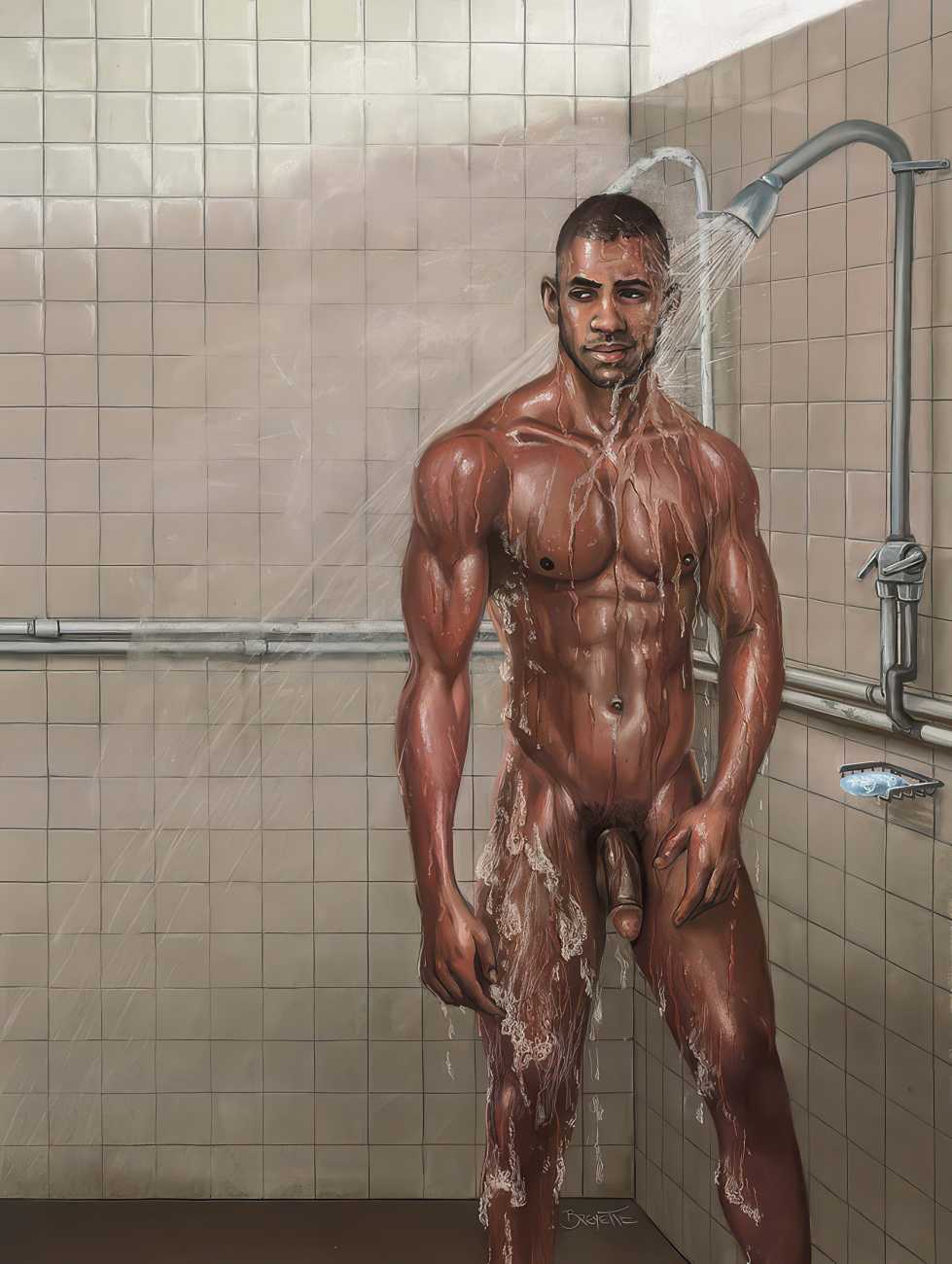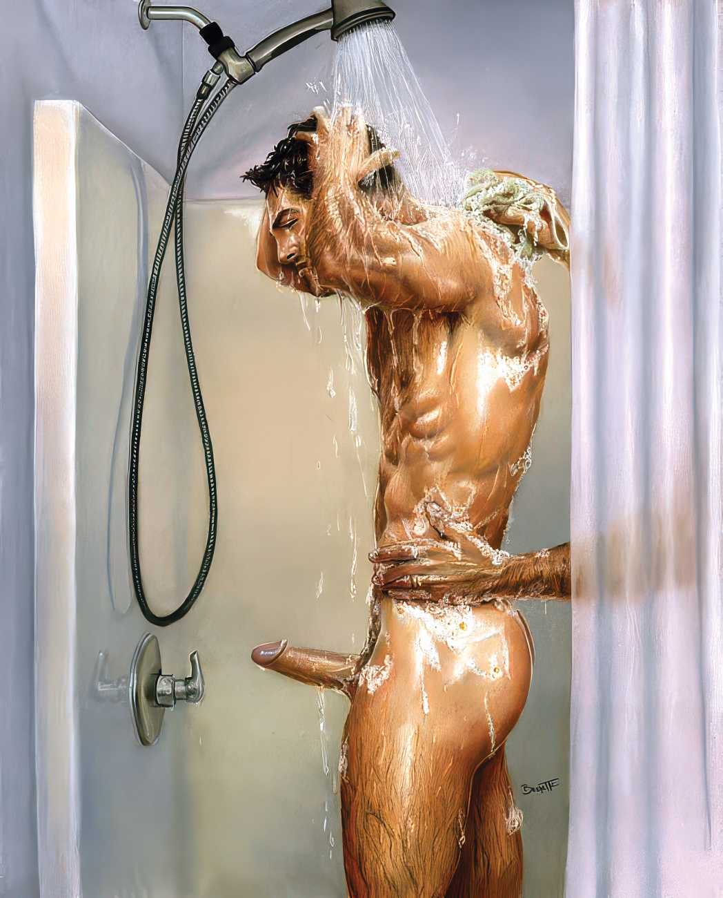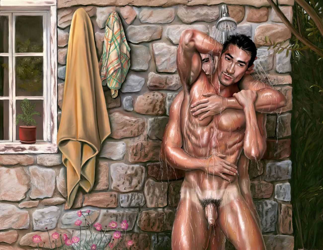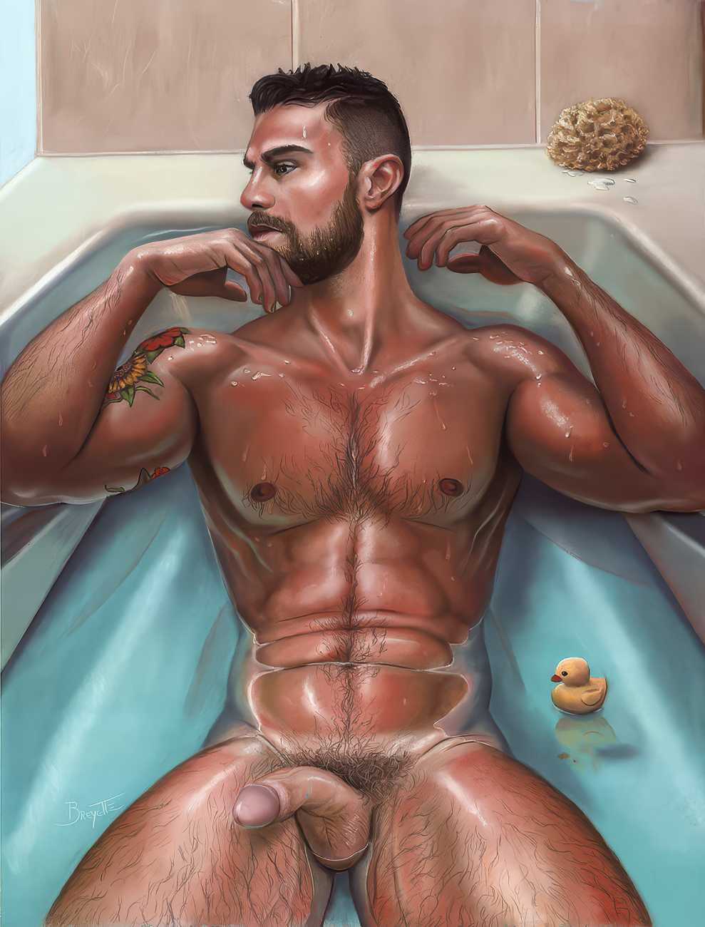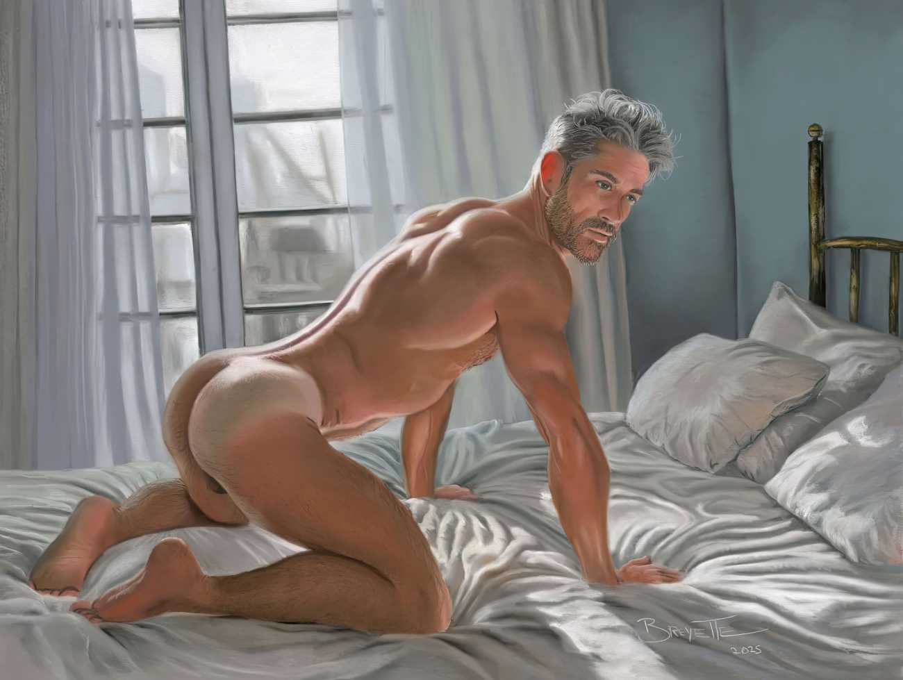 Michael Breyette’s work occupies a distinctive niche within contemporary male figurative art, bridging the personal and the universal through its unabashed celebration of the male body. His choice of soft pastels lends his work a tactile warmth that immediately sets it apart from more clinical and photorealistic approaches, allowing smooth transitions of tone and sensual surface. His figures retain a painterly softness – musculature and light are suggested rather than rigidly defined, inviting viewers into an intimate relationship with his subjects.
