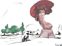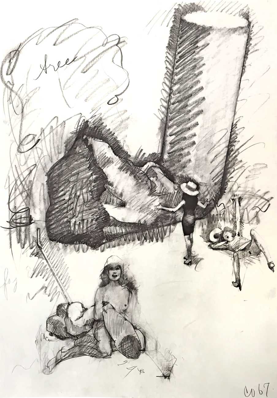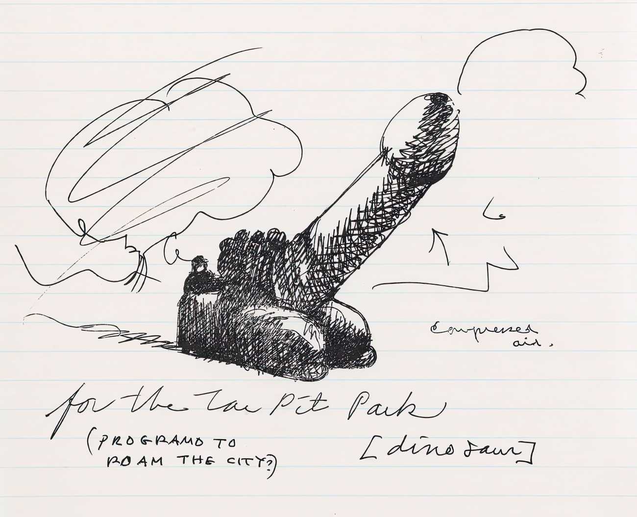 Oldenburg’s drawings and writings reinforce this reading. His notebooks are filled with mock-heroic descriptions of objects treated as lovers, enemies or fetishised companions, while the drawings depict fantasies of extreme sexual encounters, massive cocks, frenzied orgies. The erotic charge is often comic, but the comedy sharpens rather than neutralises, revealing how desire permeates a consumerist society.