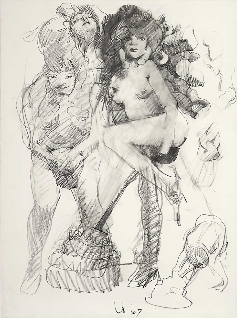 Though Claes Oldenburg is best known as a sculptor, he was also a talented and imaginative visual artist, adept with pencil and pen, and dabbling productively in various etching techniques. It comes as no surprise that he was put to work drawing erotic drawings for his classmates while still at school. Proving himself exceedingly skilled at illustrating sexual fantasies, Oldenburg created erotic collages by fusing the bodies of fashion models and pin-ups.