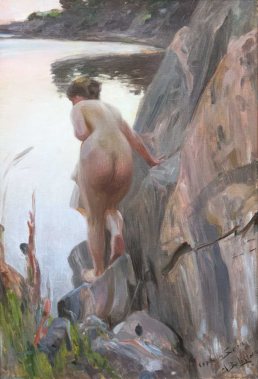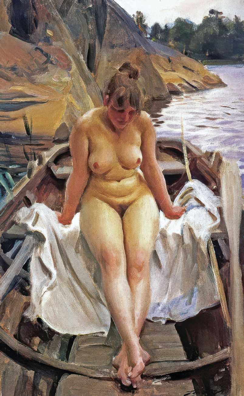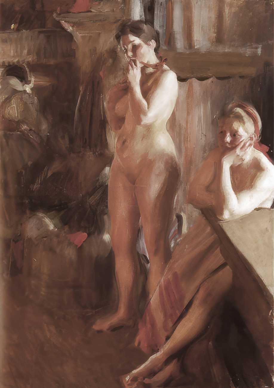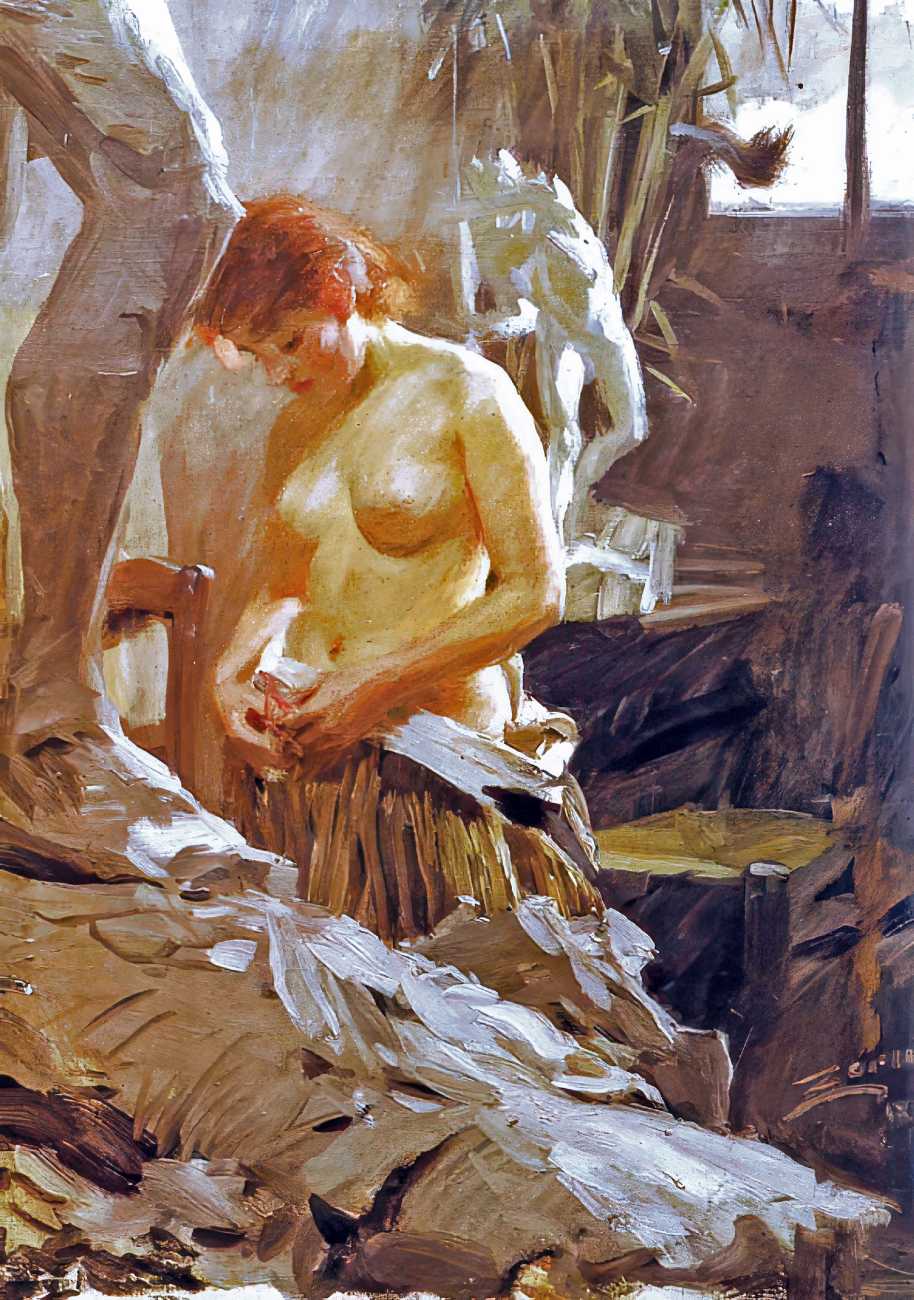 Though the reception for his naked-women paintings was mixed, and in many cases hostile and critical, Zorn had a growing band of appreciative critics. In 1913 J. Nilsen Laurvik, an art critic and independent curator, wrote a monograph on Zorn, explaining that, ‘With a few swift, sure strokes Zorn gives us the soft contour, the undulating curves of the fresh, firm flesh, of these strong-limped Junos. The nudes of Rembrandt would look singularly coarse and heavy by comparison with these silvery, exquisitely modelled Brunhildas of Zorn, who deport themselves on the sunlit beach or emerge from the enveloping shadow of some protruding cliff with a child-like unconsciousness and a pagan naïveté that disarm prudish prejudices. These big, blond women, whose naked bodies move with unrestrained freedom through the tonic, balsam air, are imbued with a superb, healthy animalism such as has never been depicted in the whole history of art. Zorn delights in portraying these sturdy, flaxen-haired peasants in all the unconscious abandon of their naïve natures, and the series of plates celebrating the intimate life of these people are the most authentic expressions of his art because the most closely related to the mainsprings of his personality.’
