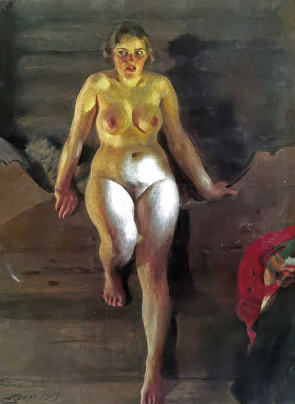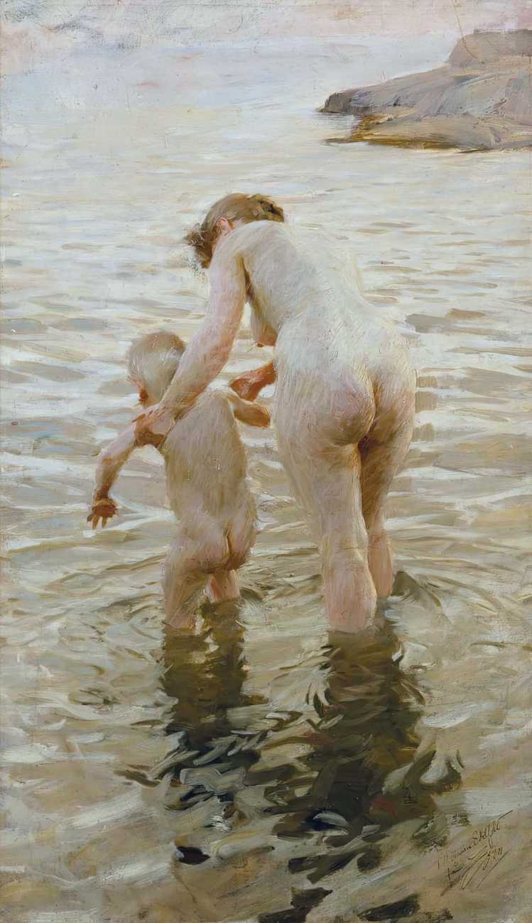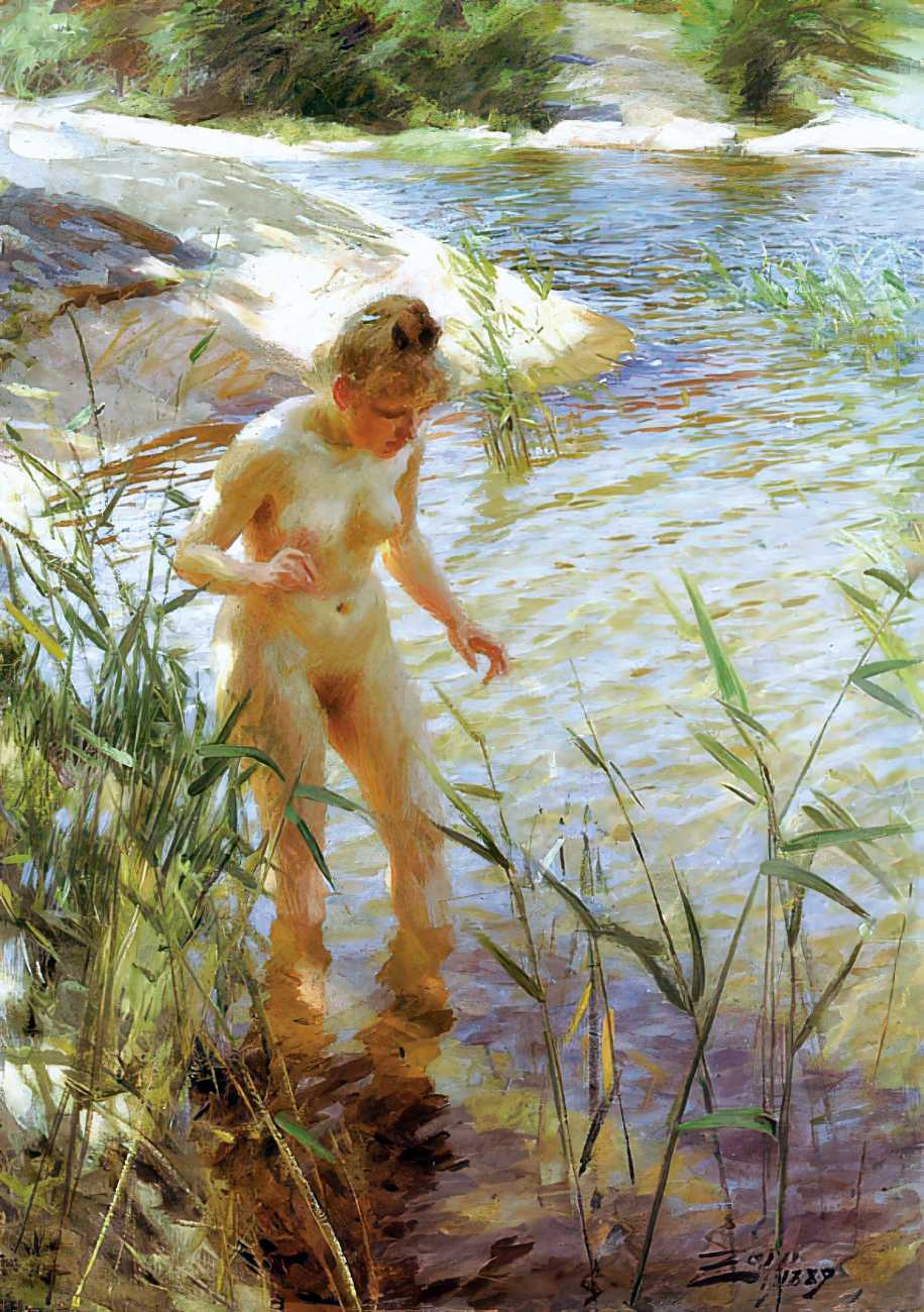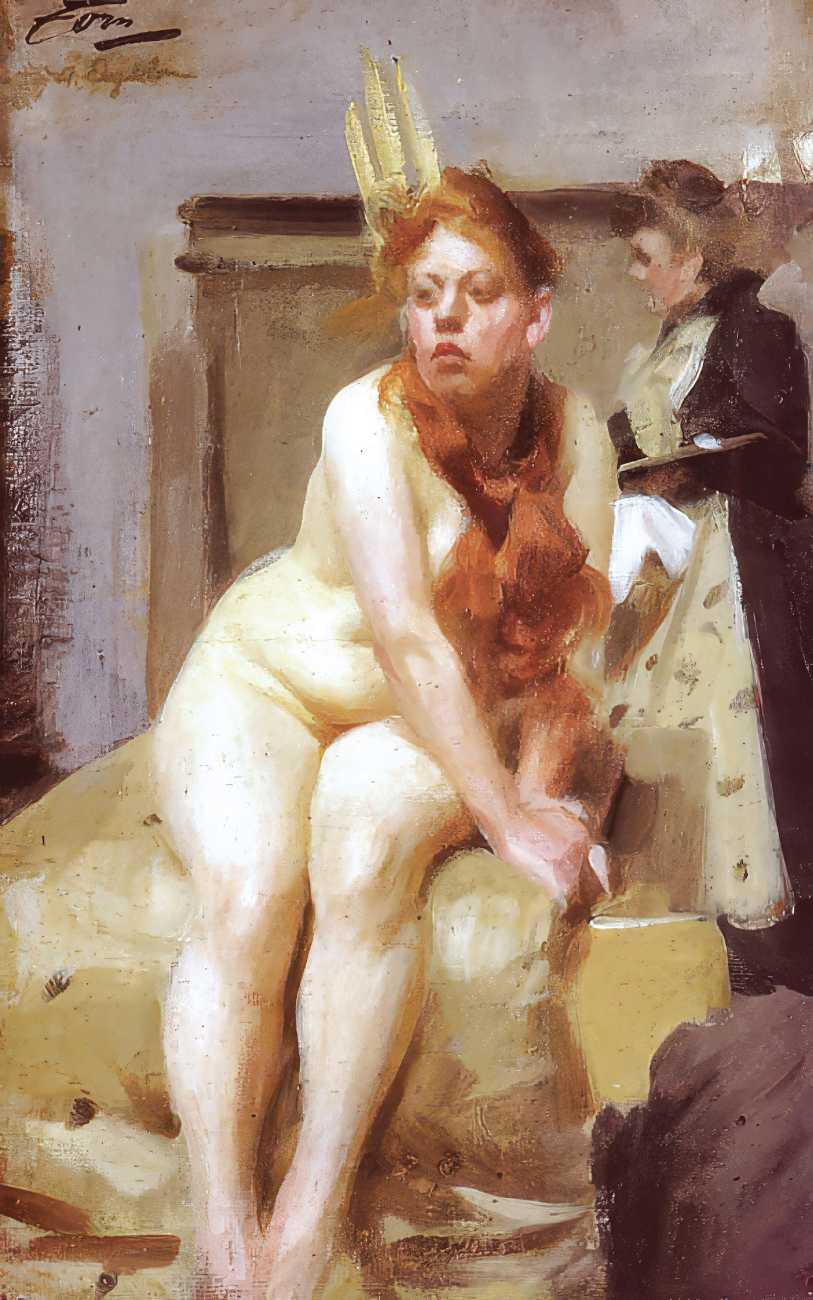 Though the reception for his naked-women paintings was mixed, and in many cases hostile and critical, Zorn had a growing band of appreciative critics. In 1913 J. Nilsen Laurvik, an art critic and independent curator, wrote a monograph on Zorn, explaining that, ‘With a few swift, sure strokes Zorn gives us the soft contour, the undulating curves of the fresh, firm flesh, of these strong-limped Junos. The nudes of Rembrandt would look singularly coarse and heavy by comparison with these silvery, exquisitely modelled Brunhildas of Zorn, who deport themselves on the sunlit beach or emerge from the enveloping shadow of some protruding cliff with a child-like unconsciousness and a pagan naïveté that disarm prudish prejudices. These big, blond women, whose naked bodies move with unrestrained freedom through the tonic, balsam air, are imbued with a superb, healthy animalism such as has never been depicted in the whole history of art. Zorn delights in portraying these sturdy, flaxen-haired peasants in all the unconscious abandon of their naïve natures, and the series of plates celebrating the intimate life of these people are the most authentic expressions of his art because the most closely related to the mainsprings of his personality.’