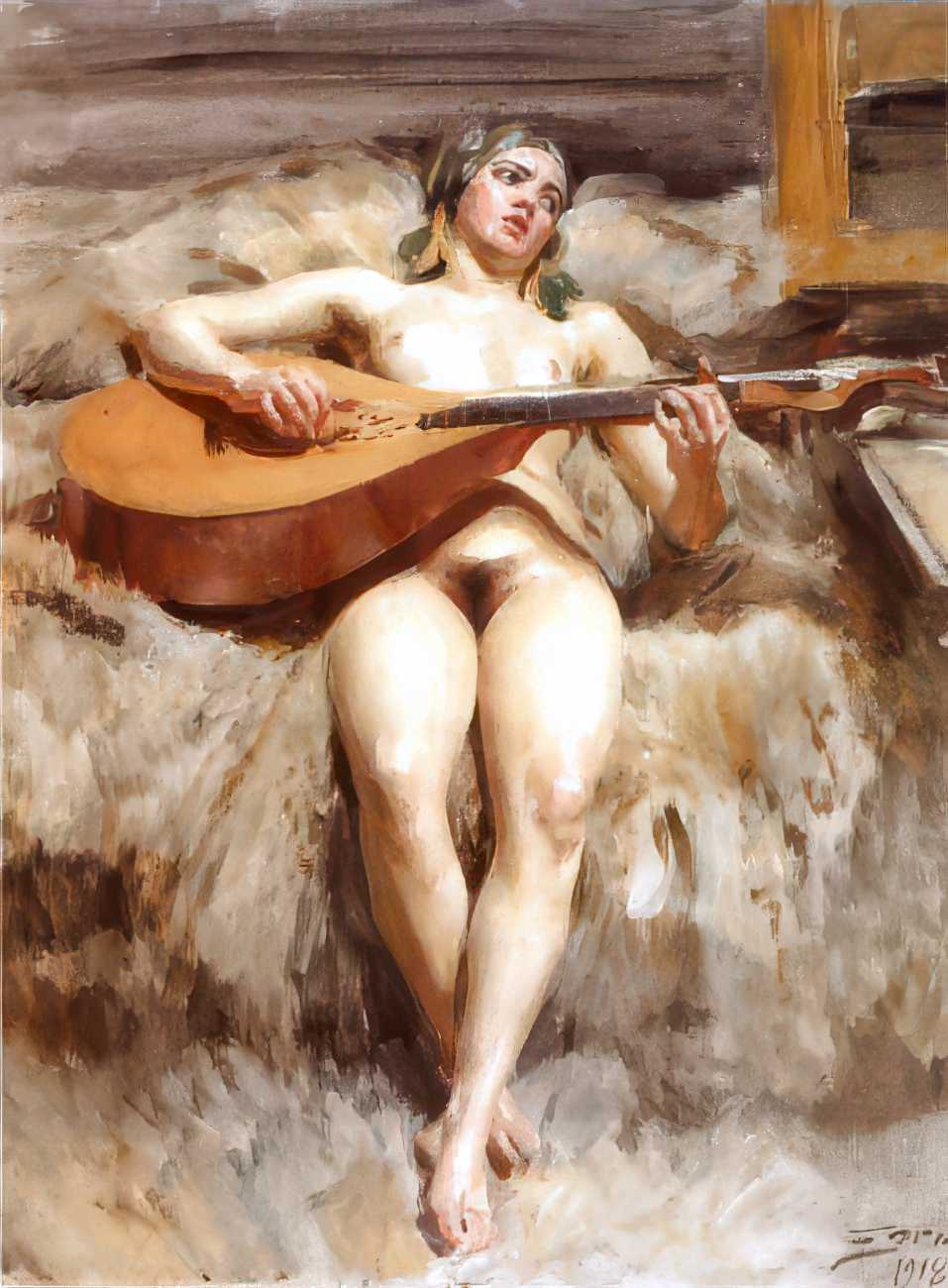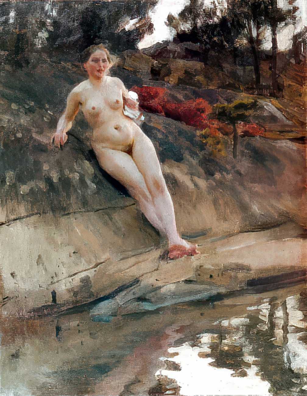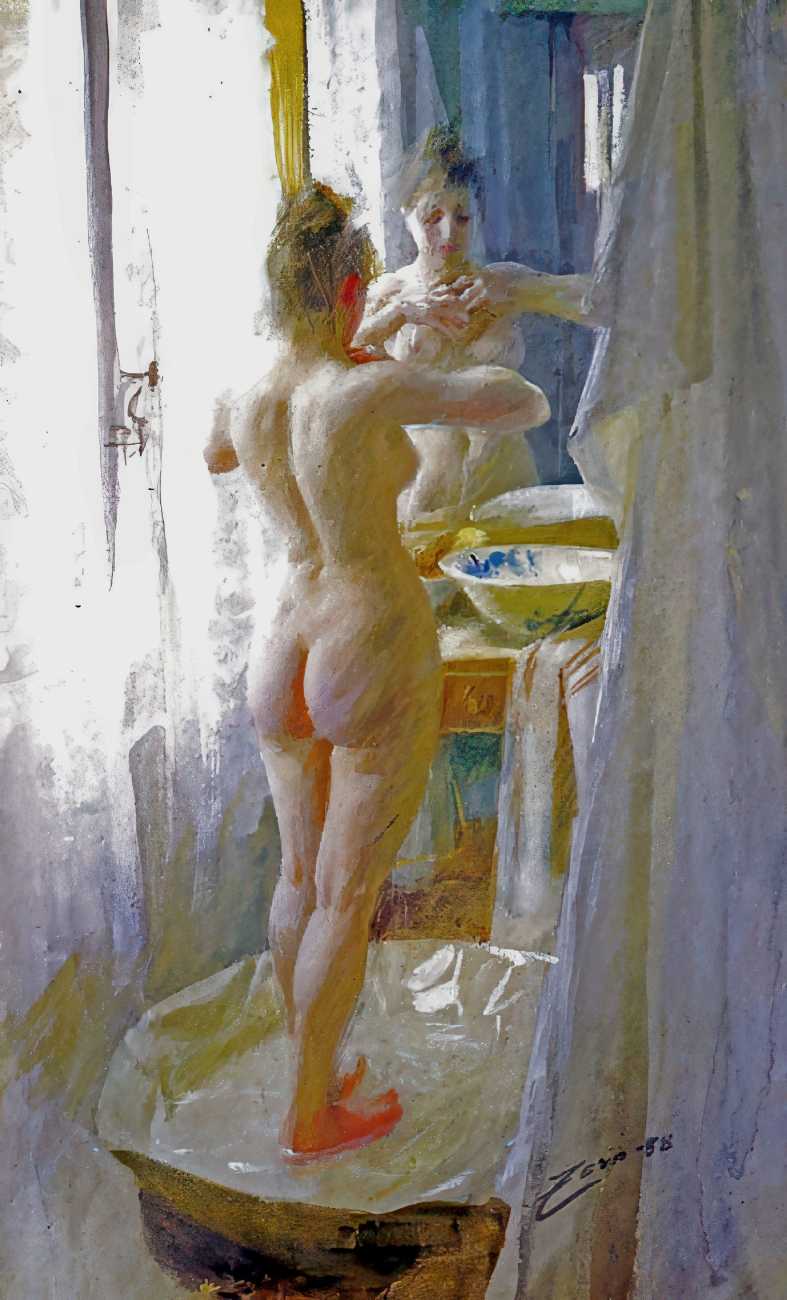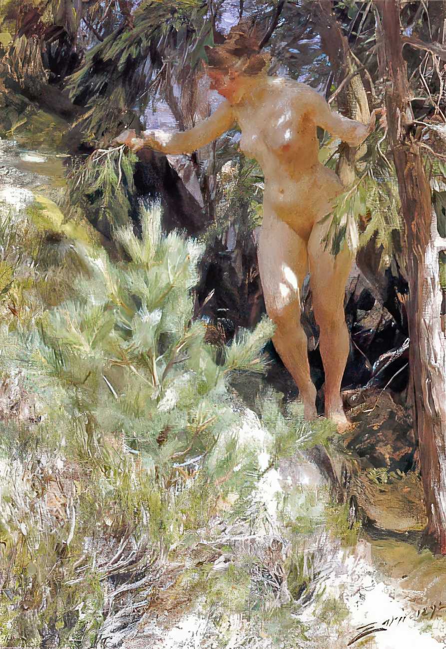 Technically the paintings are demonstrations of astonishing control. Using a limited palette which came to be known as ‘the Zorn palette’ – lead white, yellow ochre, vermilion and ivory black – he rendered wet skin, reflected light, and the shifting transparency of water with rapid brushwork. Water is often the main subject as much as flesh – ripples break the figure into fragments, reflections duplicate the body, and the boundary between figure and environment dissolves.
