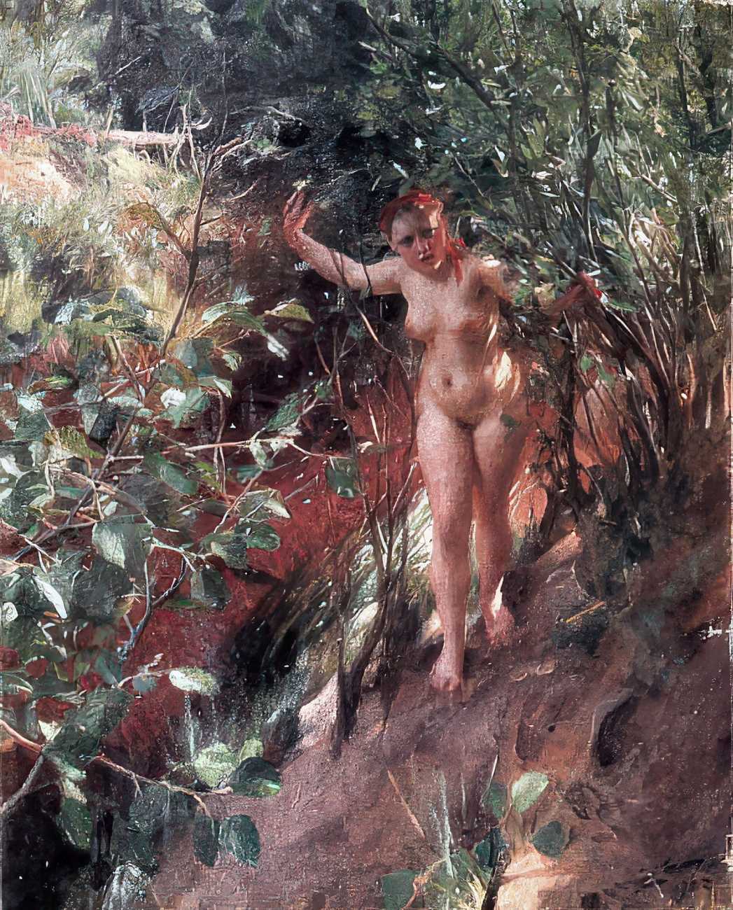 The eroticism in Zorn’s paintings is direct but complex. Zorn was not painting academic ideal beauty – his models have weight, muscle, and sometimes an awkward posture. They appear to be unaware of the viewer, absorbed in washing or stepping into water, others glance back over their shoulder. The setting intensifies the charge: these are secluded, liminal spaces where social rules are suspended. The paintings invite a voyeuristic reading, yet their physicality resists titillation. The women are robust, self-possessed and at ease, inhabitants of the nature surrounding them.