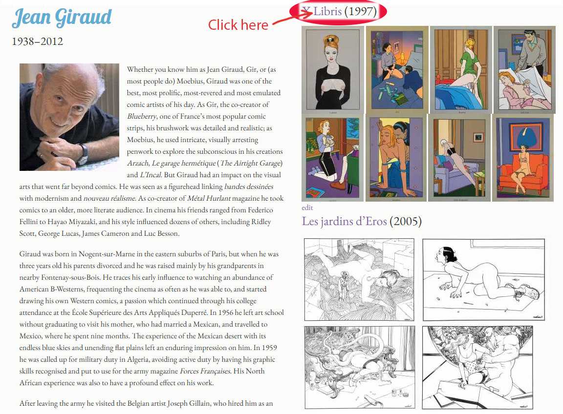 The portfolio name is at the top of each block of images, and by clicking on it you can access detailed information about that particular portfolio. As an example, here is the artist page for the French artist Jean Giraud, showing where you need to click if you want to see more information about his 1997 portfolio X Libris.