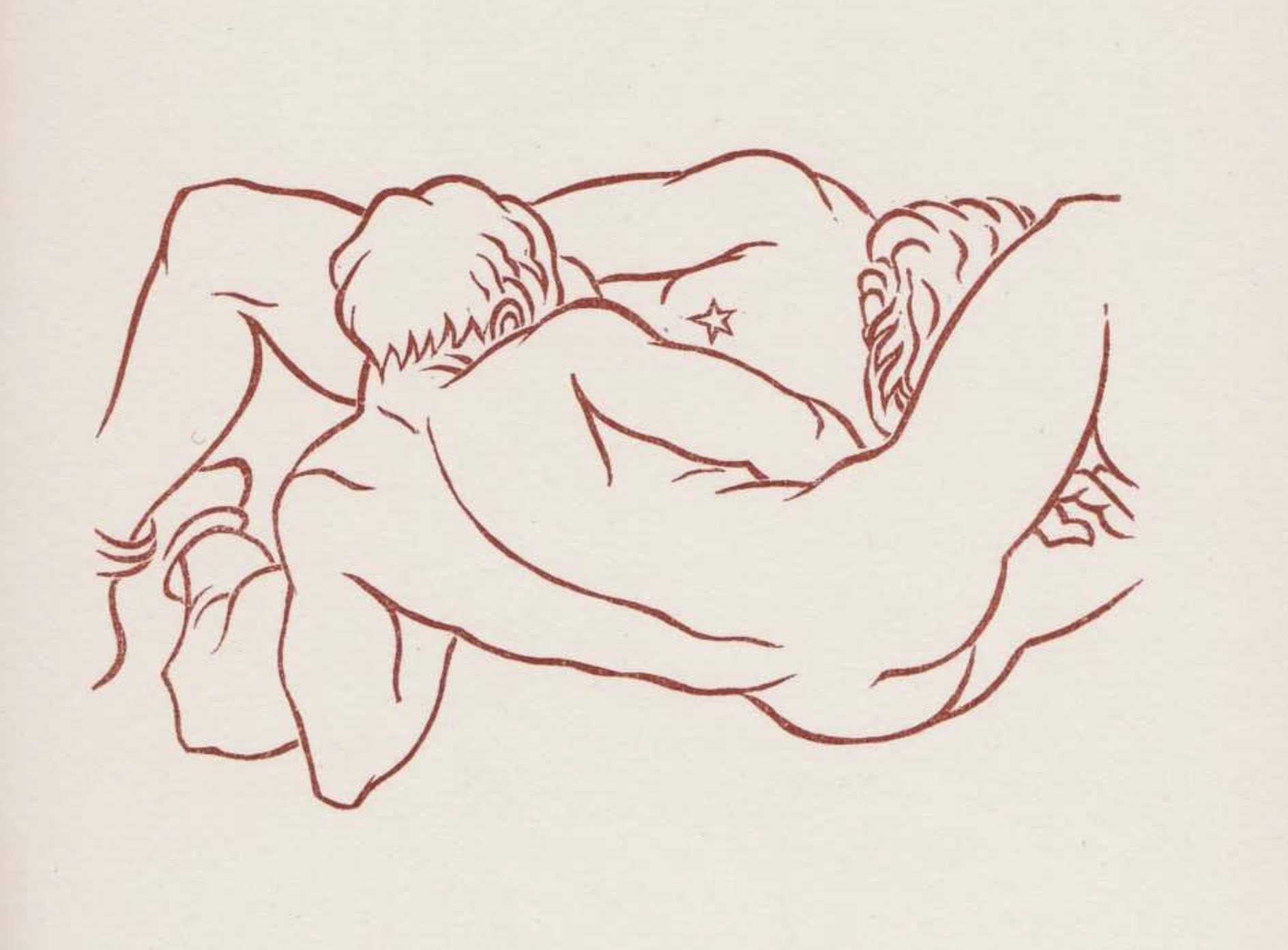 The fourth one is by Elie Grekoff, from Tiresias, showing two youths exploring one another. I love this minimalist style. The star-shaped nipples are a cute and fun detail – they make Grekoff’s drawings special, and help his characters stand out. Again we can feel both joy and melancholy in these lovers.