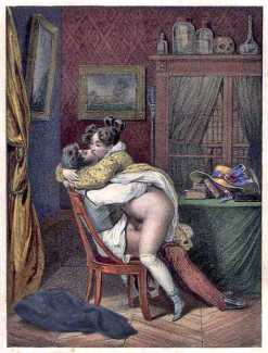In 1830 he contributed to a compendium of erotica titled Imagerie galante, and in 1833 he illustrated Gamiani, the classic erotic tale of lesbianism. He managed to generate controversy with one odalisque, a painting of a loosely clothed woman reclined on a divan smoking a cigarette. He also illustrated a satanic-erotic piece of explicit literature called Diabolico foutro-manie (1835), where devils penetrate young maidens with their tails. In 1838 he illustrated Le livre des mille nuits et une nuit (The Thousand and One Nights), a collection of historical and erotic tales. He depicted orgies of every conceivable configuration: soldiers in a field, aristocrats in their homes, women cuckolding their husbands in plain view. In one print, a man uses a candlestick on himself while he enters a woman from behind.