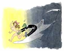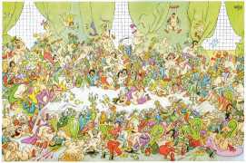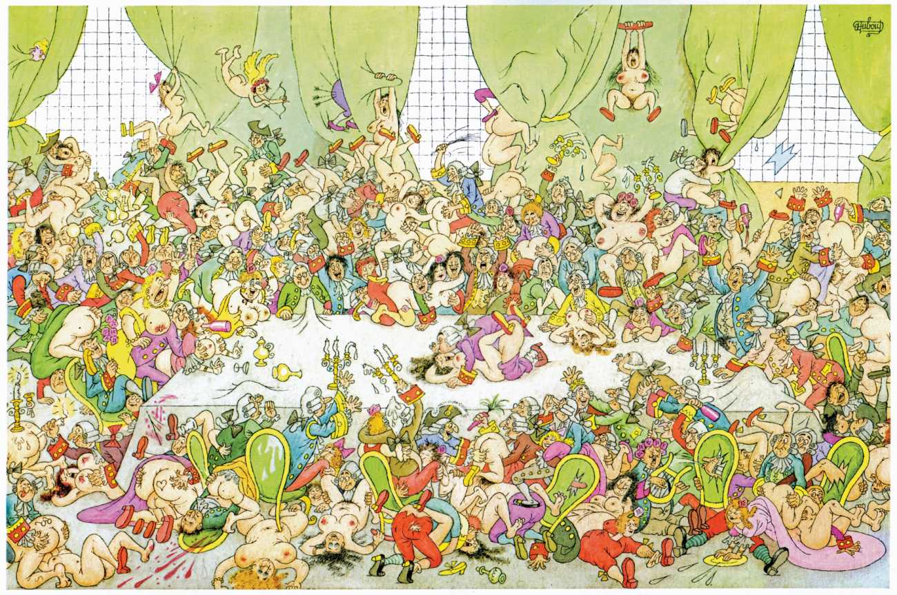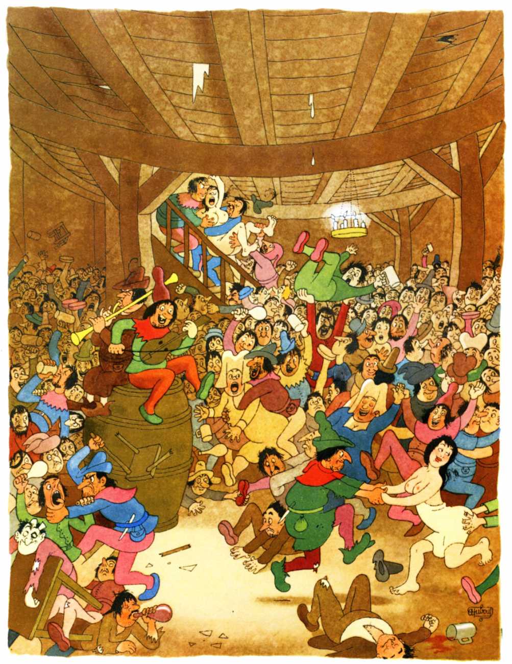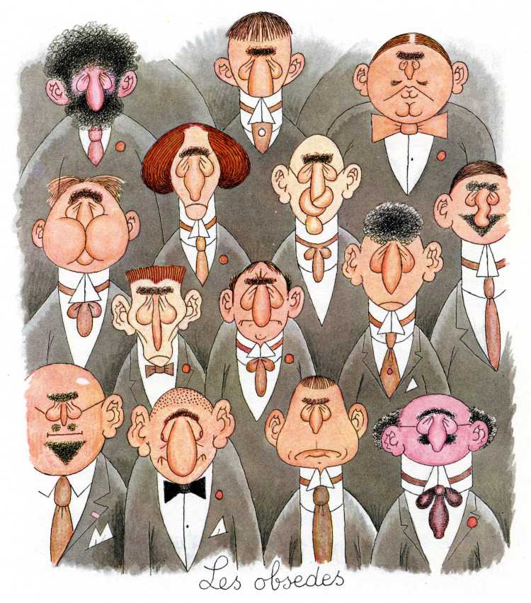 Alongside his book and magazine illustrations, by the late 1930s he was also firmly established as a cartoonist, the perfect outlet for his more grotesque and imagination creations – large women accompanied by diminutive husbands, crowds of people involved in bizarre activities, mad scenes involving trains and cars. The novelist Marcel Aymé, reviewing one of Dubout’s early cartoon volumes, wrote ‘A Dubout album is an Olympus of stupidity reduced to its basics’.