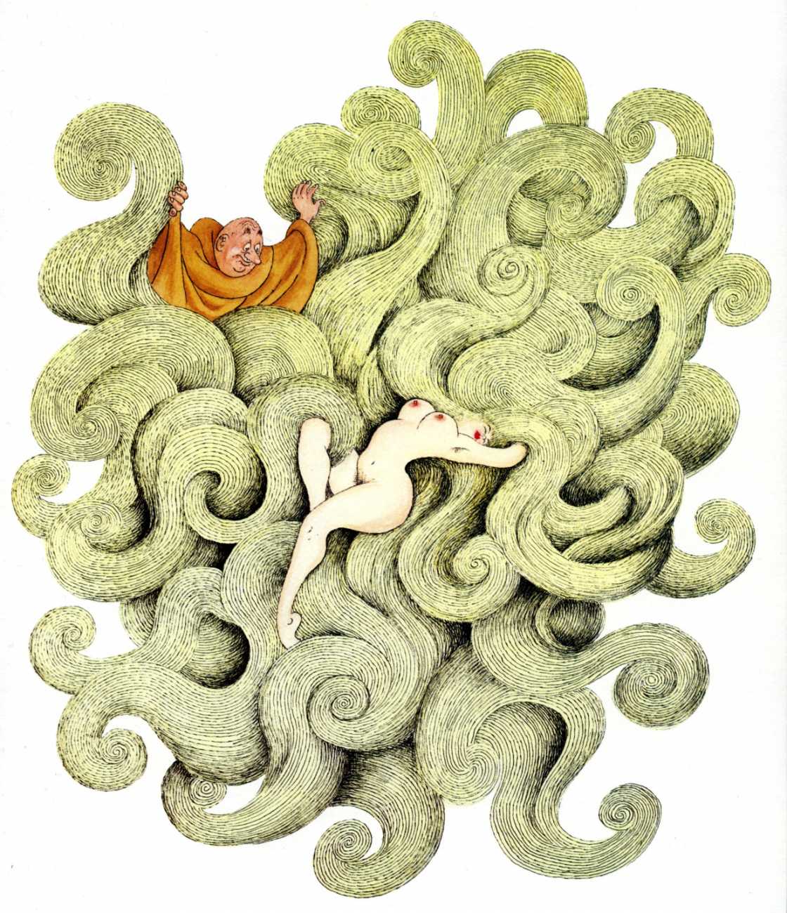 Albert and Suzanne married in May 1968, and for several years they divided their time between his house in Mézy-sur-Seine west of Paris and her family home in Saint-Aunès to the east of Montpellier. By the 1970s Albert was becoming more well known for his edgy illustrations for classics like Kama Soutra and de Sade’s Justine, supported by generous commissions from Paris-based publisher Michèle Trinckvel.