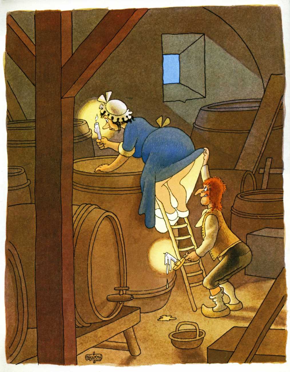 Albert and Renée separated in 1940, and Albert started spending time with Suzanne Ballivet, an artist he had known since his student days. The post-war period was a very busy period for both of them – they started working with Marcel Pagnol on his highly popular novels in 1948, and Albert worked on several animated films which were also successful. In 1957 Éditions du Valois commissioned illustrations from Albert for La muse libertine, which was to be the first of several Dubout-illustrated volumes on more erotic subjects. At the same time, his trademark cat and railway cartoons – a particularly popular subject was the ‘little train to Palavas-les-Flots’, a seaside town south of Montpellier – were becoming ever more widely known as the gift book and product market grew.