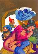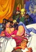 Biffignandi is the last of the old masters, and one of the very few of his kind who rendered cover art for publisher Edifumetto’s infamous adult comics. His covers sometimes referenced famous TV and movie characters, set in bizarre and unlikely situations. It’s an approach that pre-dates the American lowbrow pop art movement by about twenty years. Biffignandi’s extraordinary talent often elevated the subject matter above exploitation. At first glance the image serves its commercial intent. But then something else happens: you hesitate to turn the page, as if your mind is determined to grasp the mystery of the imagery.