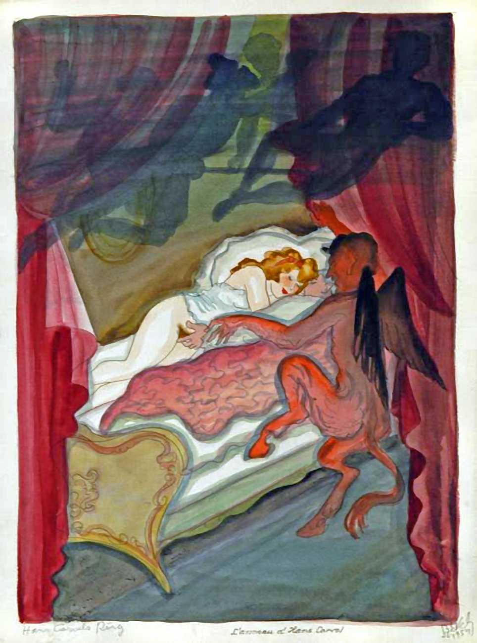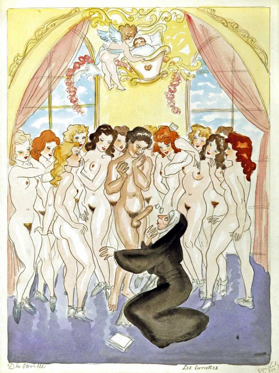 Székely had a very approachable, often quite naïve, style of erotic drawing, and although much of his artwork portrays conventional fantasy scenes of orgies and risqué cocktail parties (no doubt exactly what his clients wanted), some of his later work shows him to be a talented and imaginative artist. His watercolours for ‘The Temptation of St Anthony’, for example, are arresting and thought-provoking.