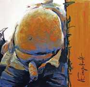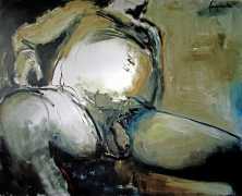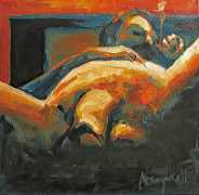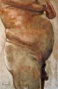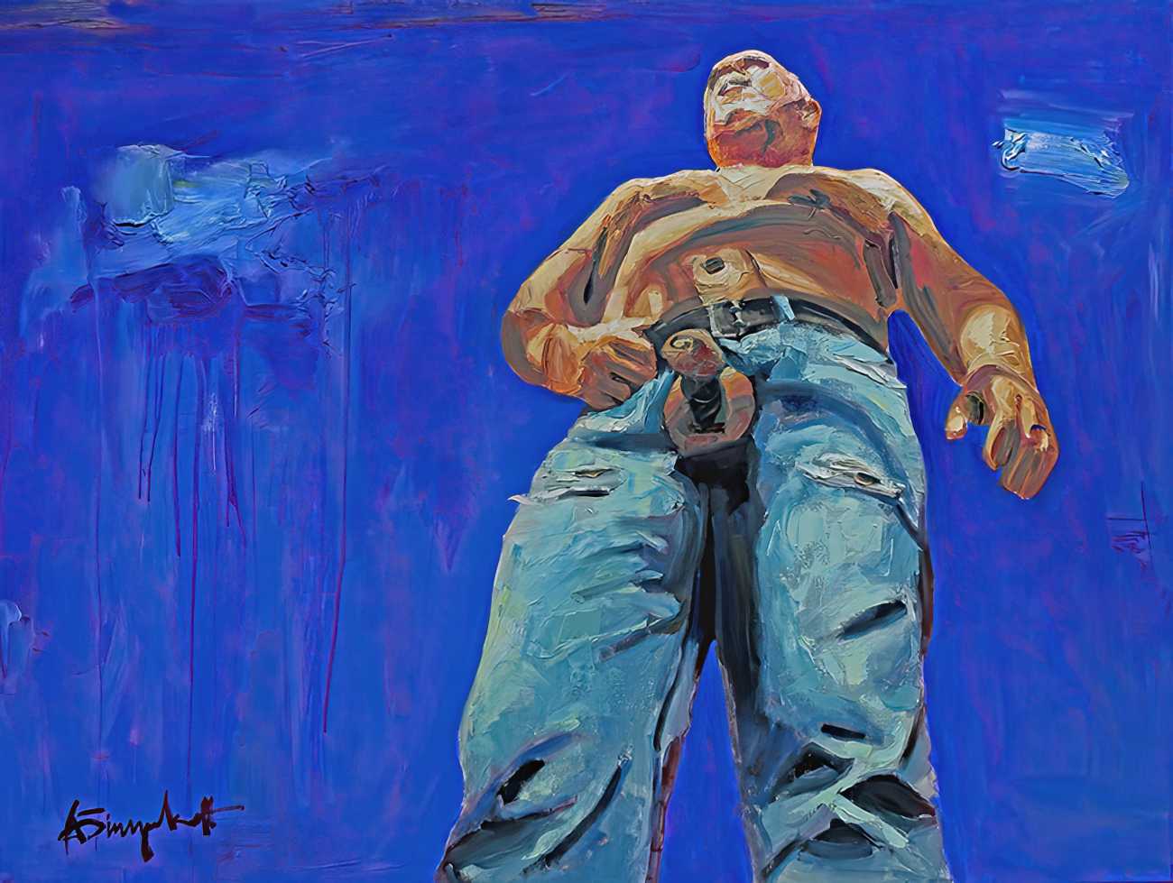 His work is predominantly large-scale paintings of naked older men who are trying to survive in the glamorous fitness model culture. His first Russian show which included nudes, in Barnaul in 2004, was considered obscene because of the male nudity, and was closed down by local officials.