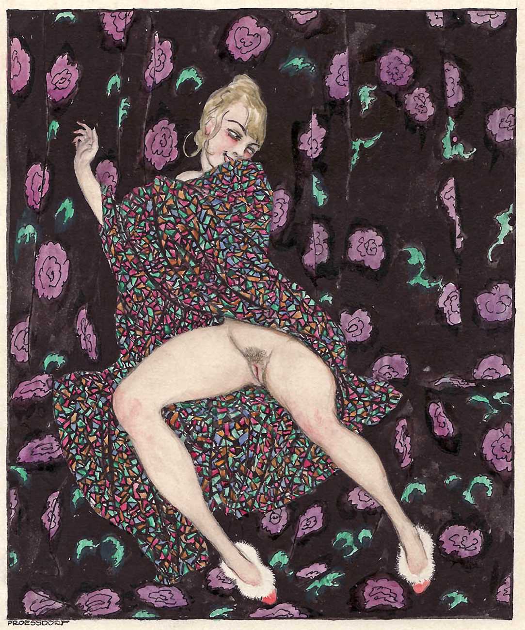 As an illustrator his cartoons appeared in Söndags-Nisse and Skallran, and before the Swedish alcohol prohibition vote in 1922 he made a series of posters for drinks companies. He also worked in the theatre, drawing the costume sketches for Ernst Bauer’s summer revues from 1919 to 1923, and made sketches for Ernst Rolf’s revues. He published a selection of his drawings in the books Galleri (Gallery) and 13 Teckningar (13 Drawings) in the 1910s. His works includes figures and portraits in oil, but he was known mainly as an illustrator in ink and wash. Proessdorf is represented by costume sketches at the Theatre of History Museum in Gothenburg and the Museum of Modern Art in Stockholm.