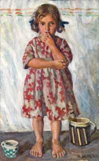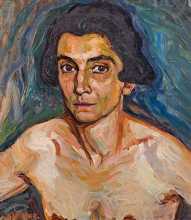 In 1918 she met fellow Graz painter Julius Franz Schütz (1889–1961) with whom she had an intimate relationship, and together with a small group of like-minded artists they founded the progressive but short-lived Graz Artists’ Association, called Freiland (Freeland). Hotter was very much influenced by the German Expressionists, especially Emil Nolde, Lovis Corinth and Jeanne Mammen, though she found it much easier to sell more conventional portraits and landscapes. Her work consists mostly of sensitively-observed portraits, plus several graphic cycles with socially critical, dreamy, nightmarish, and sometimes erotic content.