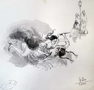 In the mid-1940s Amandine’s publisher brother André Bonne commissioned illustrations from her for a book which the established Belgian novelist and travel writer Albert t’Serstevens was writing about pirates. Despite an age difference of fifteen years, t’Serstevens being 61 and recovering from the end of his third marriage, Amandine and Albert’s relationship soon turned from artistic collaboration to romantic attachment, and they were married in Tahiti in 1946 during the researches for one of his books. They stayed in Polynesia for three years, then continued to travel together in Spain, Mexico, Sicily, Sardinia, Greece and Morocco, with Amandine illustrating his books as he wrote them.