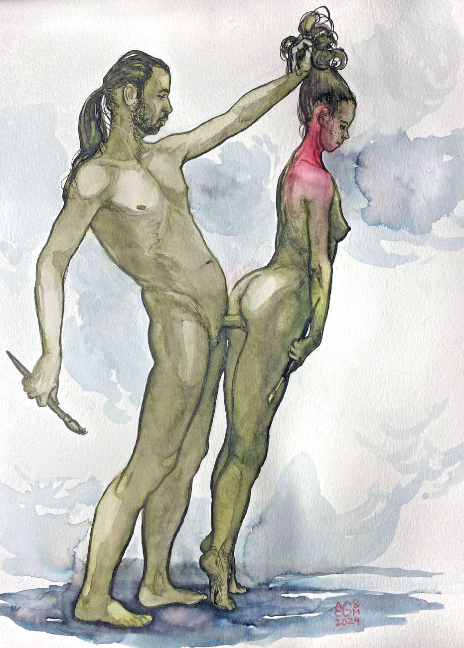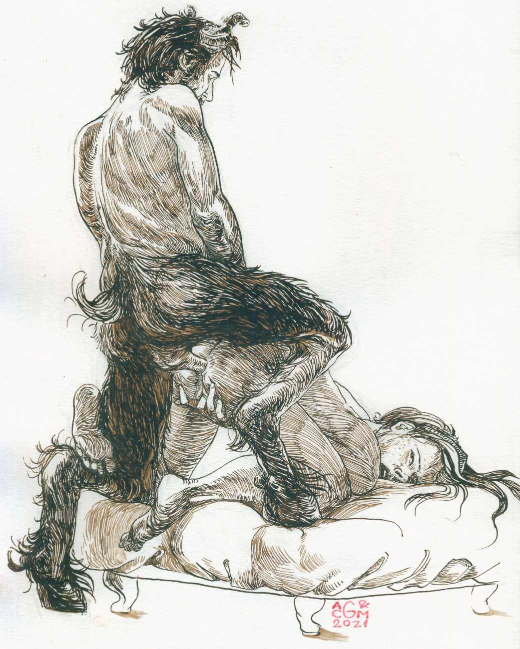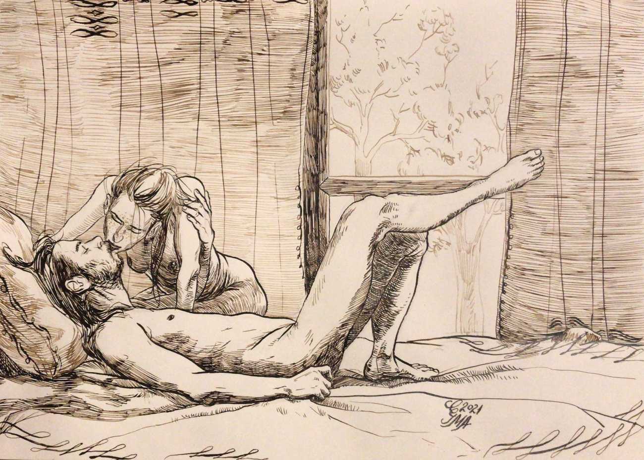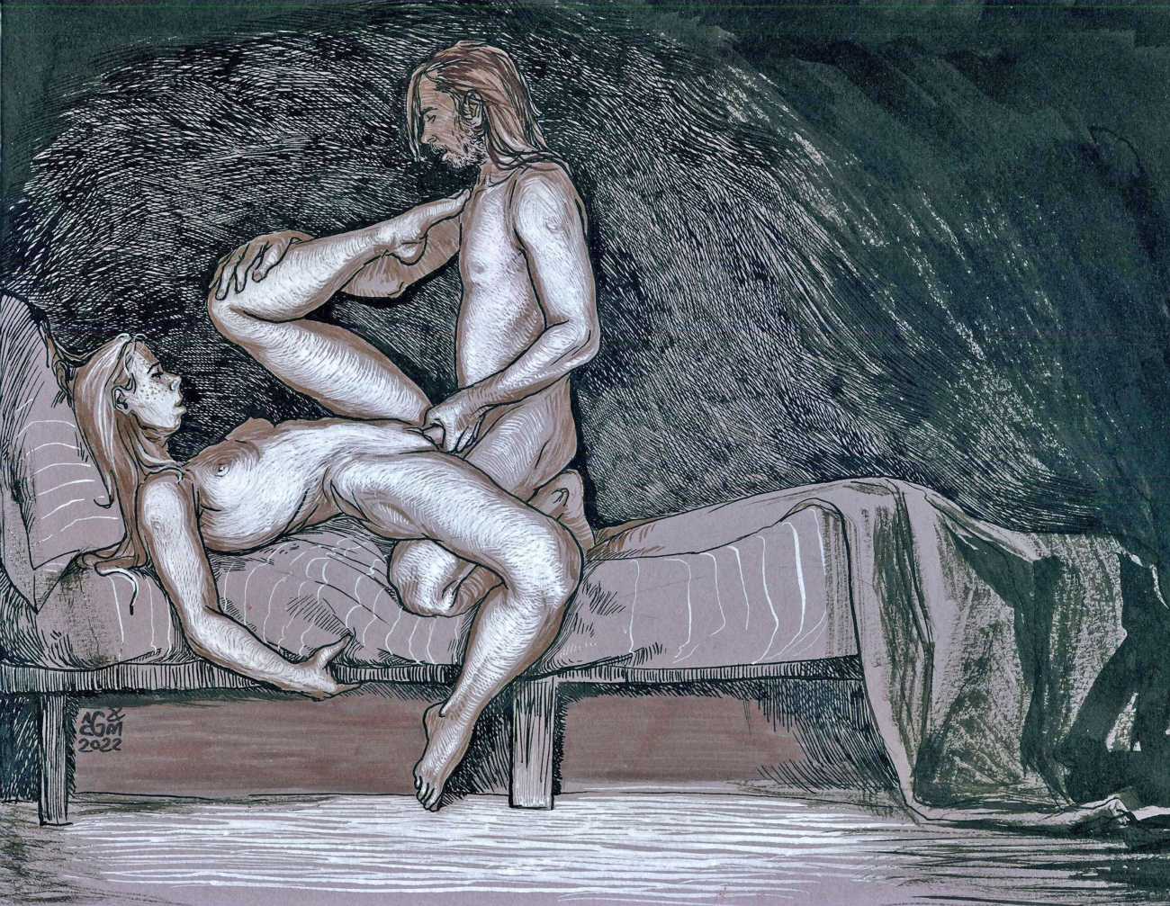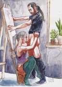 She became involved in computer graphics before it was part of the university curriculum, which helped her find work in advertising and gaming graphics. While she continues to work mostly in commercial art, she has branched out into comic book illustration, including both historic and social subjects, and whenever possible making time to explore her new passion, erotic illustration. Her interest in erotic art, and in exploring a variety of media in which to interpret it, coincided with a move in 2018 to Timișoara, where she finally met up with her artist muse ‘Faun’ having been online friends for a couple of years.