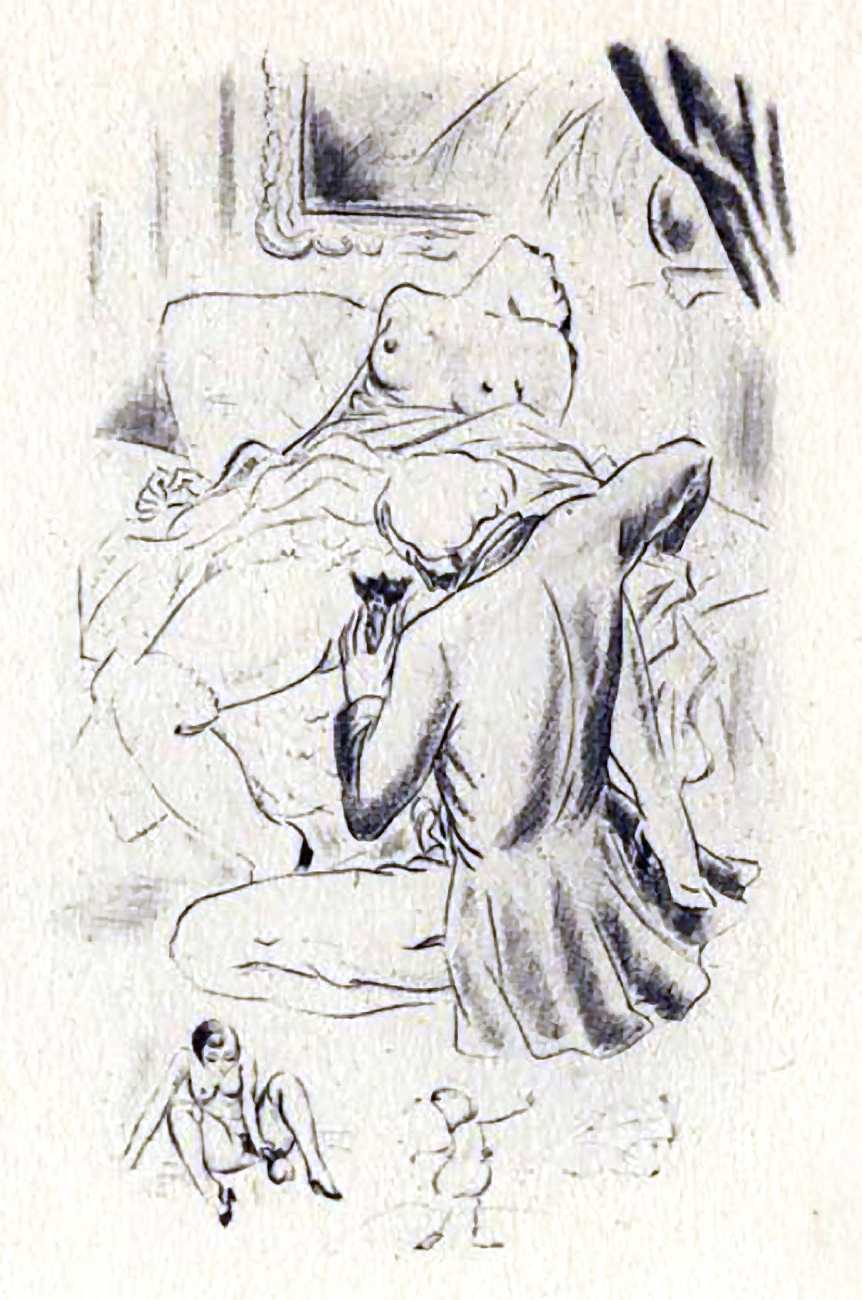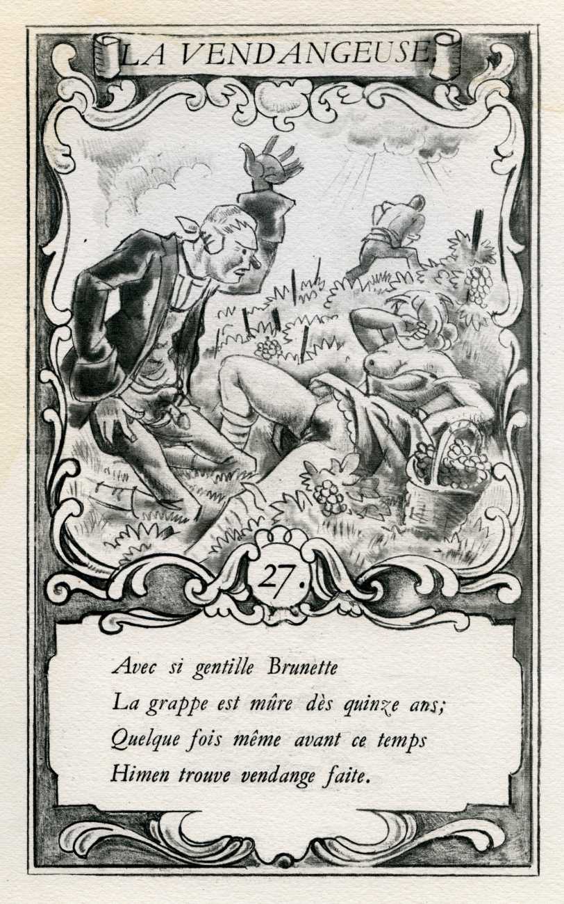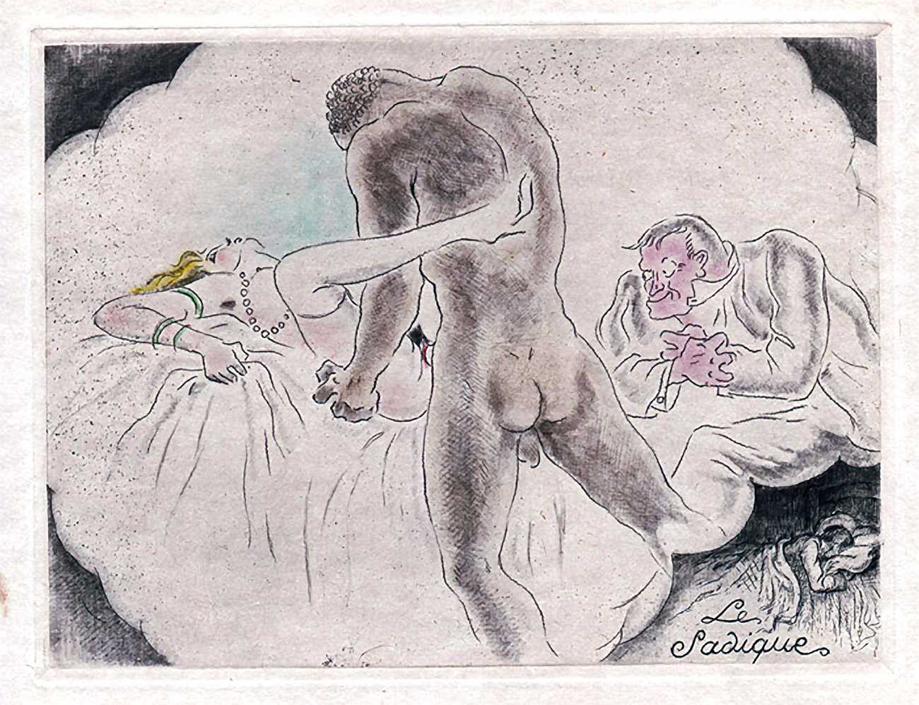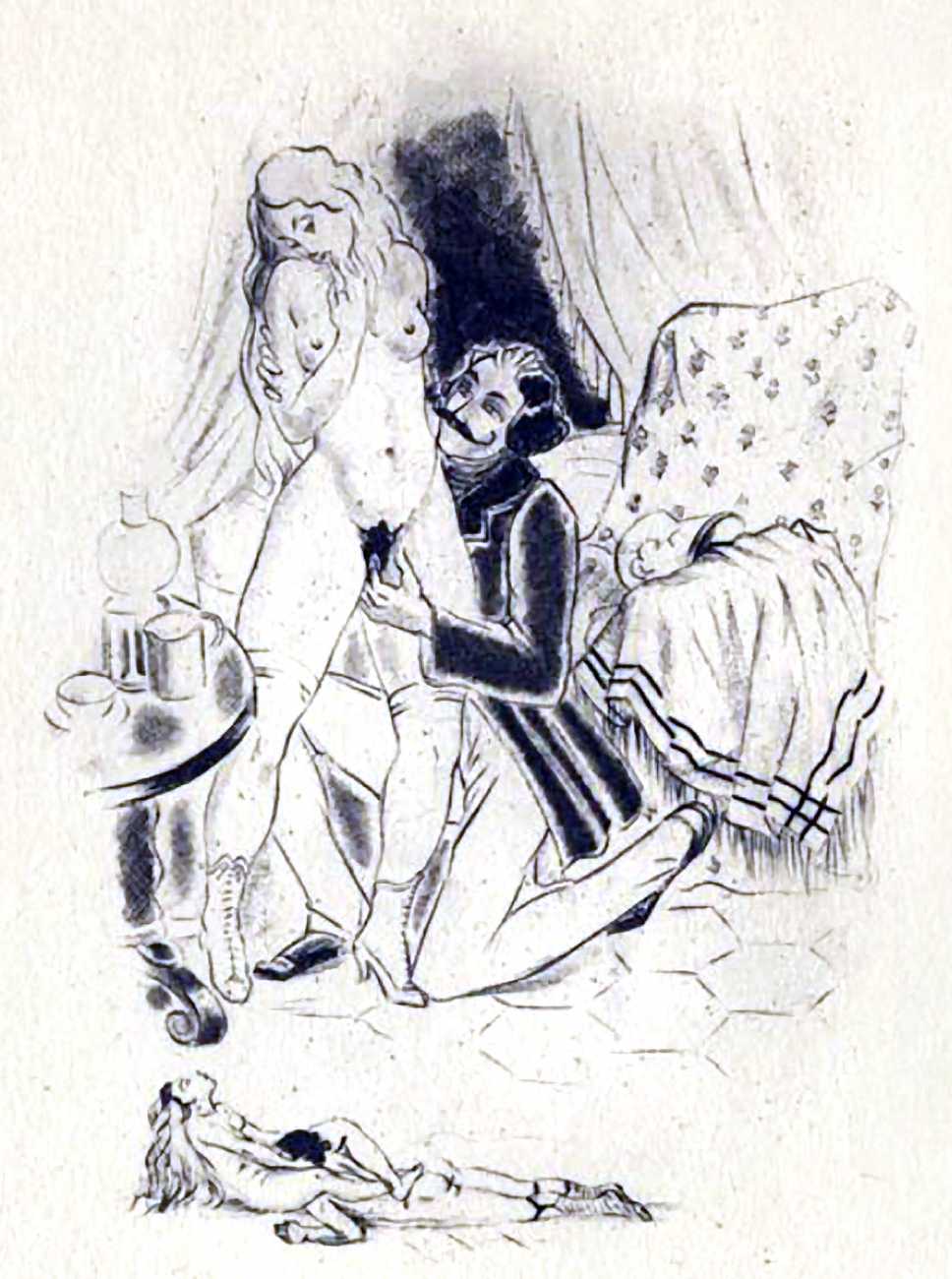 The prolific, original and innovative illustrator André Collot grew up in Montigny-le-Roi in eastern France, moving to Paris in the early 1920s where he studied painting and drawing, and made the acquaintance of the writer and fellow illustrator Pascal Pia (1903–79). Pia, whose real name was the more prosaic Pierre Durand, was already well known for erotic works including Les Princesses de Cythère (1922) and the poetry collection La muse en rut (The Muse on Heat), and he introduced Collot to his publishing circle.