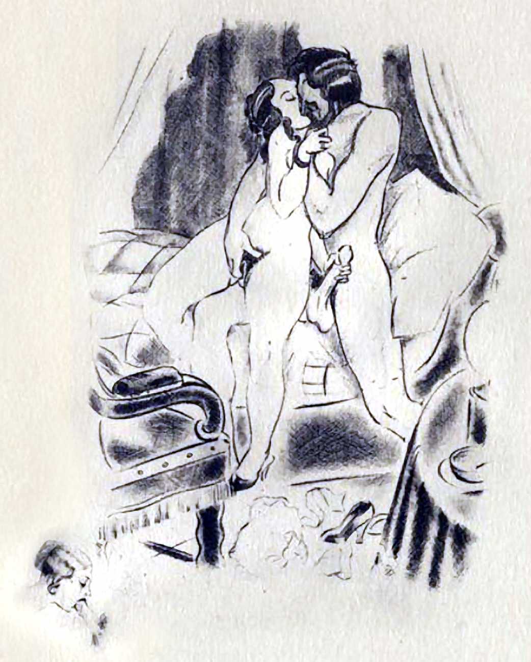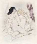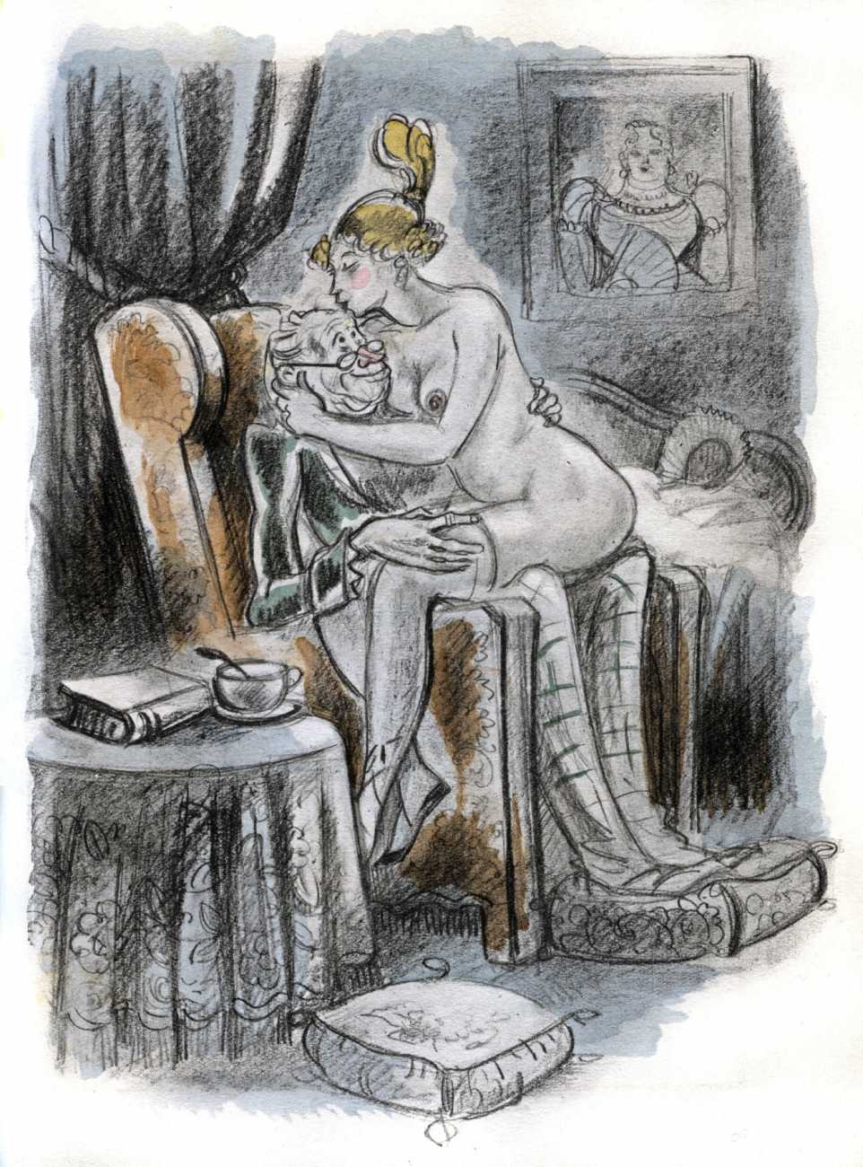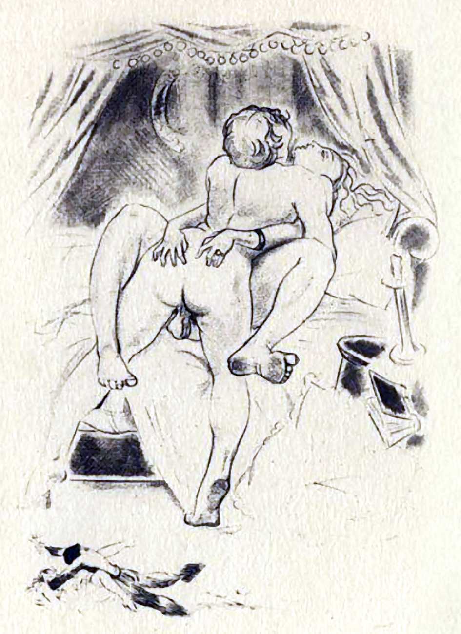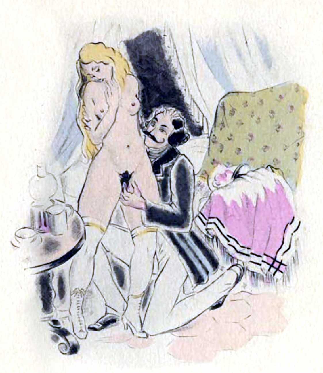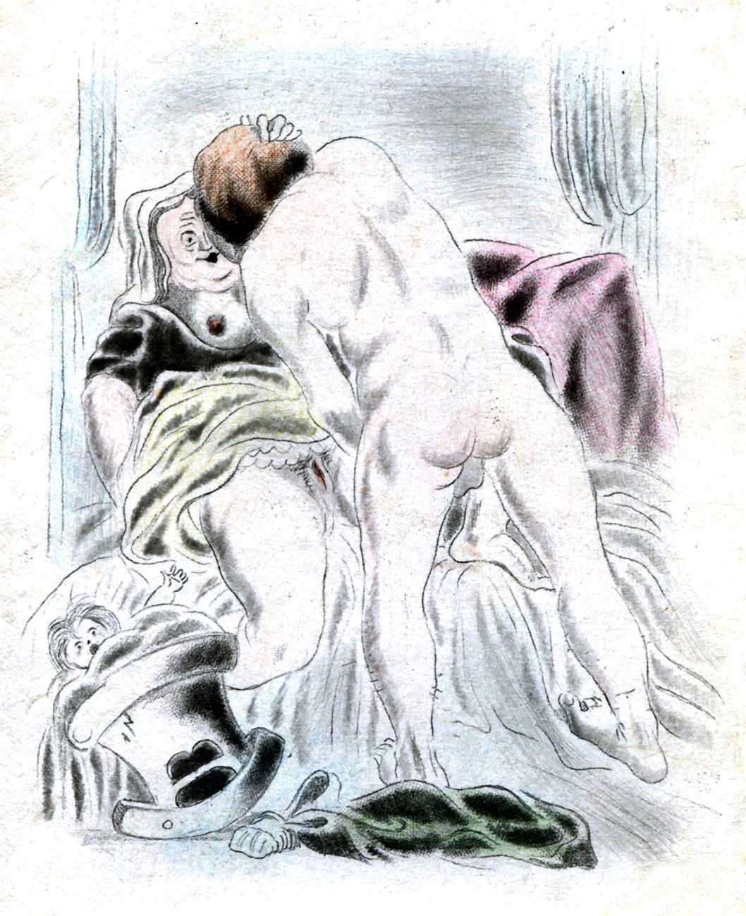 It did not take long for the commissions to start coming in, and from the late 1920s until the 1950s Collot was constantly busy creating illustrations for a wide range of titles, including classics such as Molière and Daudet, contemporary fiction, and more risqué clandestine editions, including his favourite Pierre Louÿs; by 1955 he had illustrated nearly a hundred books. In the 1940s he tried his hand at more conventional painting, exhibiting at the Salon d’Automne in 1942 and the Salon of Independent Artists in 1943, but it is for his graphic yet stylish erotic work that he is best remembered.