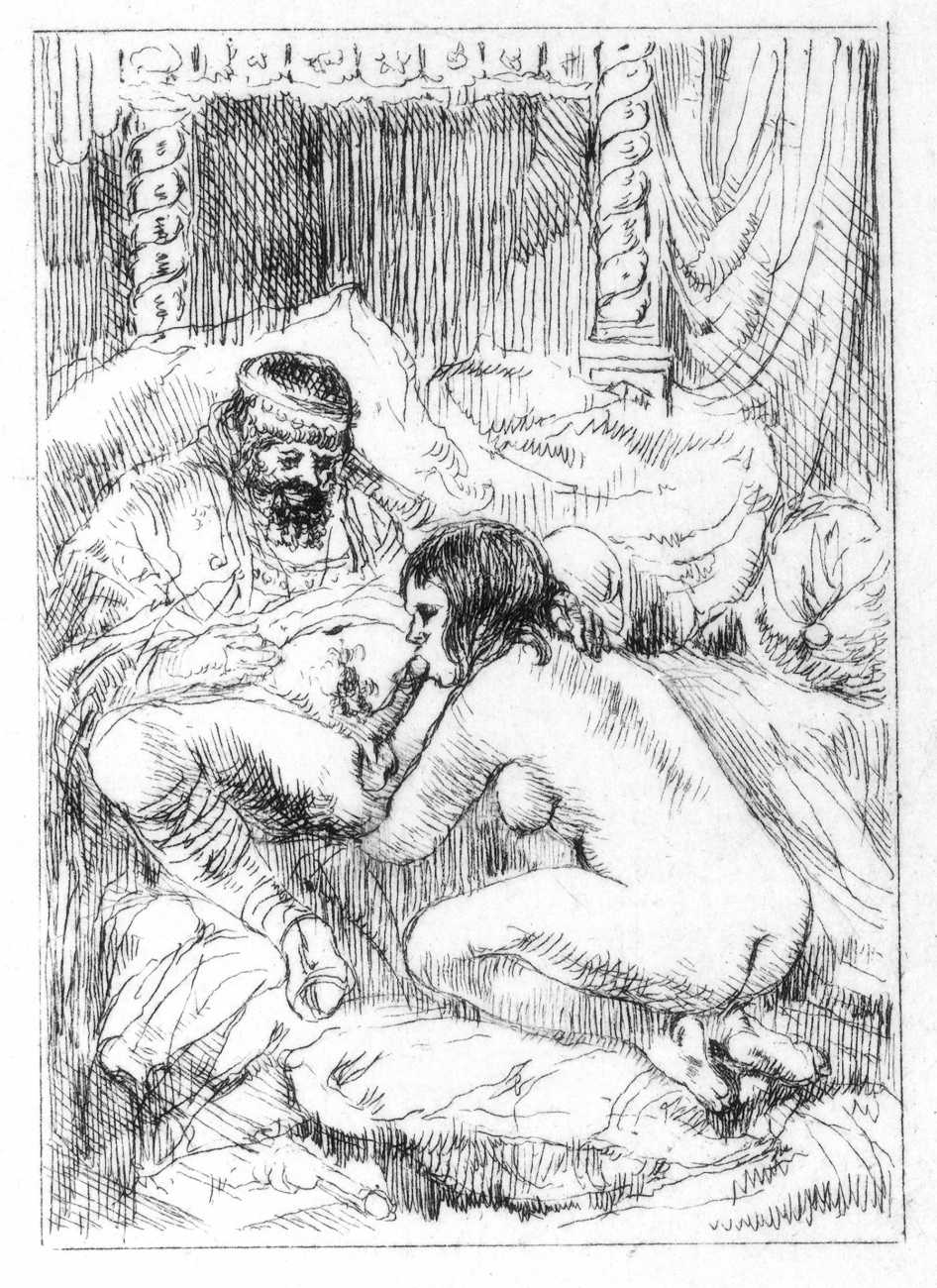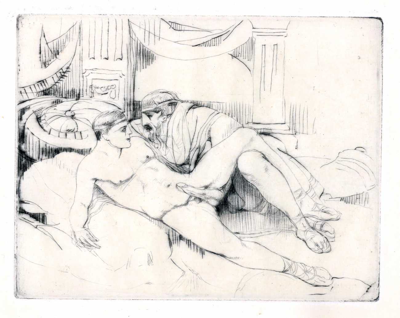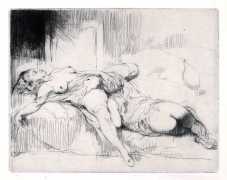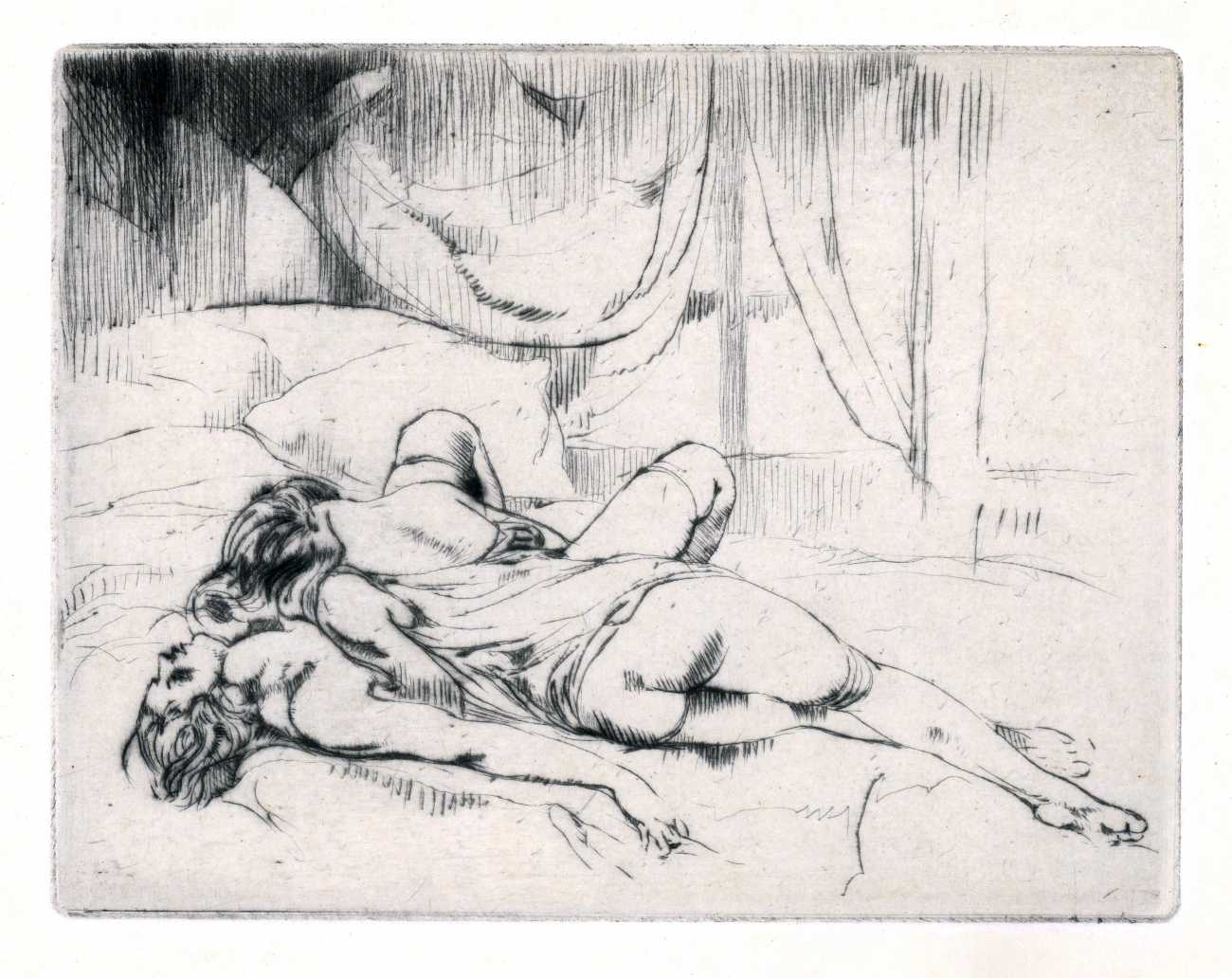 It was probably his studies of dancers that brought Brouet’s skills to the attention of the collectors of limited-edition print editions of erotic texts, and to publishers comfortable with such material like Gaston Boutitie and René Bonnel. Close-up studies of bodies, especially naked ones, was not particularly Brouet’s forte, but he was always open to a challenge. Where he lived all his adult life, near the top of Montmartre, was an ideal location for studying his subjects in the flesh, and though we know little of his rather single (though very sociable) life, he created some touching and sensitive intimate scenes for the three specifically erotic portfolios he made between 1926 and 1938.