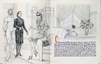 Montorgueil’s work became very popular in the 1950s, where it was circulated around the underground fetish BDSM community. The drawings were originally produced in pencil and later coloured for publication in the 1970s, when they were collated into the volumes Dans la maison des amazones, Madame de Varennes and Barbara, and Les quatre jeudis.
