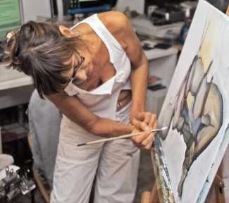When asked about influences on her art, Carolyn says ‘I wish I could tell you that there was an event or influence in my early life that prompted me to specialise in erotic art, but that is regrettably a pop-psychological view and has no currency in my life nor among other erotic artists that I know. I think that many people proceed in their lives and in their art having had no clear formative – or de-formative – influences. I know that is true of my own work. It’s impossible for me to separate my sexuality from my creativity. I remember being erotically stimulated and strongly influenced by the paintings of Francis Bacon from a young age, and drawn to artists who portrayed the melancholy, the seedy, the dark and the macabre in painting. I taught myself to paint by studying the paintings of Vermeer, Van Gogh, Leonardo da Vinci, and the melancholy angel Modigliani. Just about all the great Spanish painters have inspired me for their joyful exuberance and passion. I’ve often run my fingers gently over a painting by one of the great masters in museums when the guards were not looking at me, in order to learn how the paint was applied to the canvas.’