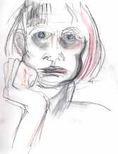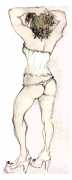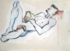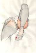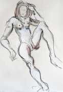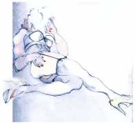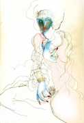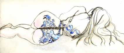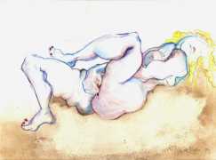 Her unmistakable style is characterised by a stark beauty, decisive clear lines, and a limited but finely-judged colour palette. There is none of the coyness, cuteness or predictability of much modern erotic art; her figures are completely believable and obviously more or less enjoying themselves.