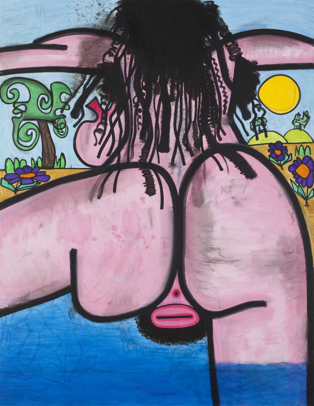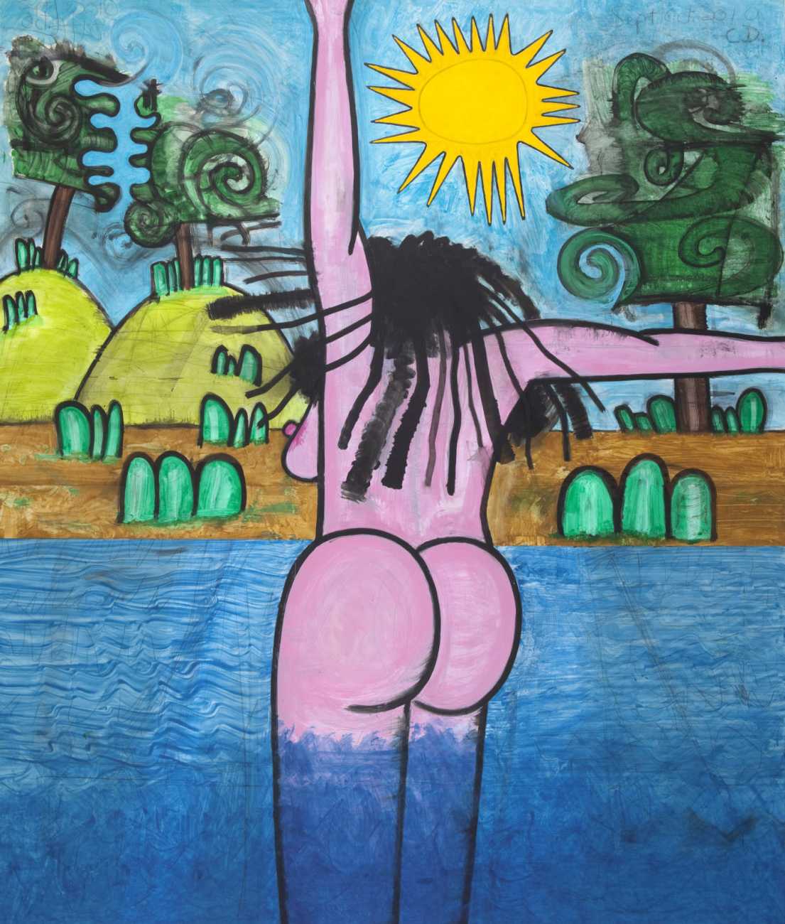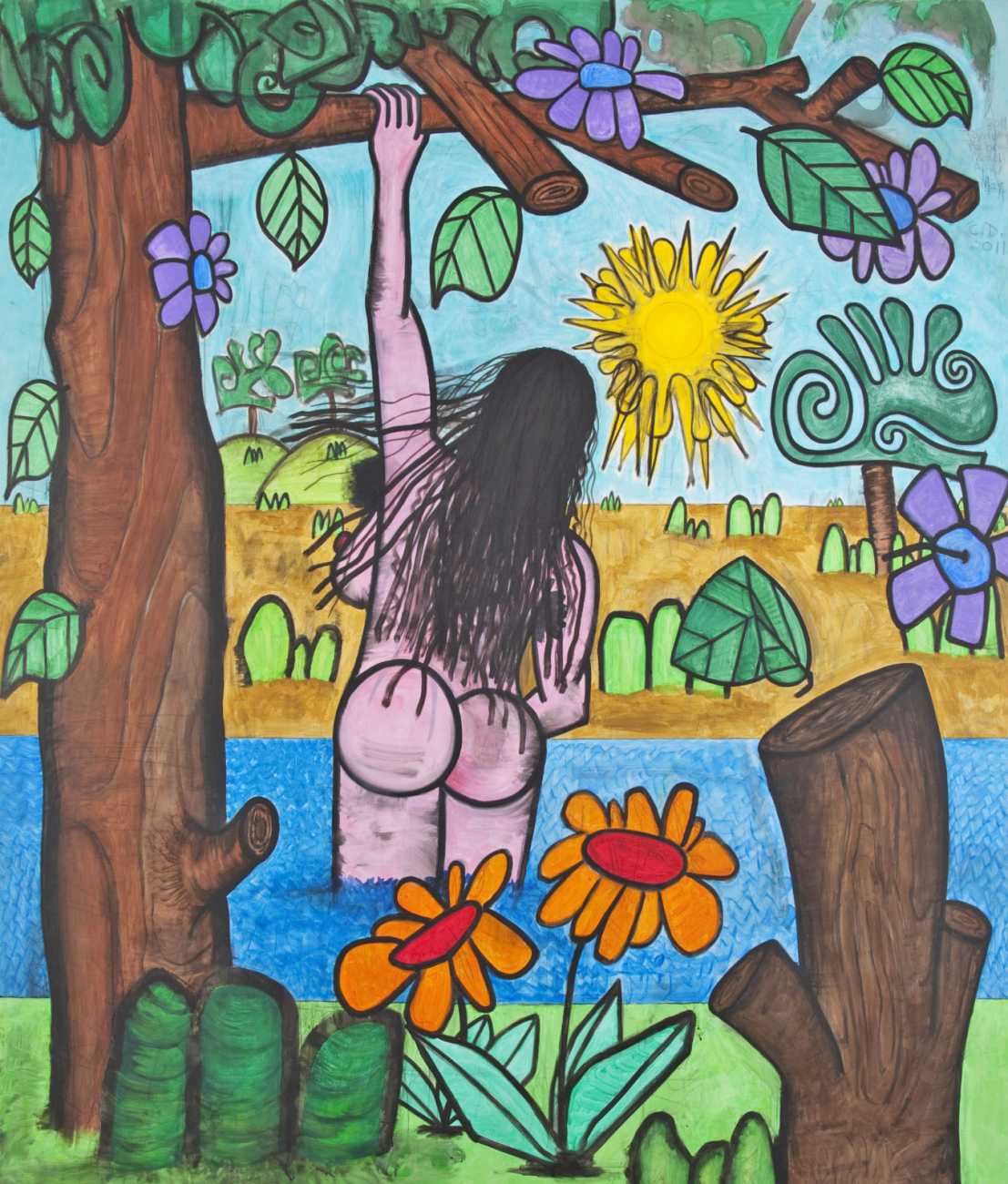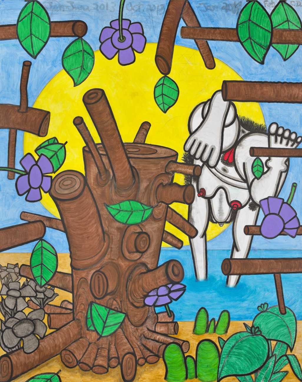 As Naomi Fry writes in a New Yorker article which you can read in full here, ‘There is something enigmatic about Carroll Dunham’s work, even though the painterly vocabulary he employs appears to be straightforward. Using bold planes of colour and almost cartoonish outlines, Dunham often depicts naked human figures in imagined natural landscapes, populated with naïvely rendered trees and birds, dogs and flowers. In his paintings and drawings of heavy-breasted, thick-thighed women bathing, or of hirsute men wrestling one another, Dunham allows the viewer to encounter life in vivid, animated action. And yet there is a palpable opacity to his subjects. Who are these half-biblical, half-science-fictional figures, with their button-like nipples and dark tufts of pubic hair, their bodies splayed jarringly against an indifferently cheerful landscape? What is the purpose and meaning of the obscure rituals that Dunham paints these characters engaging in, with their eyes averted from the viewer, as if reluctant to have their private customs disturbed or even looked at?’