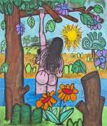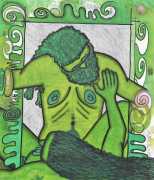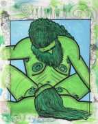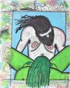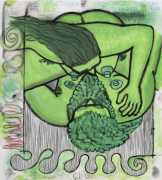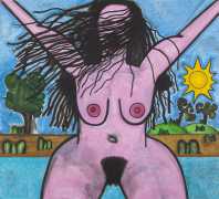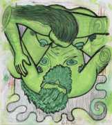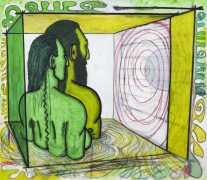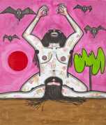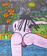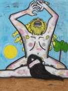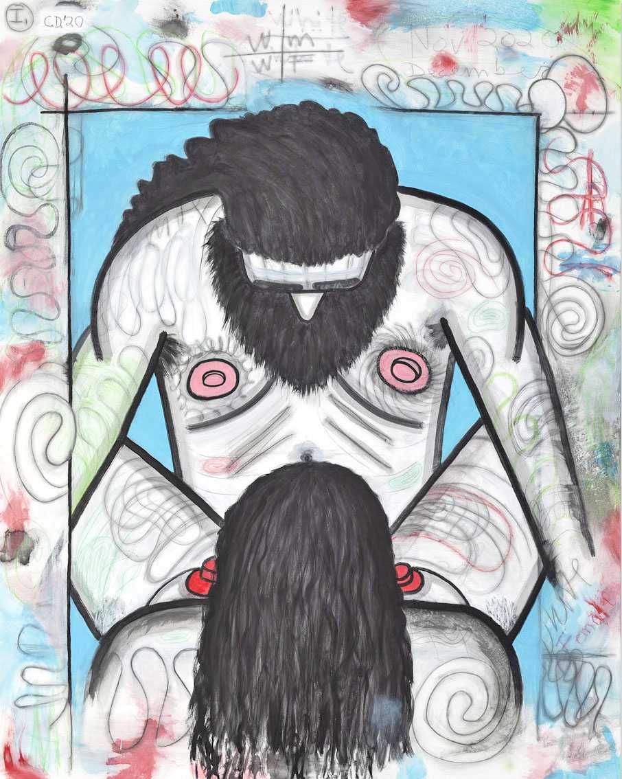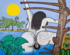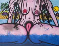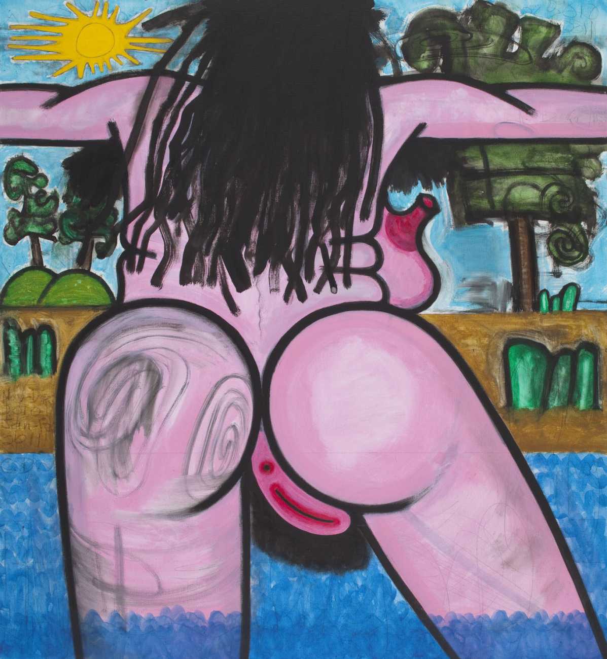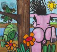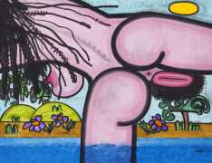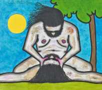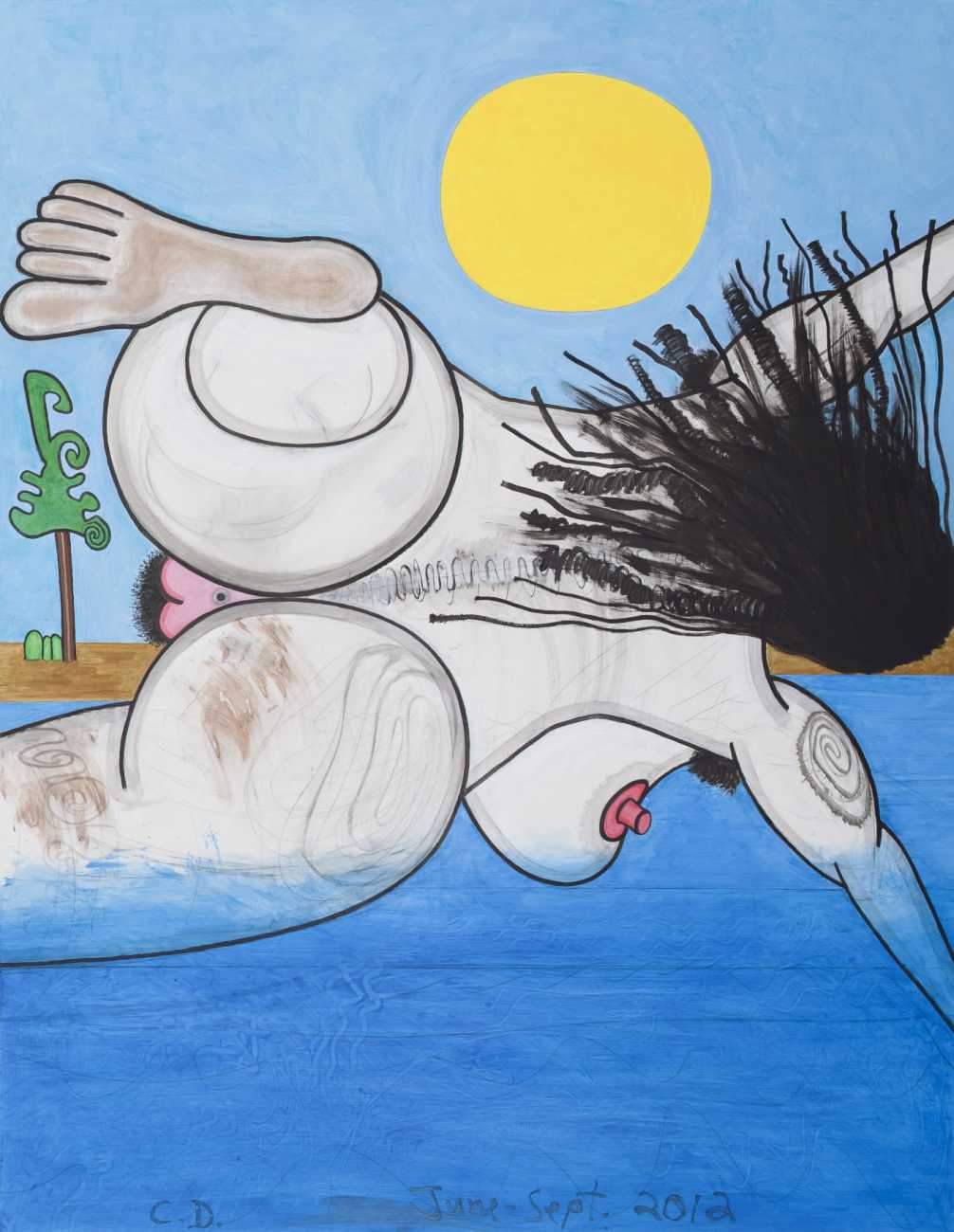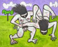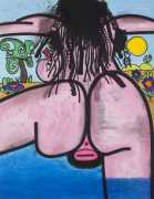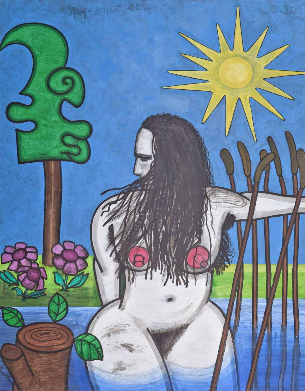 As Naomi Fry writes in a New Yorker article which you can read in full here, ‘There is something enigmatic about Carroll Dunham’s work, even though the painterly vocabulary he employs appears to be straightforward. Using bold planes of colour and almost cartoonish outlines, Dunham often depicts naked human figures in imagined natural landscapes, populated with naïvely rendered trees and birds, dogs and flowers. In his paintings and drawings of heavy-breasted, thick-thighed women bathing, or of hirsute men wrestling one another, Dunham allows the viewer to encounter life in vivid, animated action. And yet there is a palpable opacity to his subjects. Who are these half-biblical, half-science-fictional figures, with their button-like nipples and dark tufts of pubic hair, their bodies splayed jarringly against an indifferently cheerful landscape? What is the purpose and meaning of the obscure rituals that Dunham paints these characters engaging in, with their eyes averted from the viewer, as if reluctant to have their private customs disturbed or even looked at?’