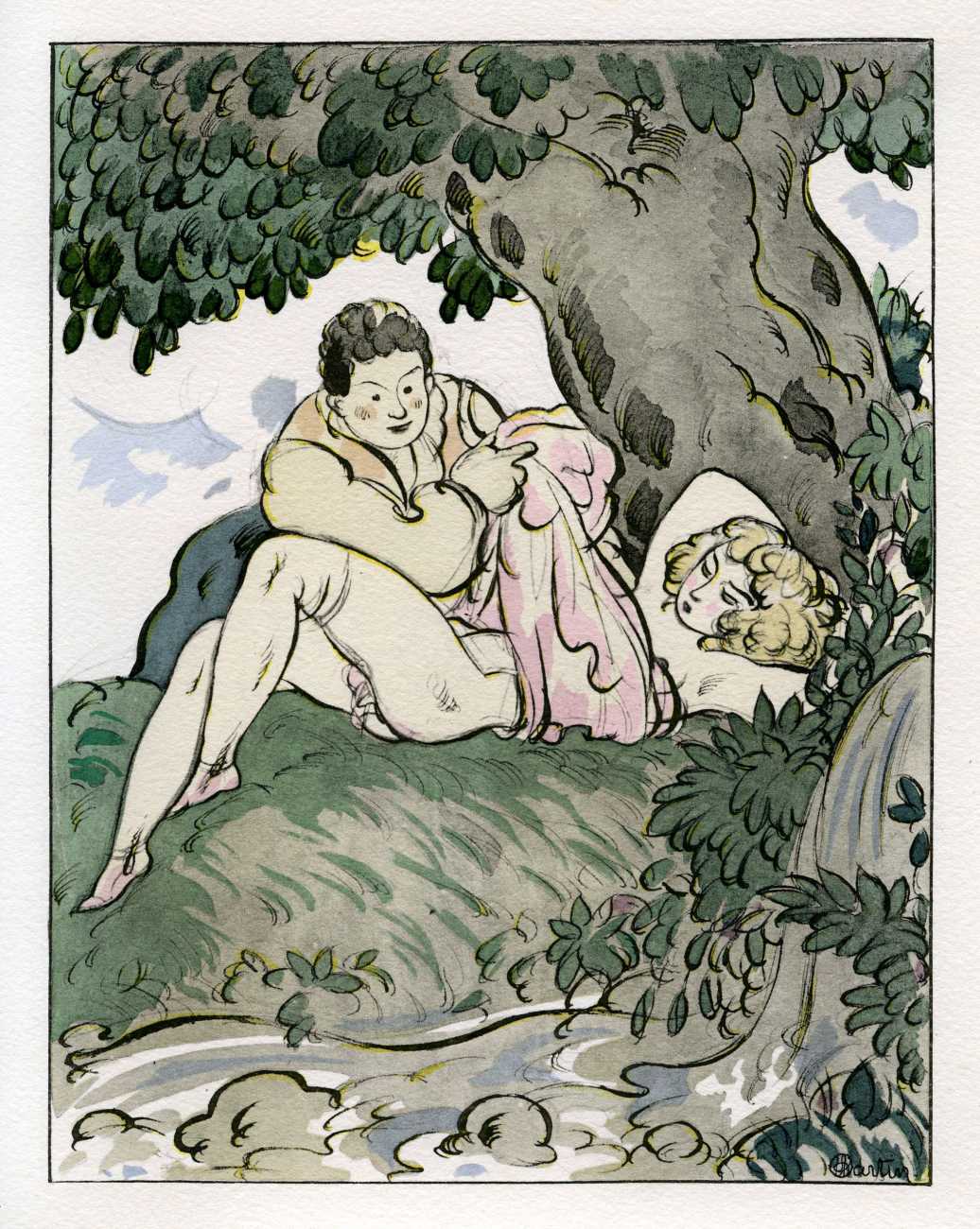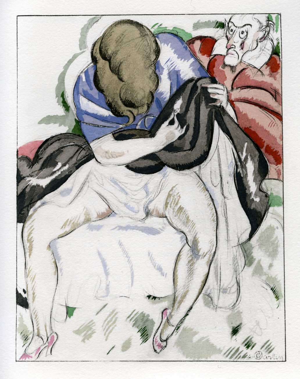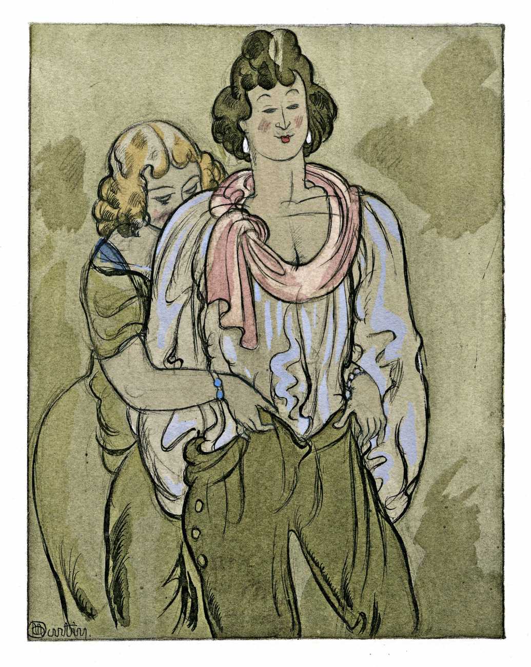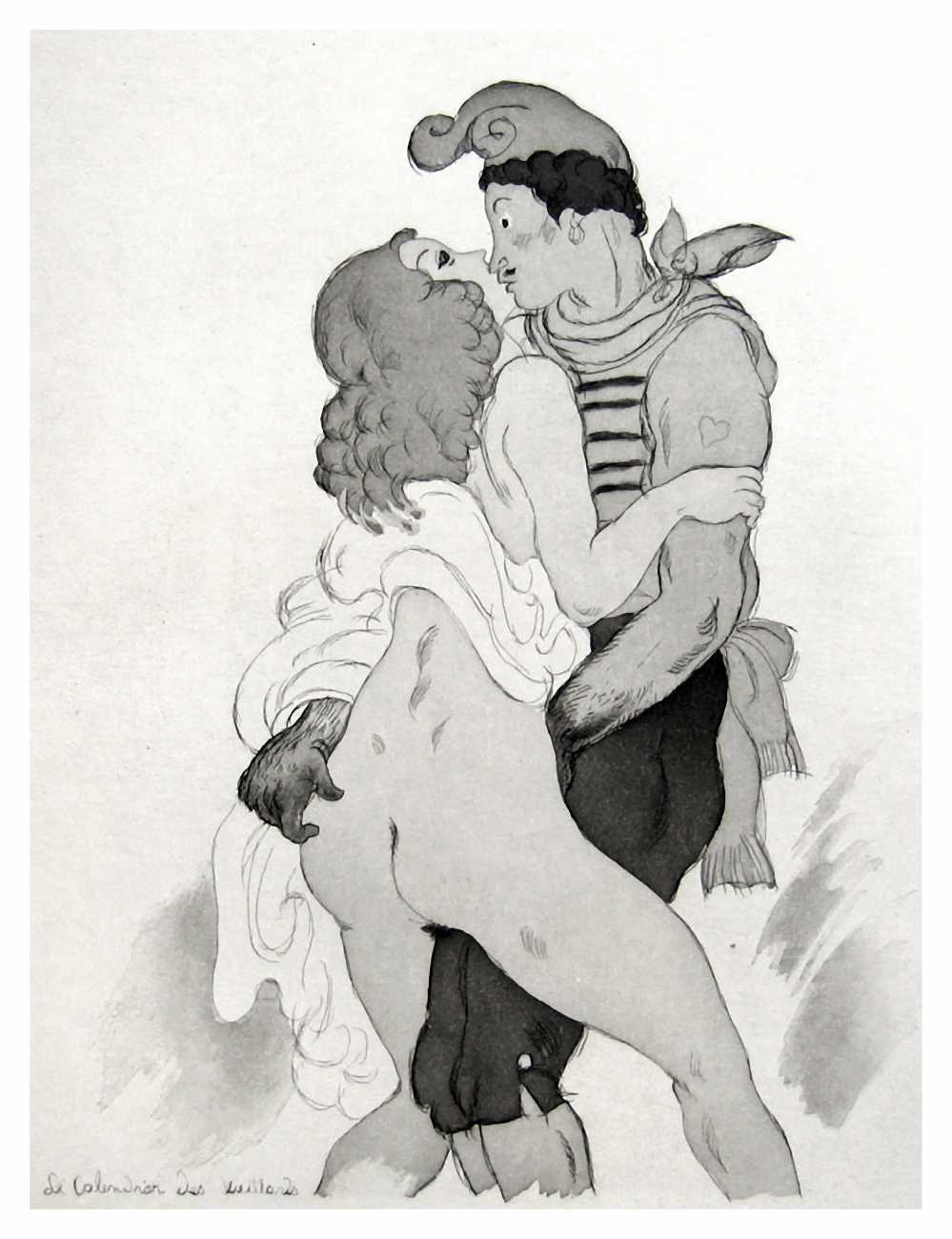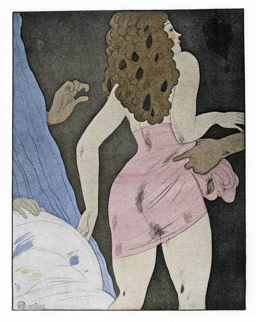As he developed his Art Deco style, concentrating on clean lines and bold colour, an interest in sexual roles and encounters led to the iconic portfolio Mascarades et amusettes, and to commissions from major Paris publishing houses to illustrate classics including Prosper Merimée’s Carmen, Henri de Regnier’s L’illusion héroïque de Tito Bassi, Charles de Montesquieu’s Lettres Persanes, and La Fontaine’s Contes et nouvelles.
