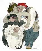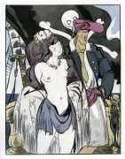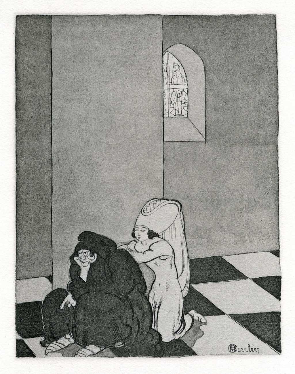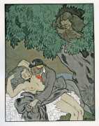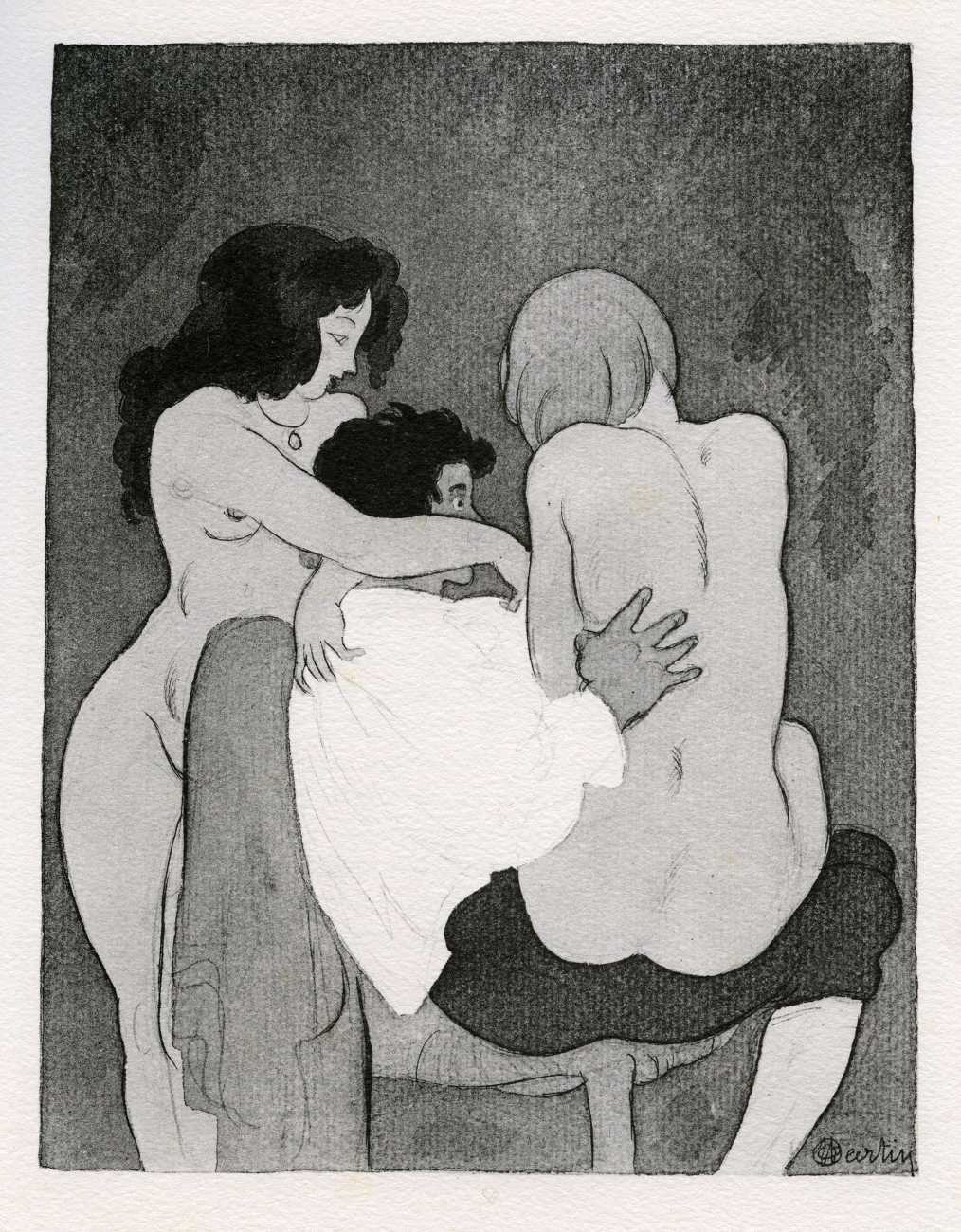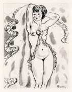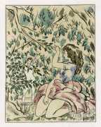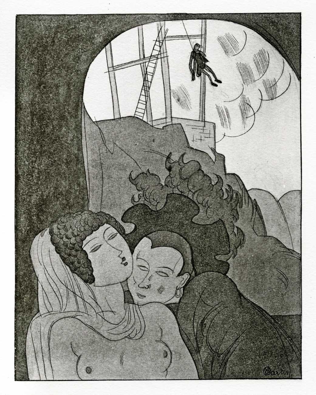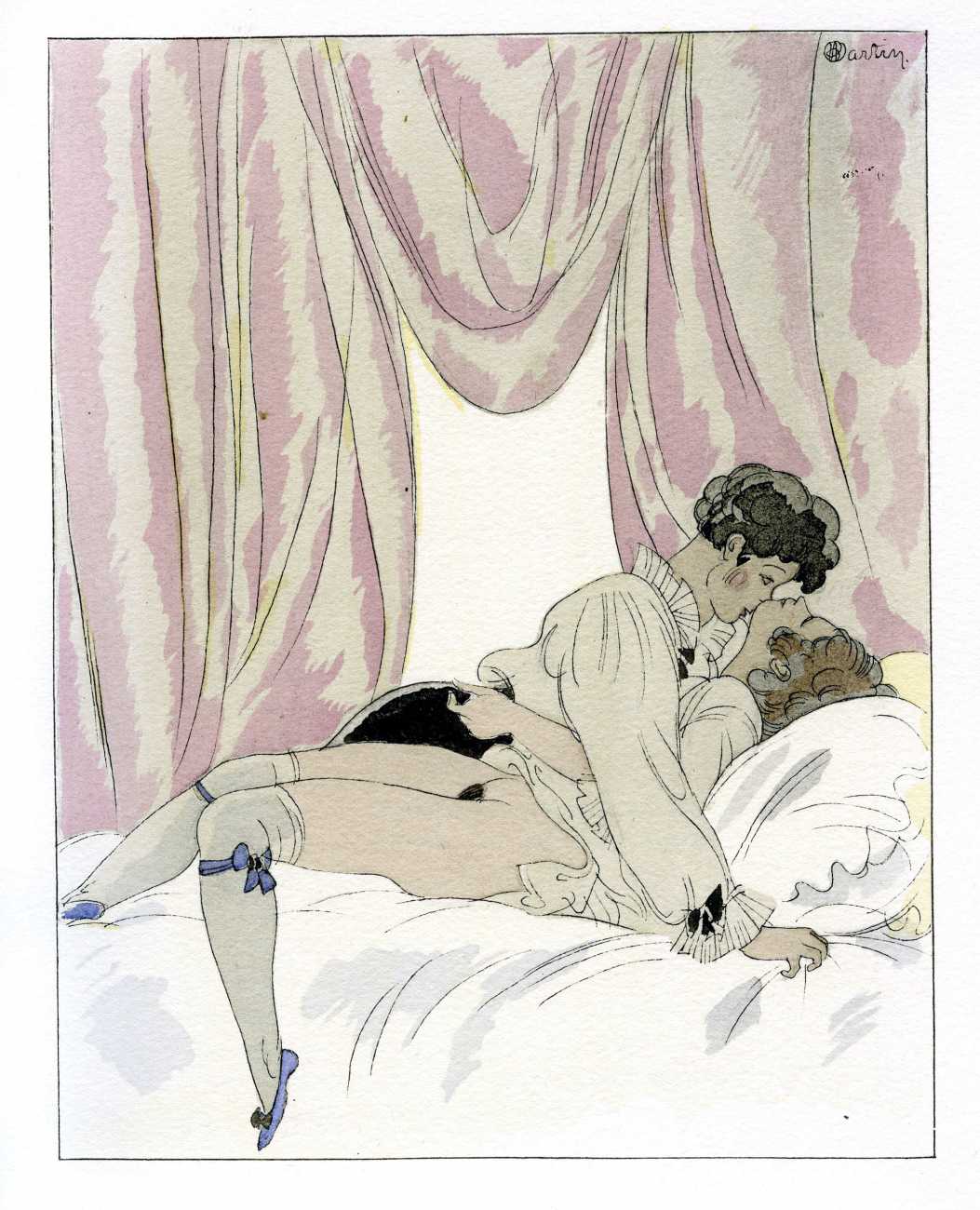 As he developed his Art Deco style, concentrating on clean lines and bold colour, an interest in sexual roles and encounters led to the iconic portfolio Mascarades et amusettes, and to commissions from major Paris publishing houses to illustrate classics including Prosper Merimée’s Carmen, Henri de Regnier’s L’illusion héroïque de Tito Bassi, Charles de Montesquieu’s Lettres Persanes, and La Fontaine’s Contes et nouvelles.