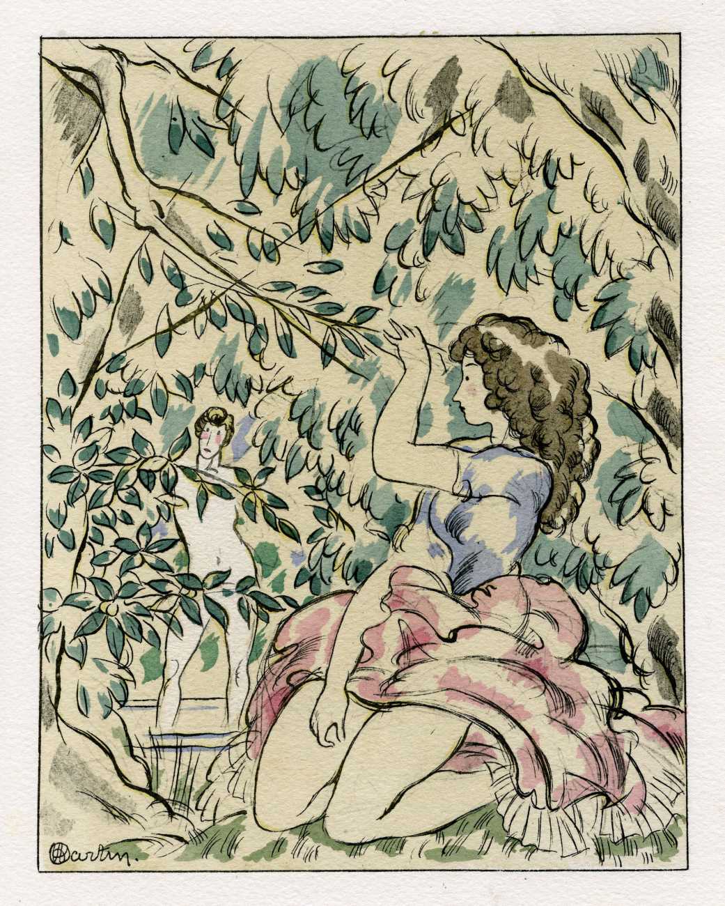 On leaving art school he quickly found work with the leading fashion magazines, including the Gazette du Bon Ton, Modes et Manieres d’Aujourd’hui, La Vie Parisienne, Journal Des Dames et Des Modes, and Vogue. He also contributed illustrations to the American magazines Harper’s Bazaar and Vanity Fair. His circle of friends included the artists Gabriel Daragnès and Roger Lacourière, the writer Pierre Mac Orlan, and the composer Erik Satie; in 1919 he collaborated with Satie on an illustrated musical score entitled Sports et Divertissements.