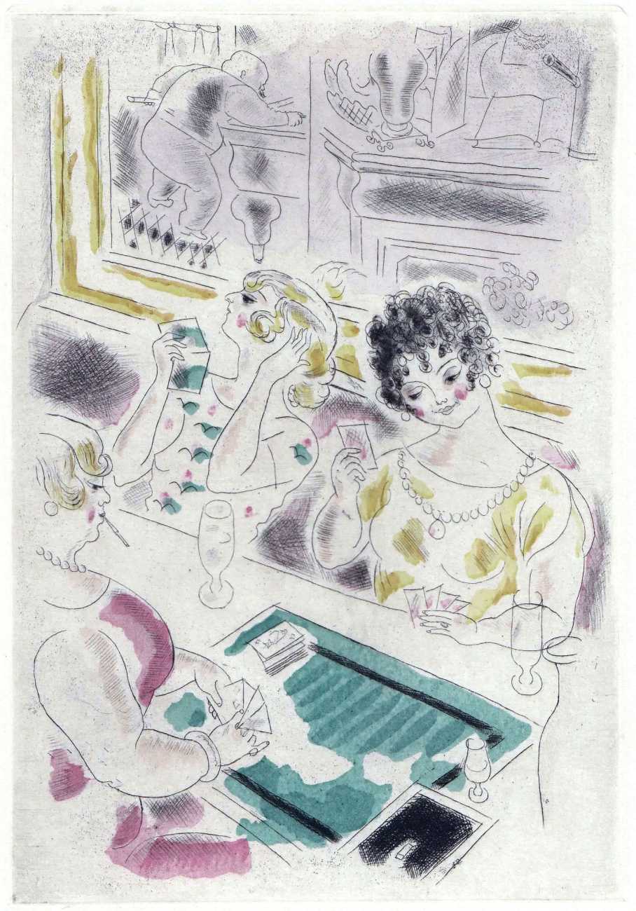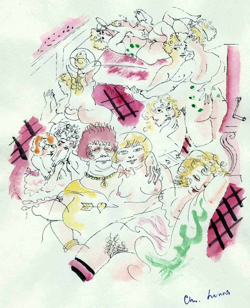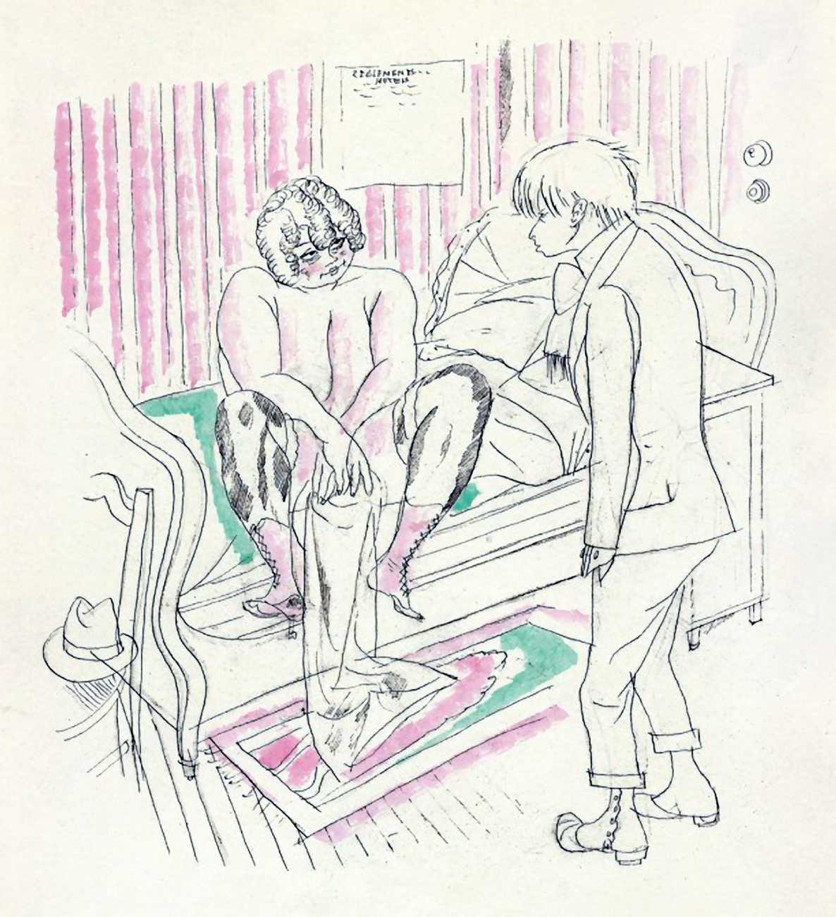 At twenty-one Laborde chose to become a French citizen, and when the First World War broke out he volunteered for the army; his war ended after a gas attack in the spring of 1917. When the war ended Laborde continued to work for satirical magazines. Contributing to Le Rire Rouge and La Baïonnette, his speciality was drawing the prostitutes and brothels of Montmartre. ‘L’amie des filles’ as Carco called him, Laborde often went out of his way to help these young women, acting as witness in their defence in court, lending them money and paying their debts. When Bofa established Le Salon de l’Araignée (The Spider’s Parlour) in 1920 to support graphic artists who had fought in the war, he arranged for Laborde’s drawings to be exhibited, and the newly-established publishing house La Banderole opened the door to book illustration. In 1921 he was commissioned to illustrate Le Chat Maigre (The Scrawny Cat) by Anatole France, who had just been awarded the Nobel Prize.