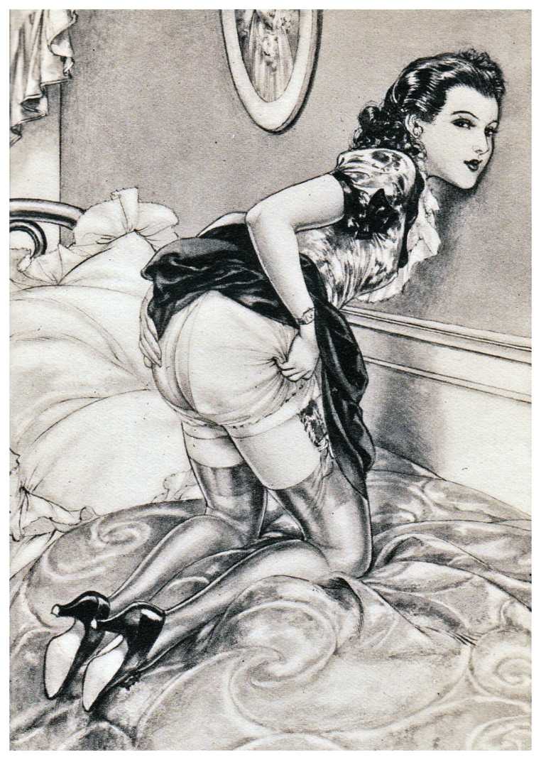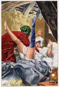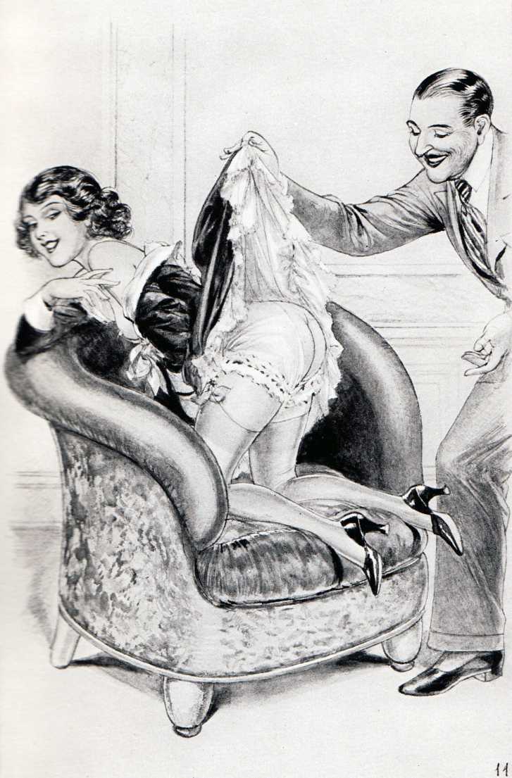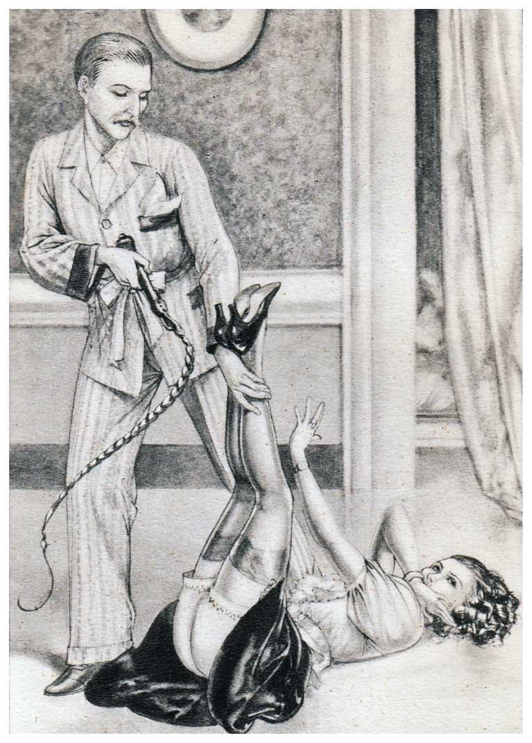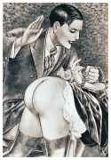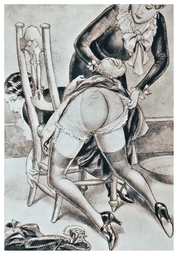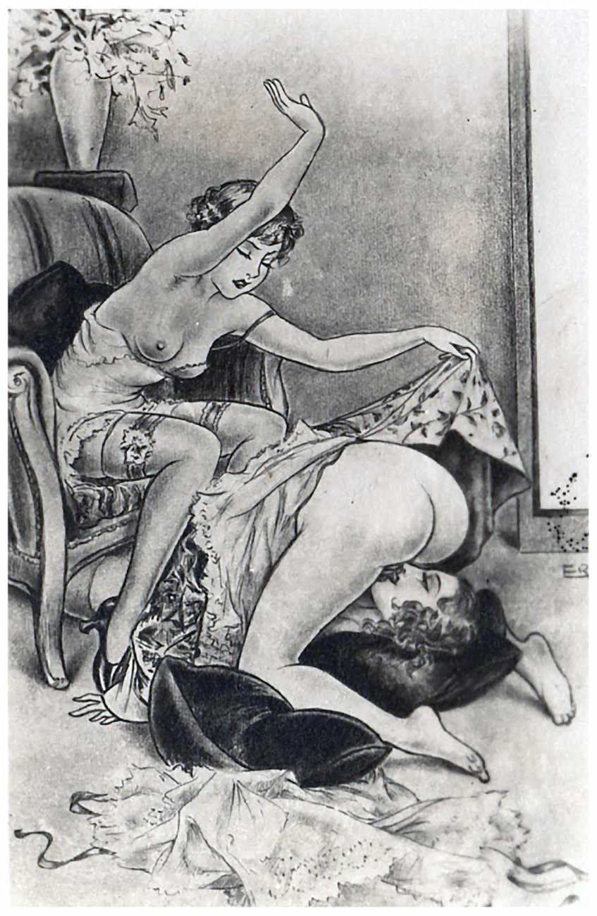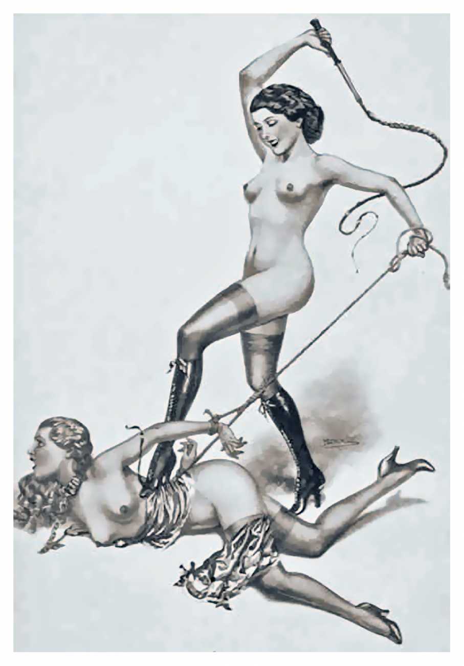 Best known for his forty-five years’ distinctive art nouveau work for the French society magazine La vie Parisienne, Chéri Hérouard earns his place here as his doppelganger Herric, the name he used for an impressive number of erotic portfolios in the 1930s, combining the ever-popular themes of spanking and lacy knickers.