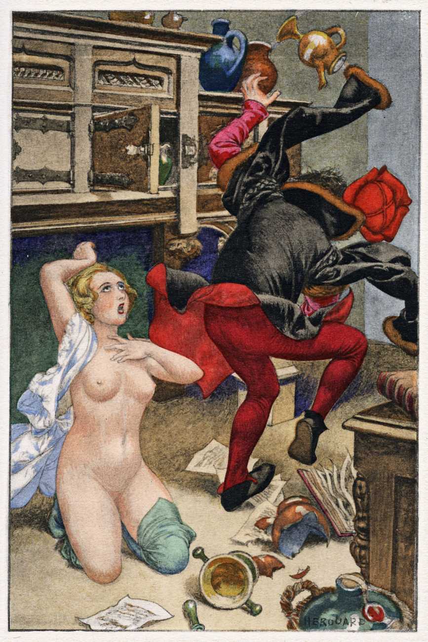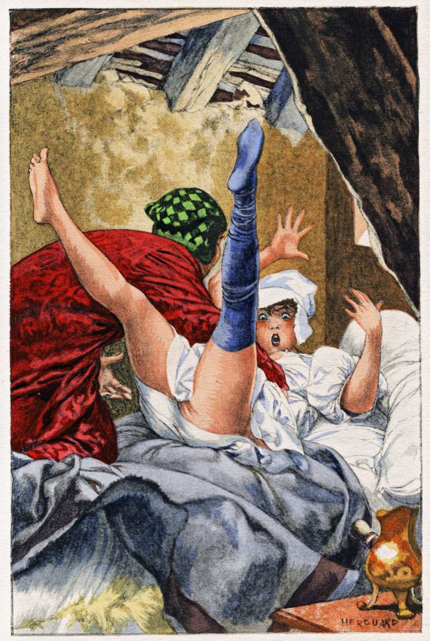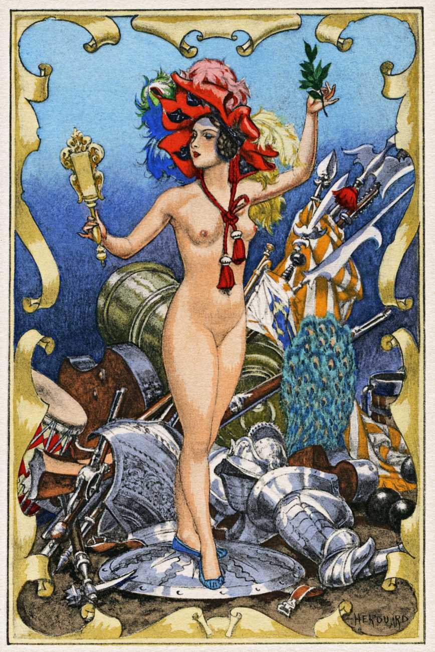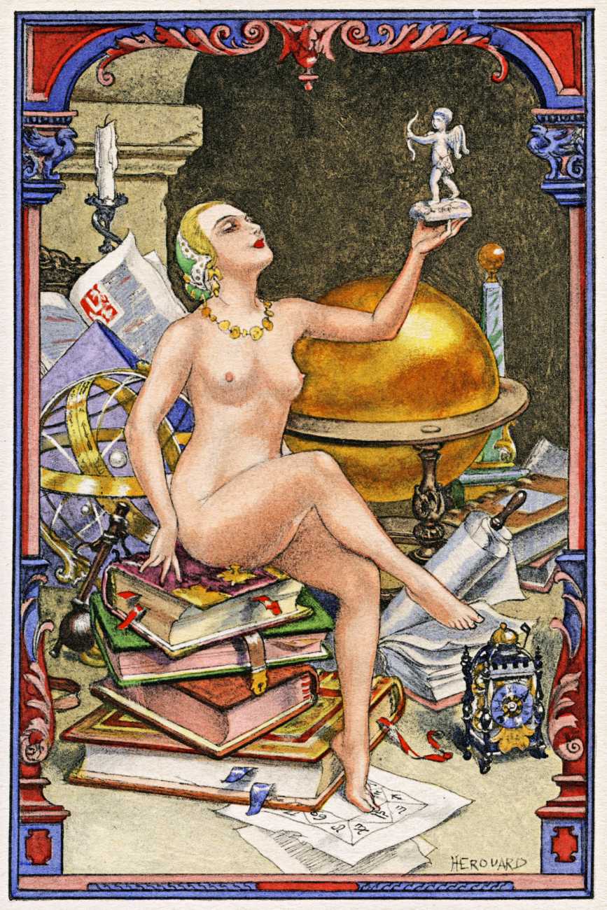 Hérouard was born Chéri-Louis-Marie-Aime Haumé into a well-to-do family in Rocroi in the Ardennes district of France. His father died from a freak riding accident just days before his birth, and his mother remarried into the Hérouard family, from whom Chéri took his surname. His mother and stepfather thought Chéri was best suited for a career in the military, but their son had a very different idea – he wanted to be an artist. He submitted a portfolio of his work to the magazine Le Journal de la Jeunesse; the editor was so impressed by Hérouard’s draughtsmanship that he bought a selection of drawings, which were published in the magazine in 1902. Like most of his work, these drawings mixed fantasy and fetishism, and his distinctive style soon led to his being hired in 1907 as one of the main artists supplying work for the hugely popular magazine La Vie Parisienne.