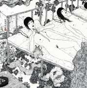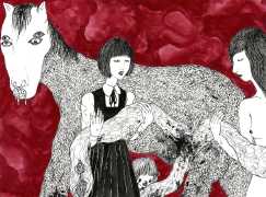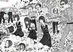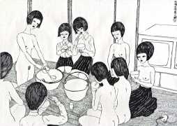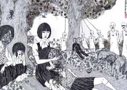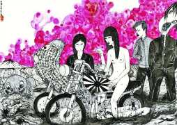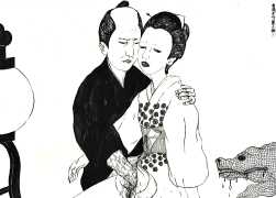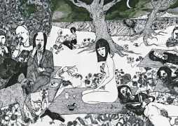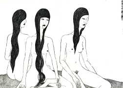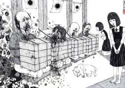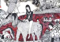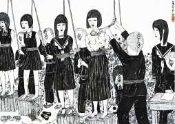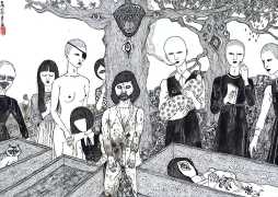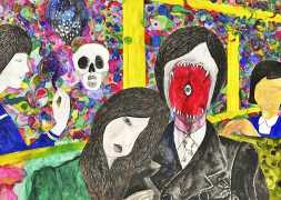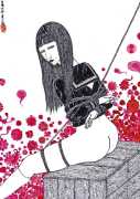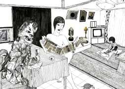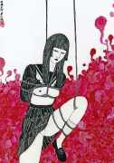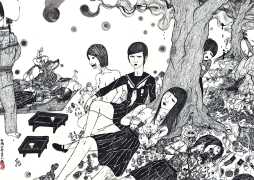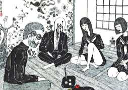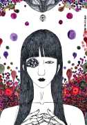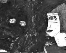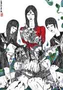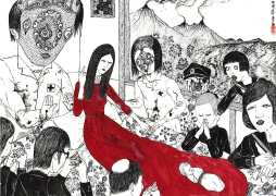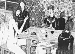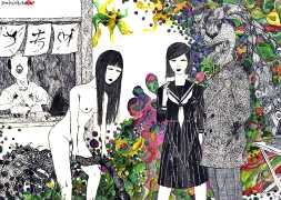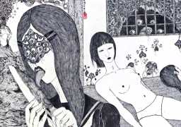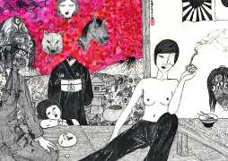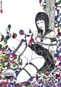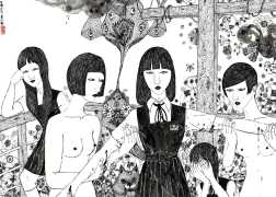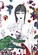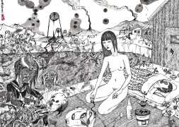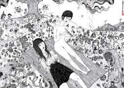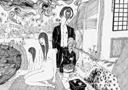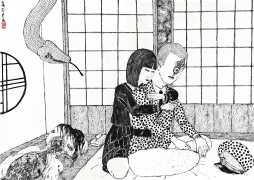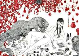 By mixing manga and print, Ichiba’s universe straddles hallucinatory nightmare, madness and eroticism, creating a fantastic and chaotic universe where humans transform into strange animalistic beings with grotesque features and faces. The sparing use of colour helps accentuate the detail in his drawings.