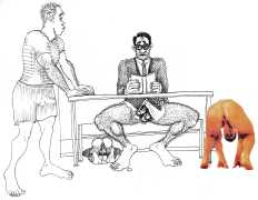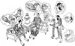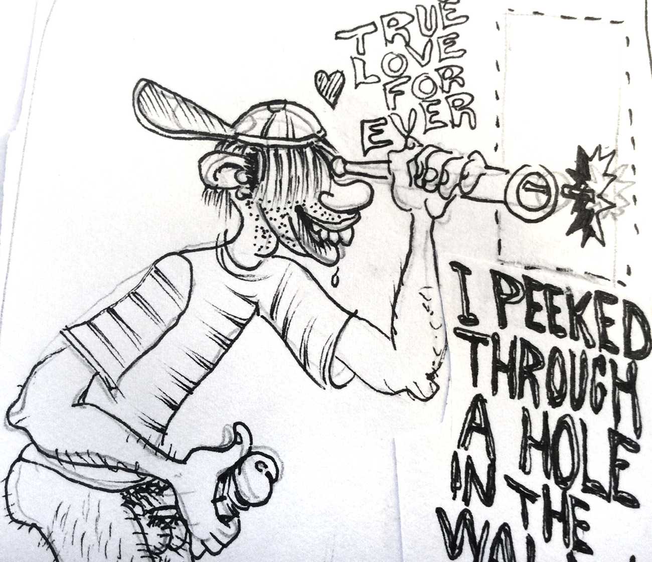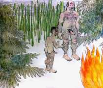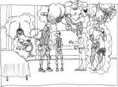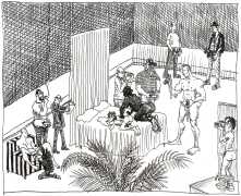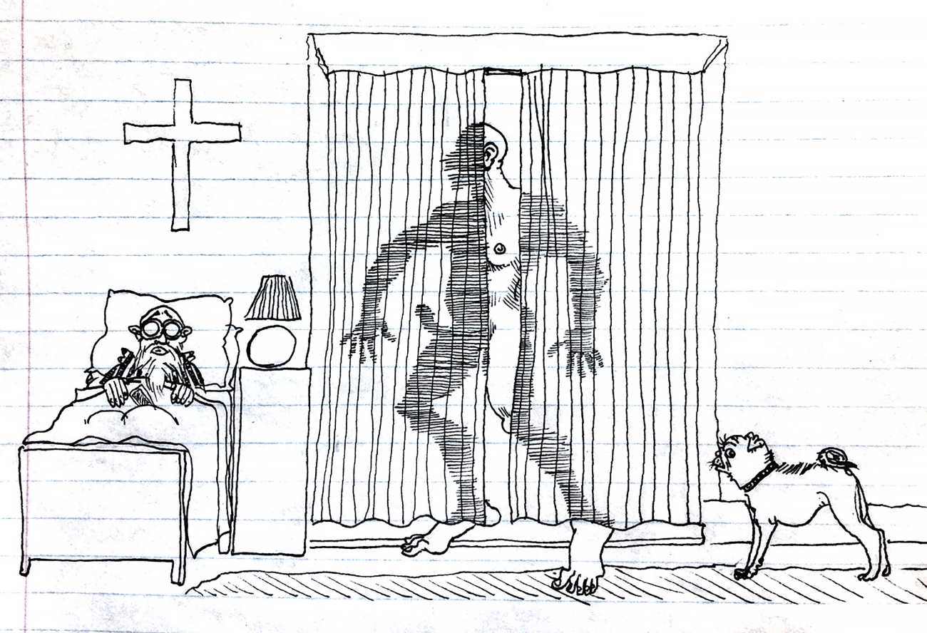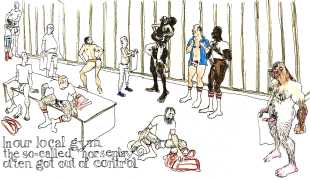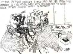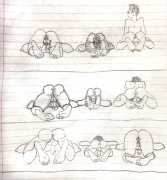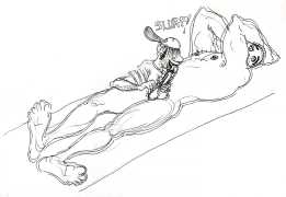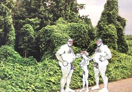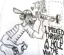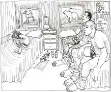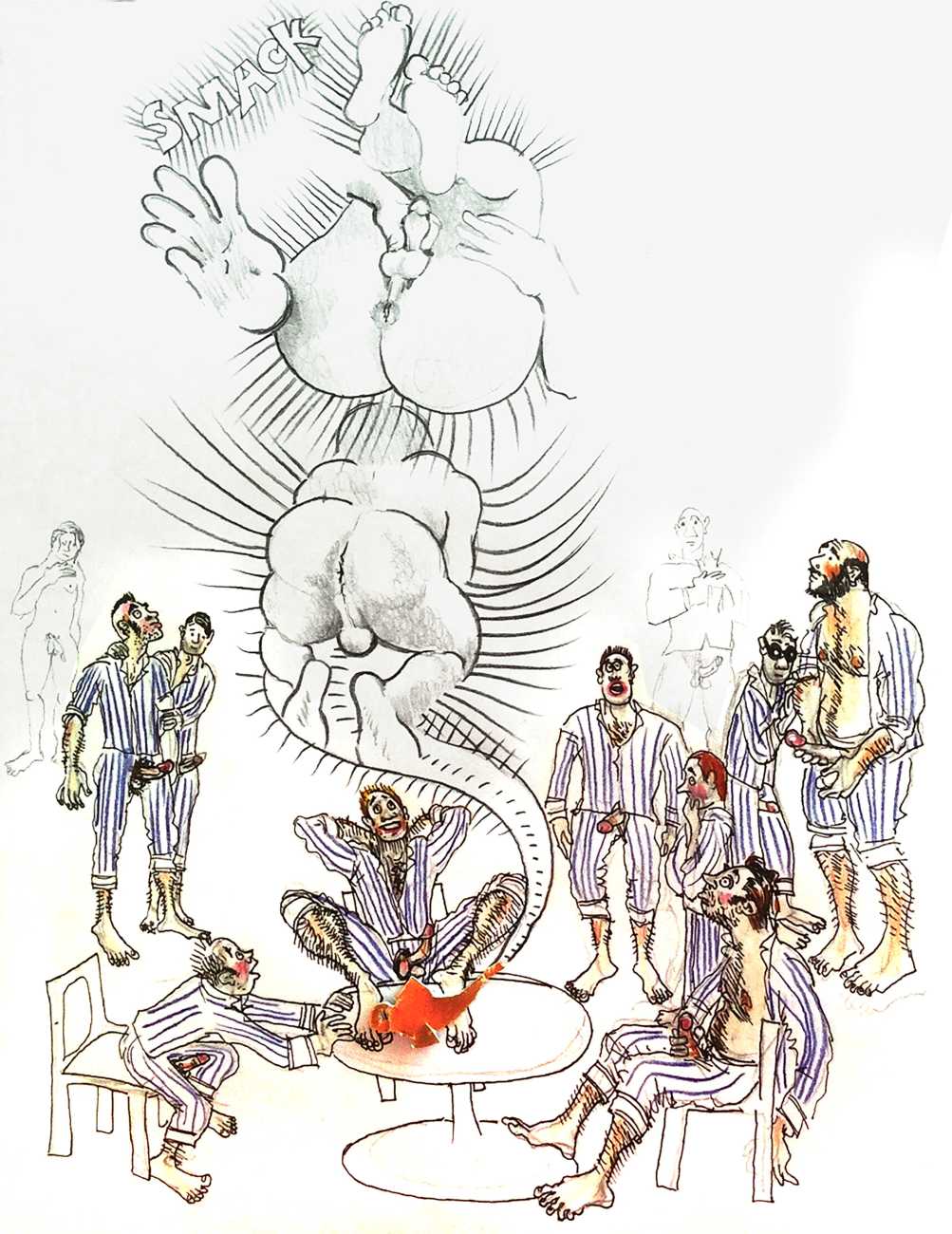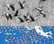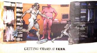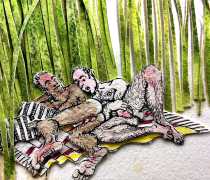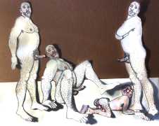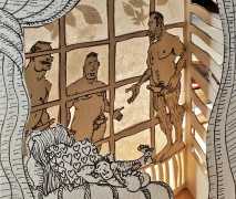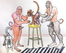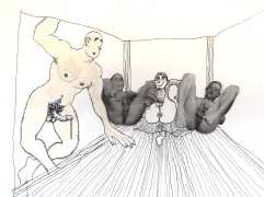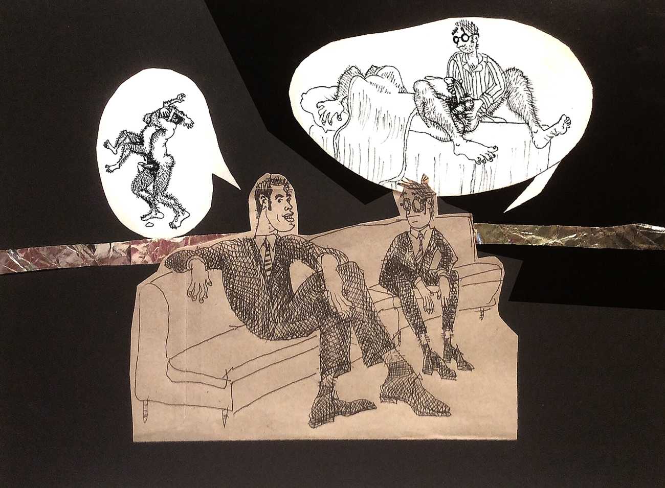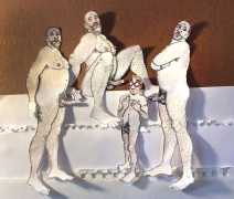 Doug Melnyk often works in collaboration with other artists and performers. Since 2009 he has cooperated with Ian Mozdzen on performance works including Monopoly Man Pit, Dalnavert Copperfield, Hollywood Hen Pit, and Nippon Maru, an animated video derived from Melnyk’s drawings, silkscreens and cut-paper work, telling the story of a cruise ship that flounders and sinks in tropical waters. As he explains, ‘I have often worked with artists from differing disciplines. Along with other collaborators, Ian and I performed in the first Winnipeg Fringe Festival with Gorilla (Jack and Alexis Butler, John McCulloch, Maggie Nagle, Cathy Nosaty and Martha Little), subsequently performing at the Edinburgh Fringe, Covent Garden, London Ontario, and Regina among other places. Our creative group consisted of artists with backgrounds in visual art, writing, acting, photography, and. Our range of references was diverse and eclectic, as was the language we used to communicate with each other.’