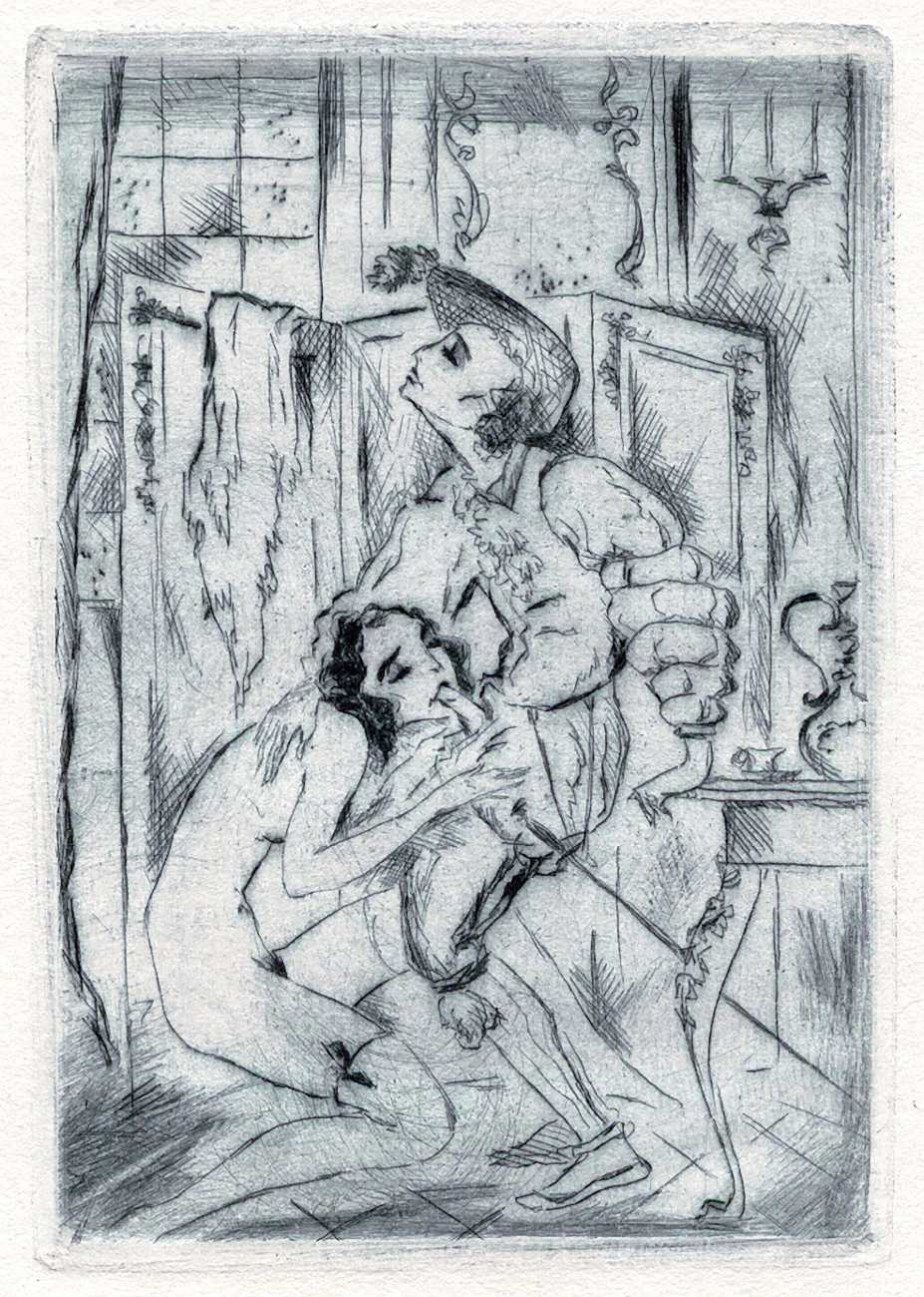 ‘E. Bénis’ is one of those many 1920s amateur erotic artists whose identity is hidden behind a pseudonym, and who have consequently virtually disappeared from history. Just four portfolios from the early 1920s are known – Aventures d’un Bohémien (Adventures of a Bohemian), Die Halbjungfrau (The Semi-Virgin), Erlebnisse eines 16jährigen Mädchens, Wanda (Experiences of a 16-year-old Girl, Wanda), and Lucette und ihre Freunde (Lucette and Her Friends) – and only a handful of the plates bear the Bénis signature. The only way we know that they are all by the same hand is that this artist can only draw two protagonists, a rather sad-looking man with a square chin and an impossibly slim woman with small pointy breasts.