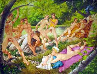 In the mid-1970s he moved to Manhattan in New York, and came out as openly gay, creating a stream of drawings and colourful paintings depicting homoerotic dreams and fantasies featuring young men with six-pack chests, tight buttocks, and mightily swelling cocks. He shared his city apartment with his partner Ken Abel, and as his work gained in popularity managed to survive as an artist, gaining the soubriquet ‘Ed of Manhattan’ among the New York gay scene.